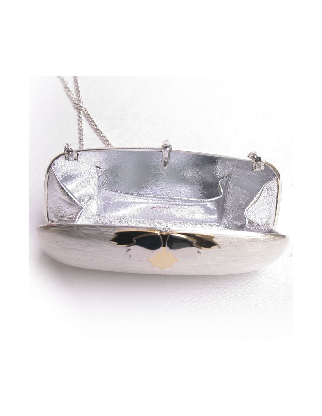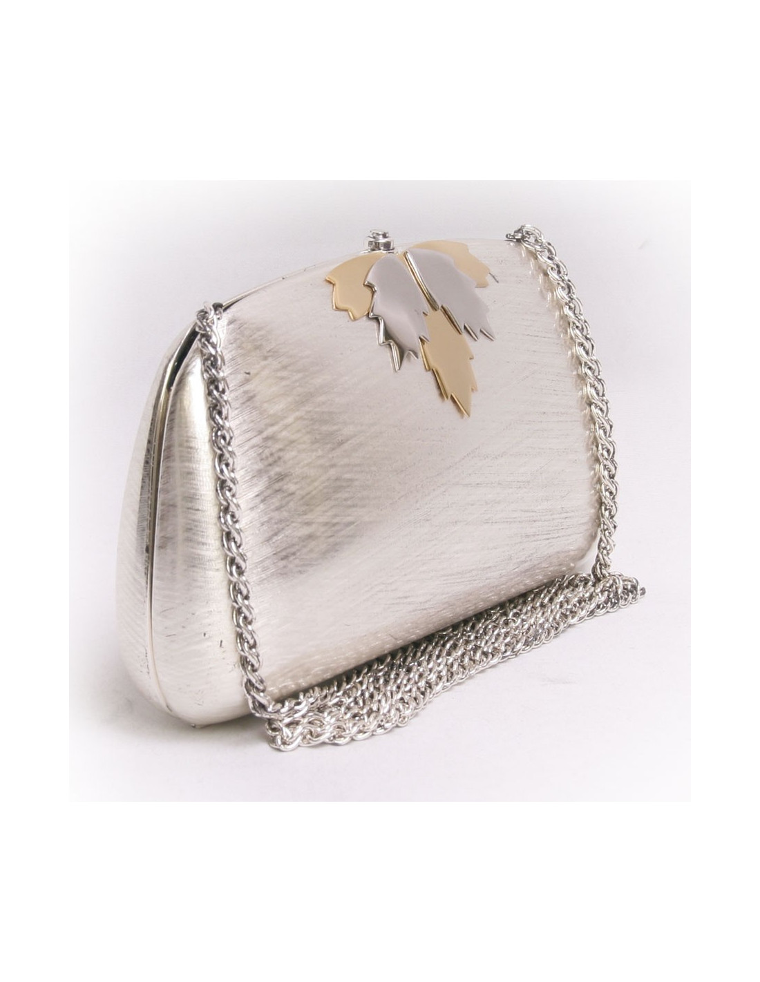 Ravissante minaudière Rodo, en acier argenté, et feuilles d'érable argent et or. Il se porte à la main ou à l'épaule à l'aide d'une bandoulière qui peut se replier à l'intérieur de la pochette. L'intérieur est en tissu argent avec une petite poche plaquée. En très bon état. Quelques marques d'usure en dessous, peu visible.