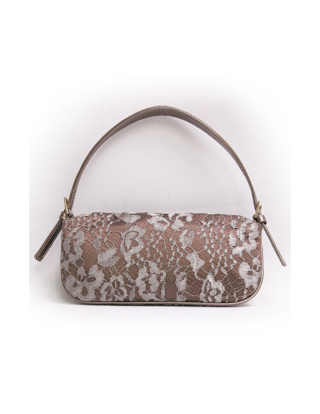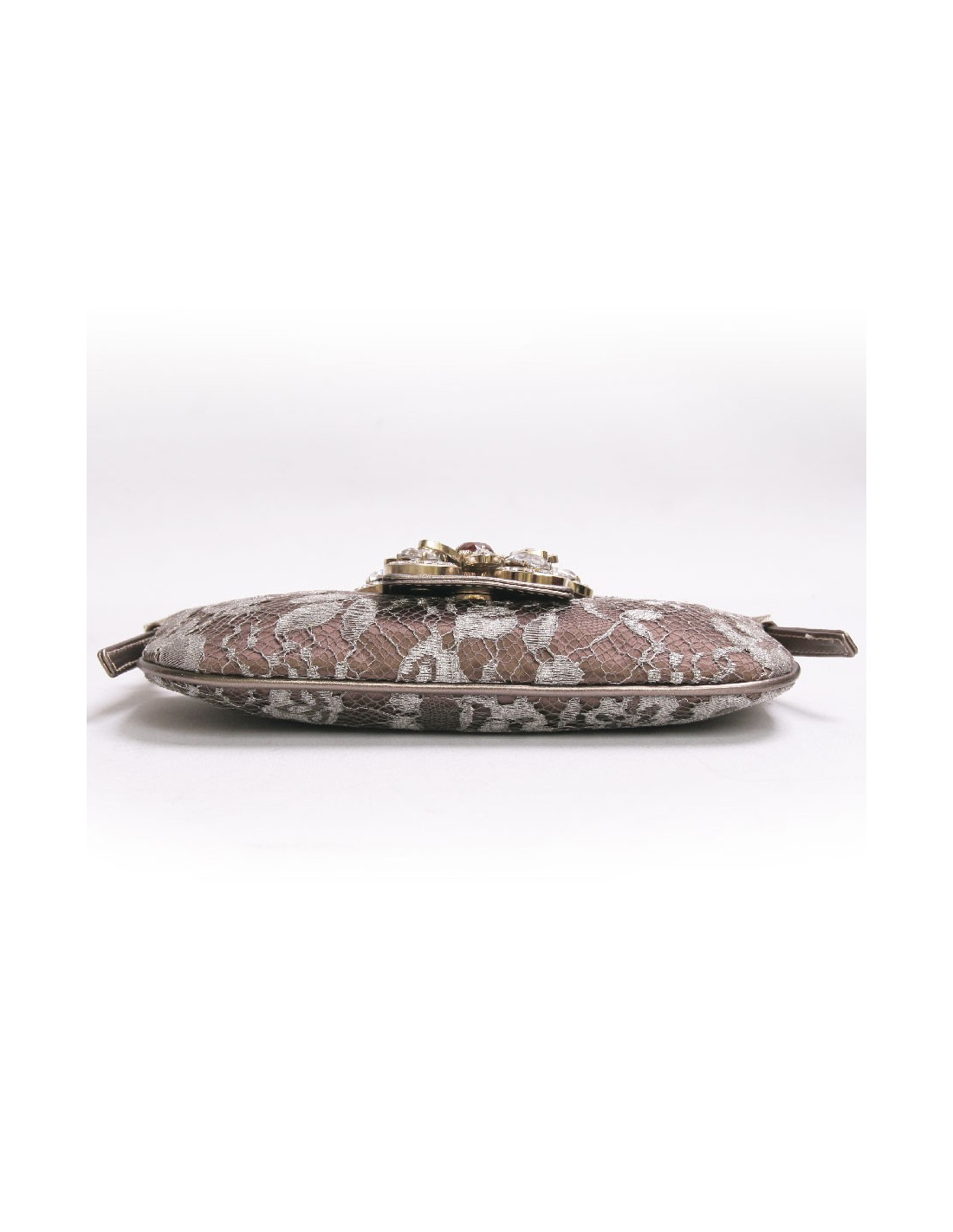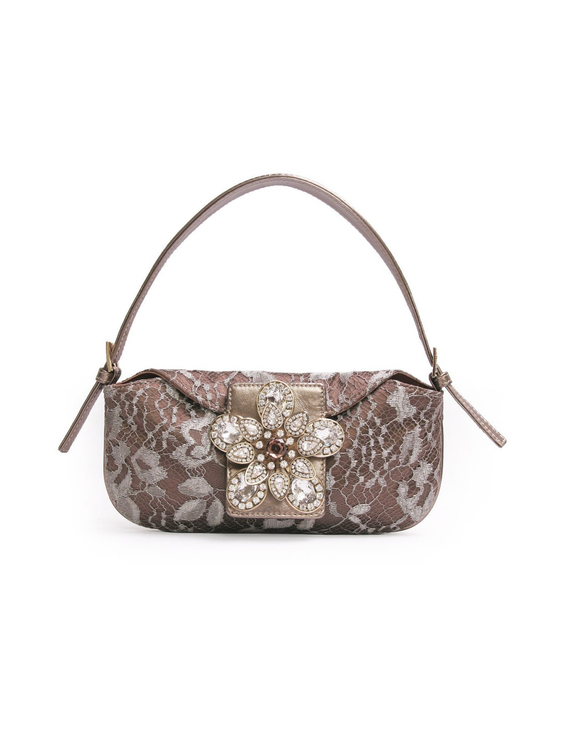 Mini sac du soir Valentino en satin et dentelle bronze. Fermeture par pression. Le fermoir est en forme de fleurs avec des pierres fantaisies. Il se porte au bras ou à l'épaule à l'aide d'une anse réglable et amovile en cuir doré.