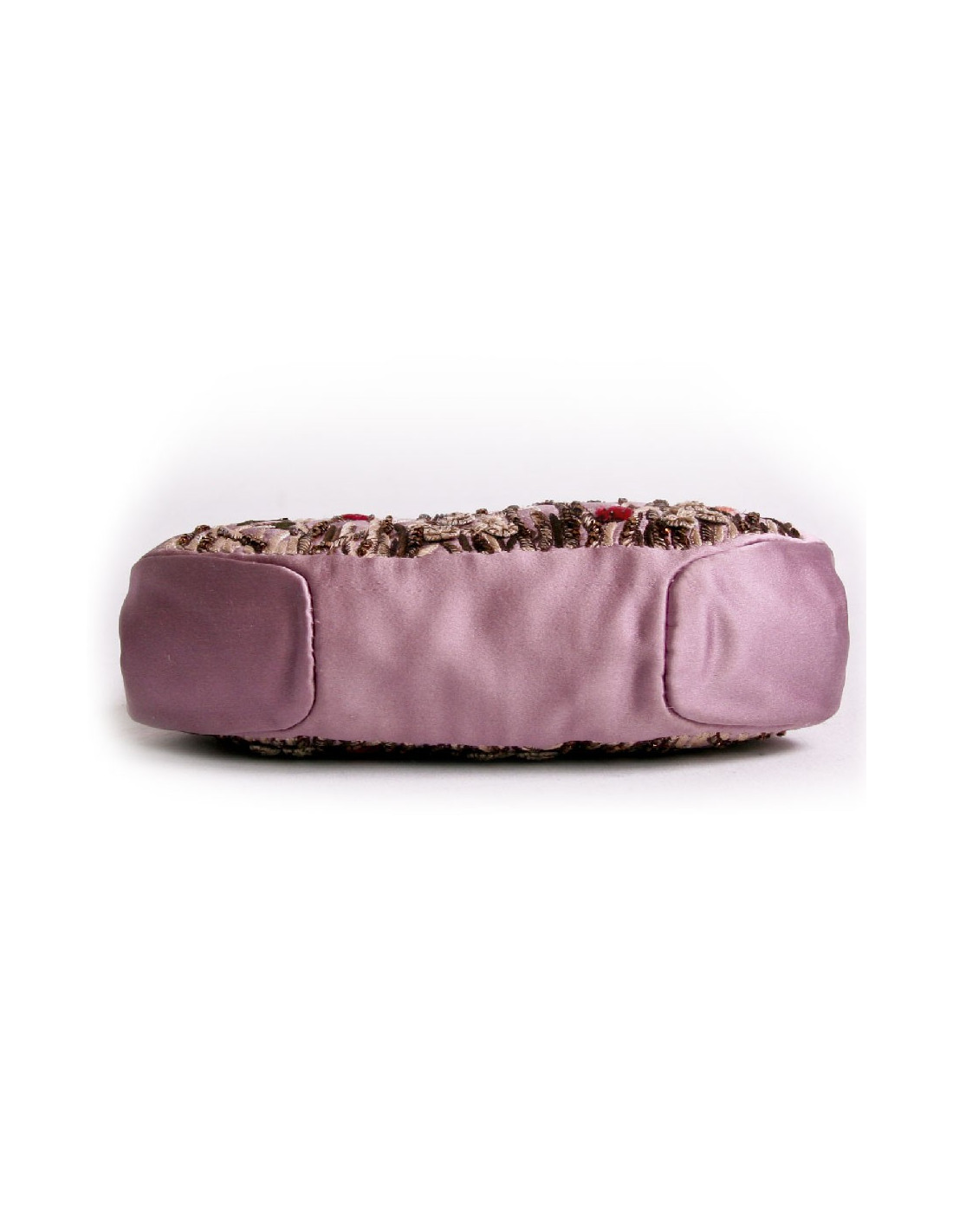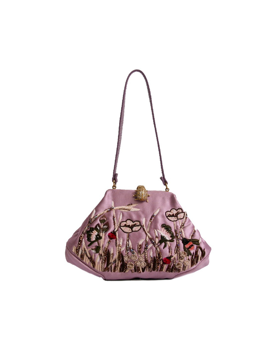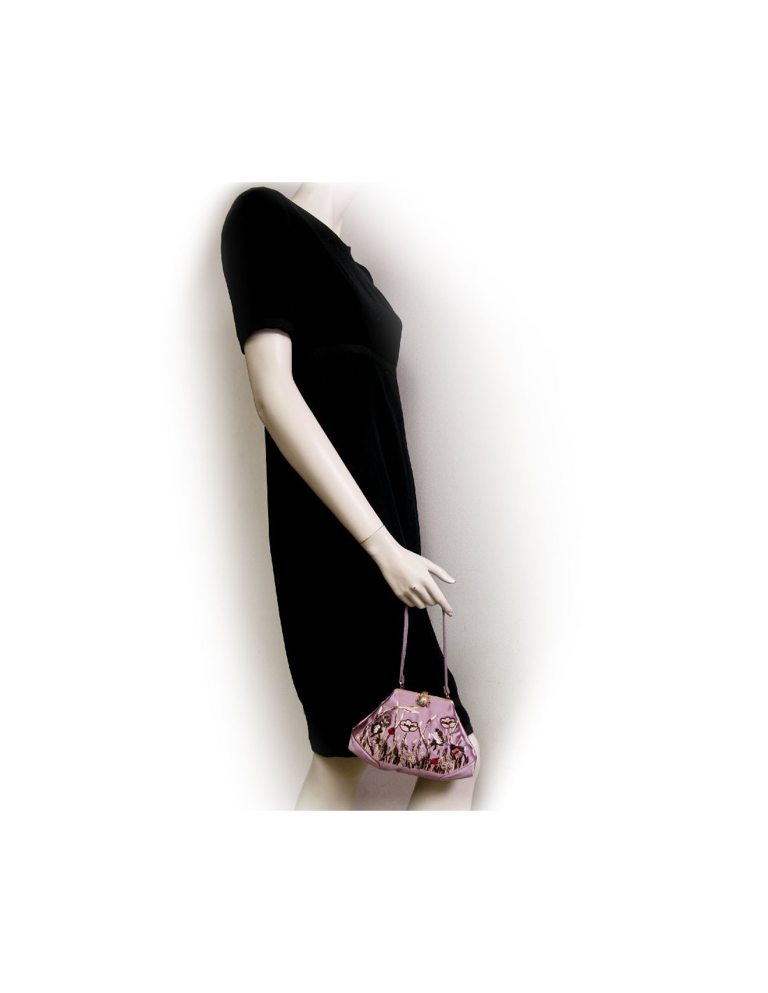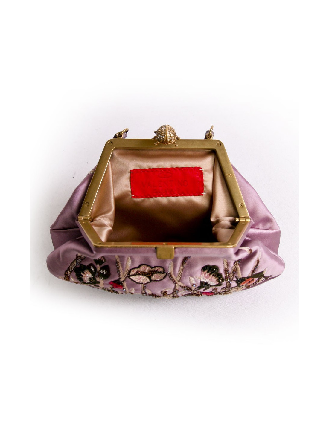 Mini sac du soir Valentino en soie violette et broderies avec des fleurs, coccinelles, abeille ... La bijouterie est en or vieilli. Le fermoir est en forme de coccinelle avec des strass. Il se porte à la main. En très bon état.