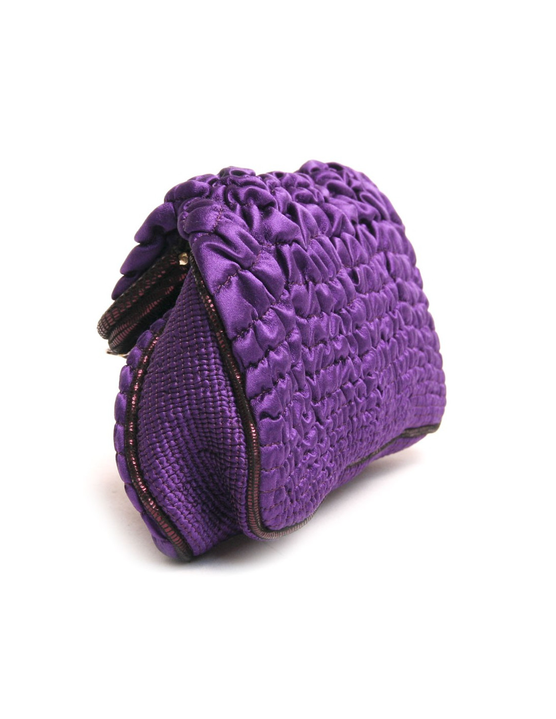 Ravissante pochette en soie à smoke de la Maison Fendi de couleur violette. La bijouterie est en métal doré. L'intérieur est en soie verte avec une petite poche plaquée. Fermeture par bouton pression. Sur le fermoir vous pouvez voir des strass ainsi que le logo "F" à l'endroit et à l'envers pour Fendi en métal argenté et doré. En très bon état.