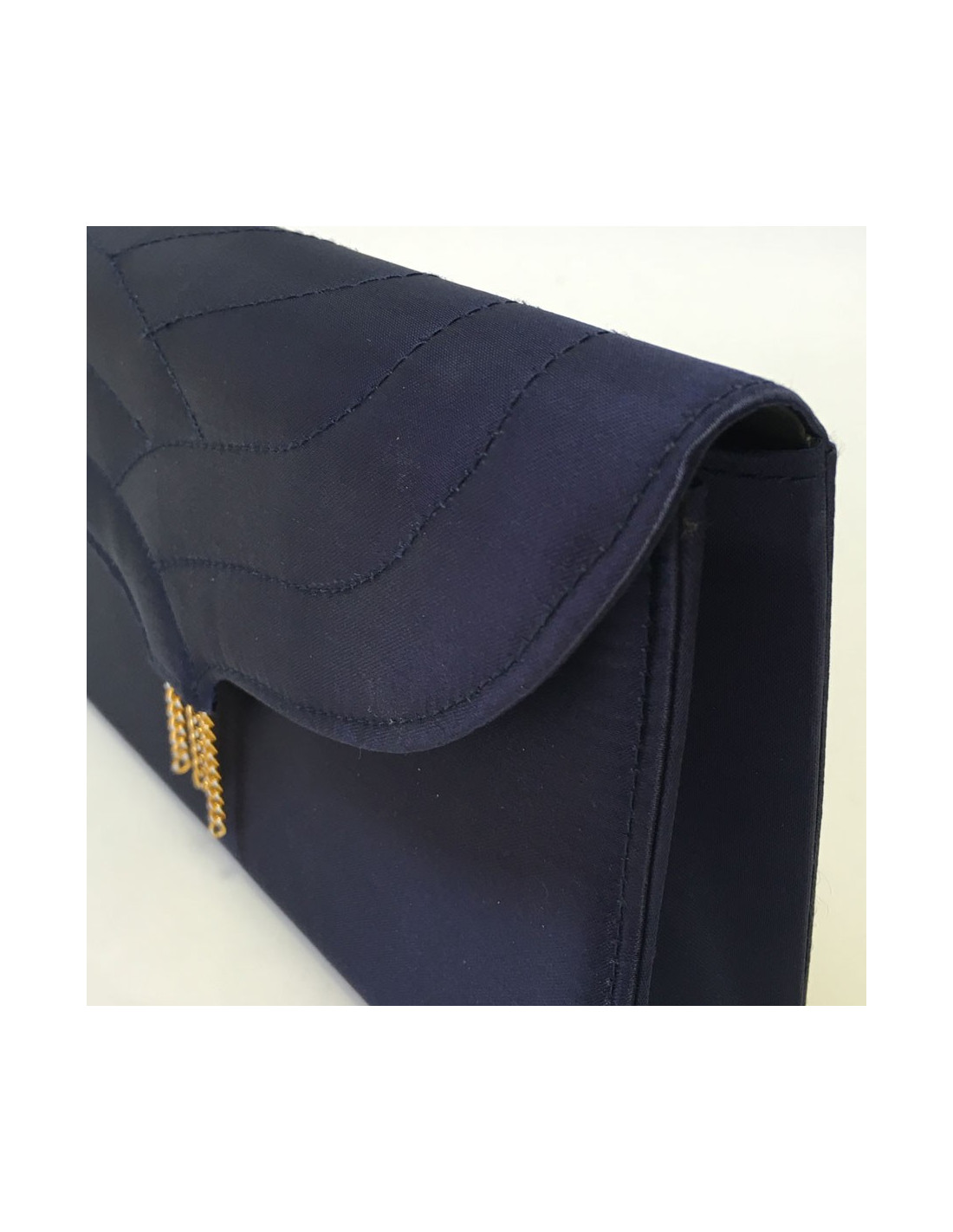 Pochette du soir VAN CLEEF & ARPELS en tissu bleu satiné. Fermoir aimanté avec 3 petites chainettes pendantes. Intérieur en noir satiné, petite pochette élastique sur le côté. Pochette rigide. En parfait état.