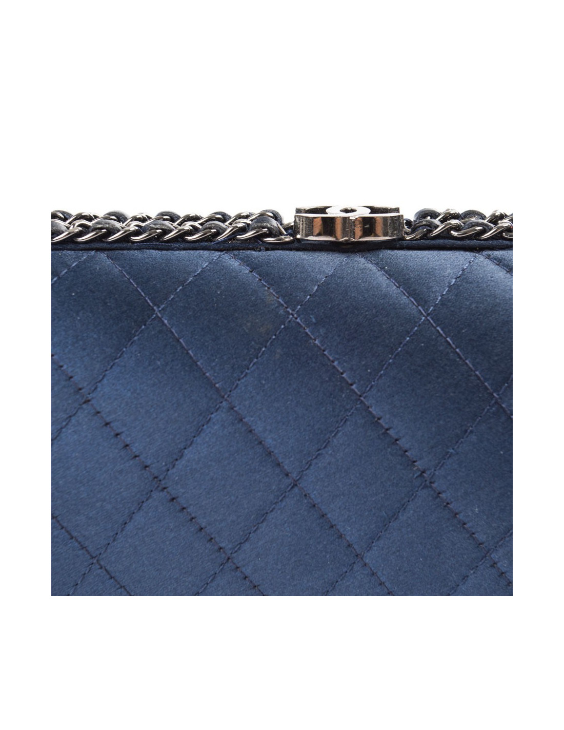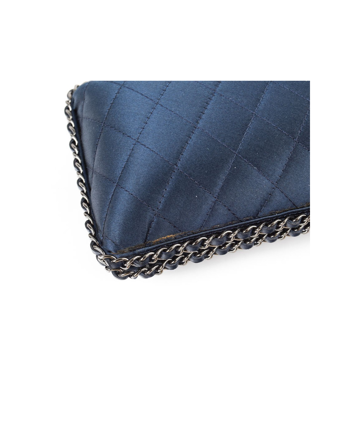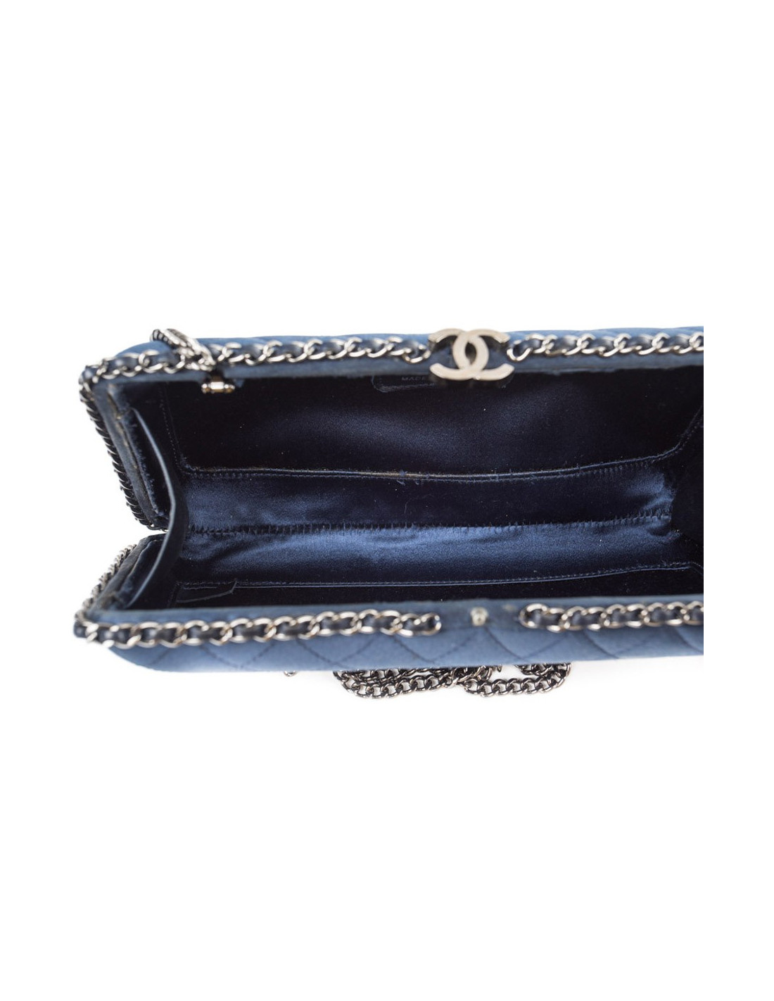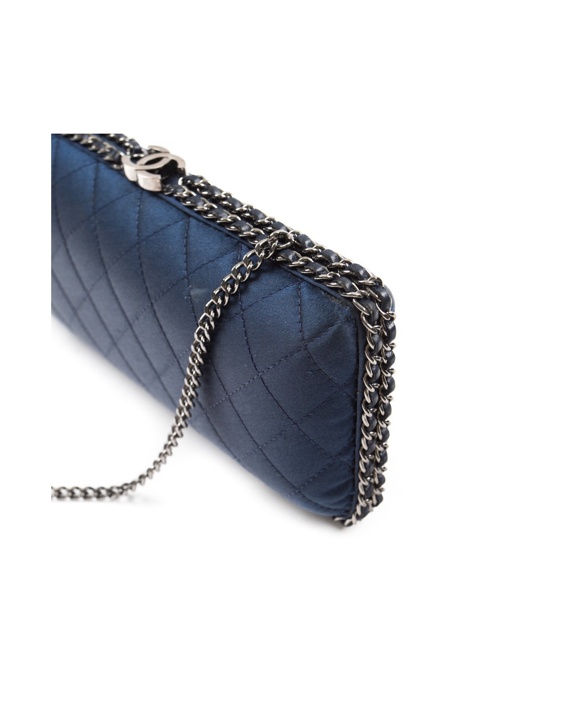 Sac minaudière Chanel en satin de soie bleu nuit. Une chaîne en ruthénium entrelacée de cuir bleu fait le tour de ce sac. Intérieur en soie bleu nuit. Fermoir CC