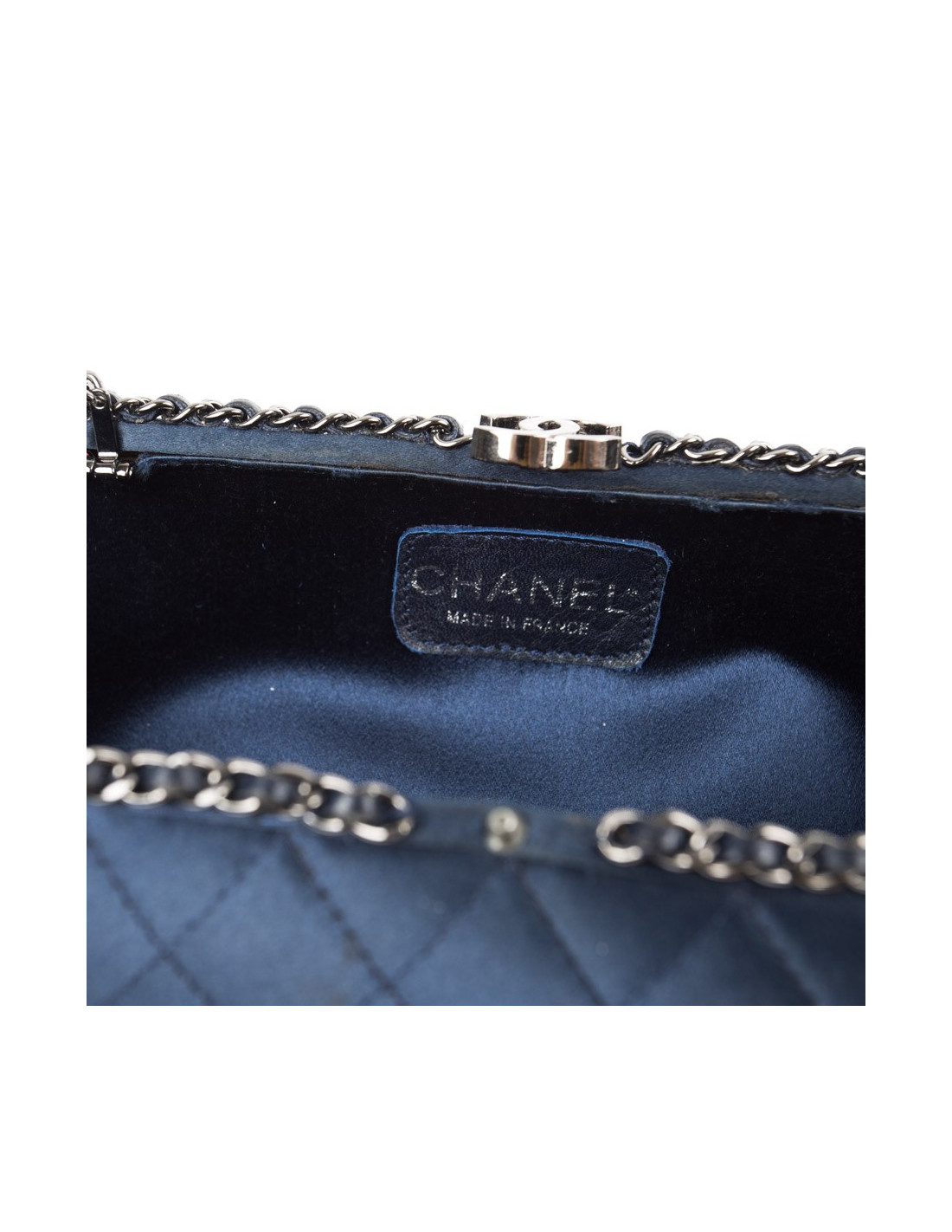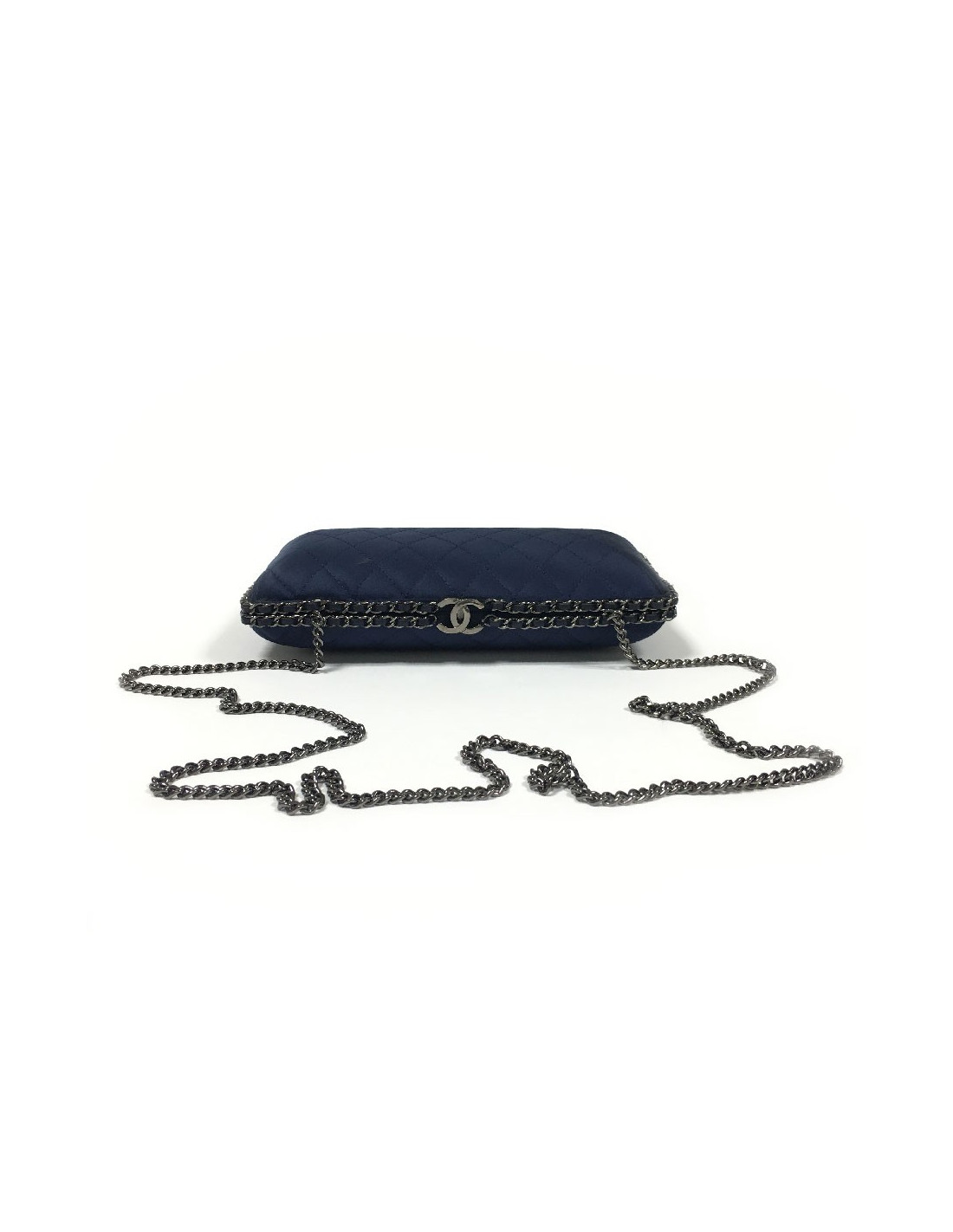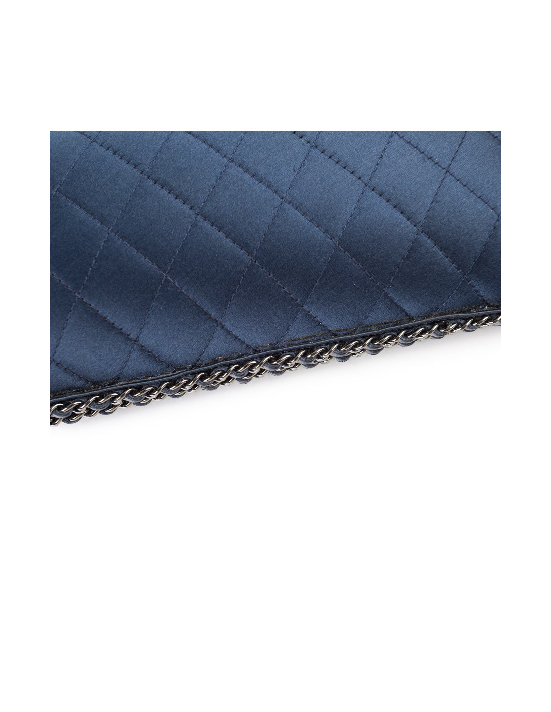 Sac minaudière Chanel en satin de soie bleu nuit. Une chaîne en ruthénium entrelacée de cuir bleu fait le tour de ce sac. Intérieur en soie bleu nuit. Fermoir CC