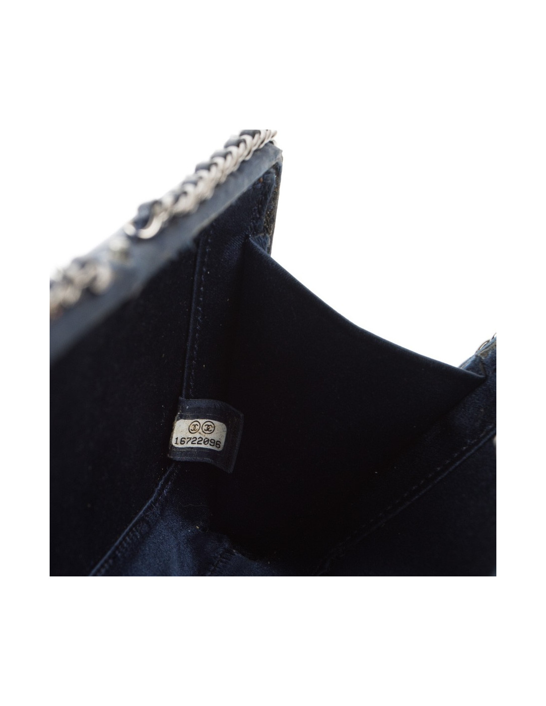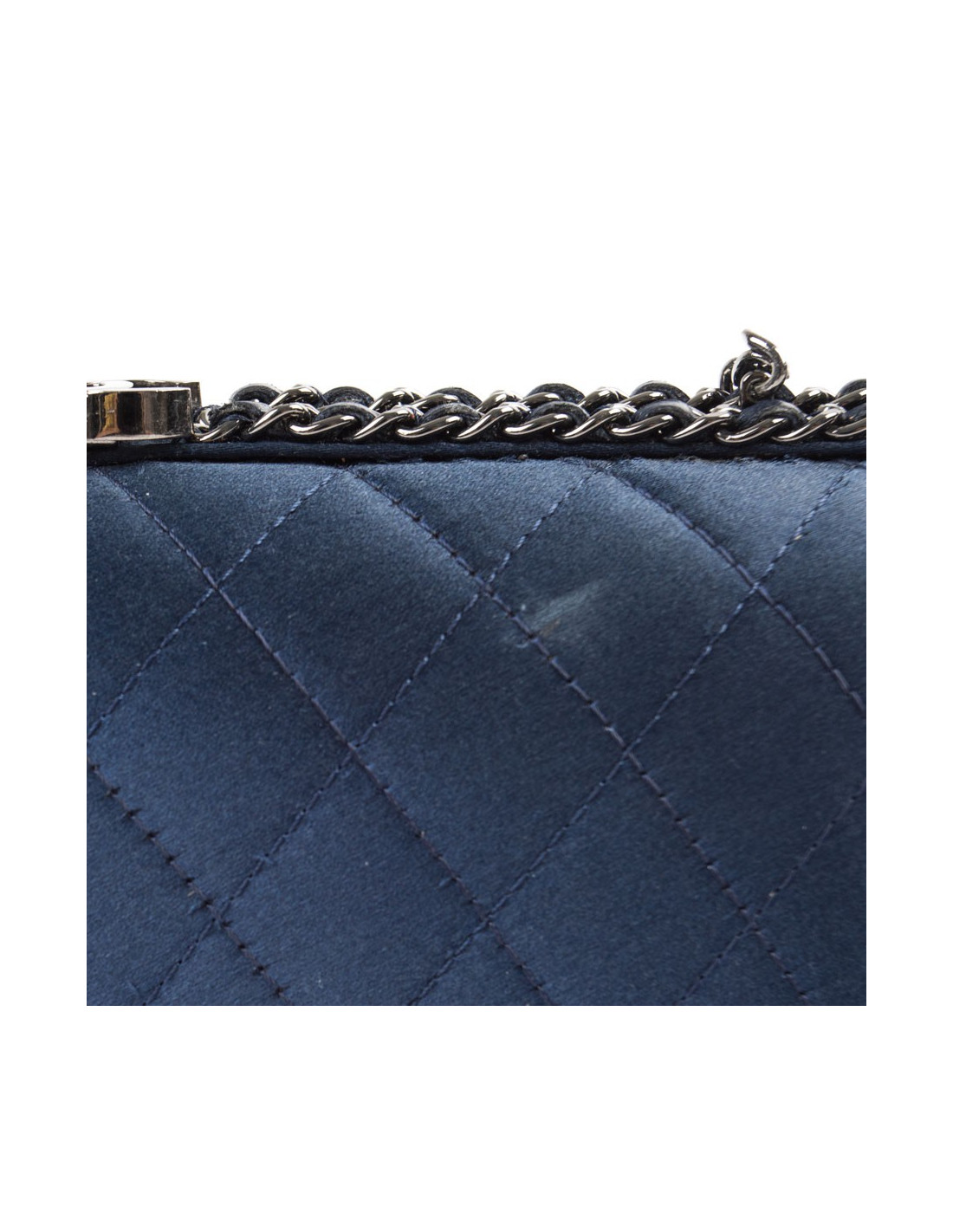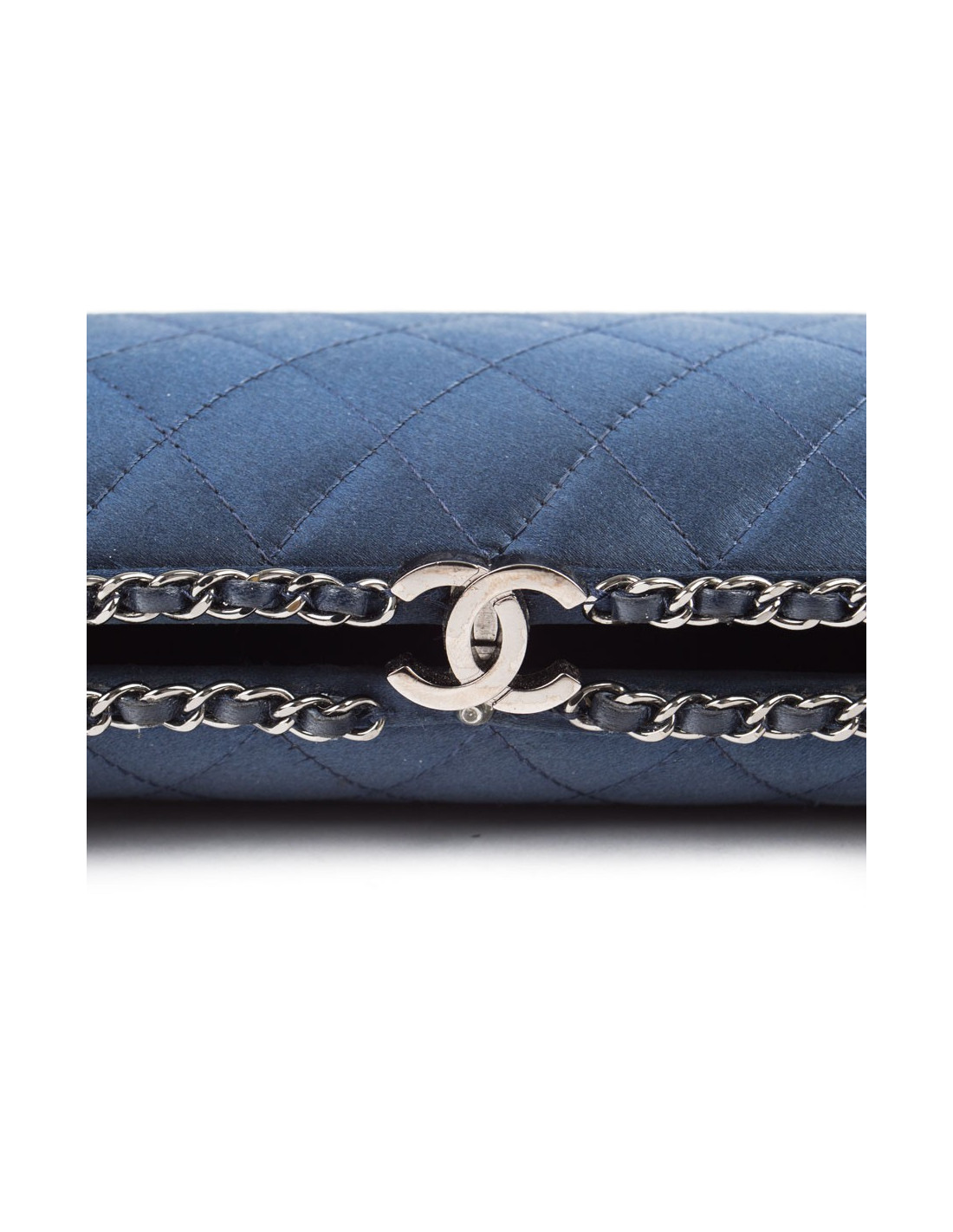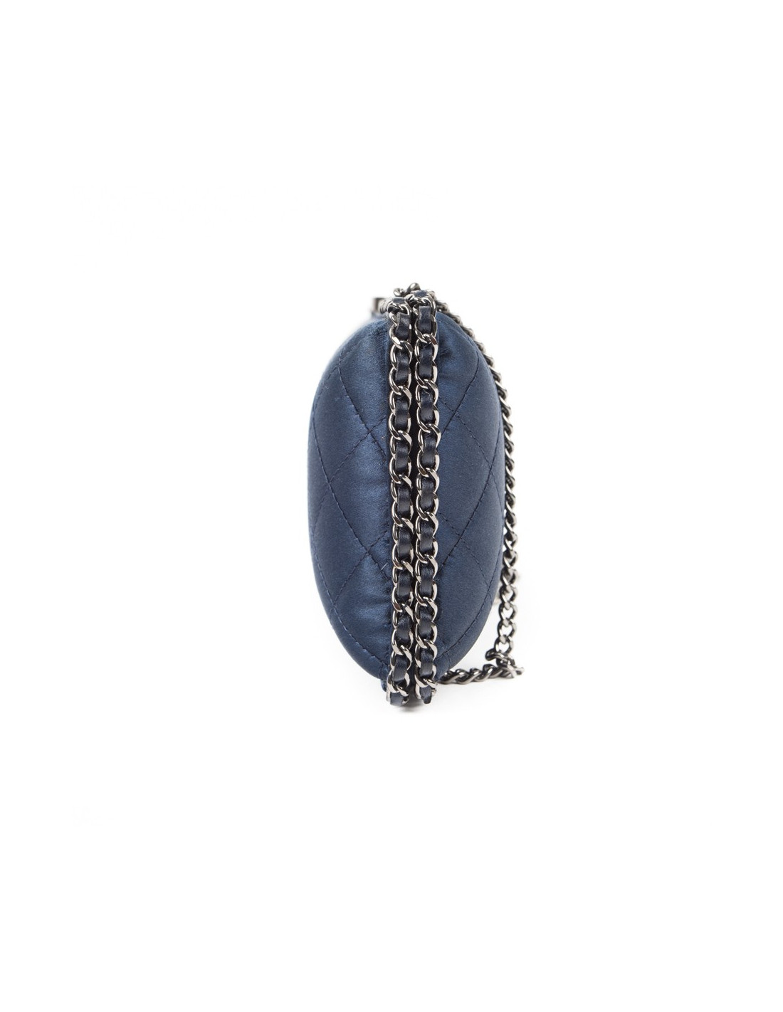 Sac minaudière Chanel en satin de soie bleu nuit. Une chaîne en ruthénium entrelacée de cuir bleu fait le tour de ce sac. Intérieur en soie bleu nuit. Fermoir CC