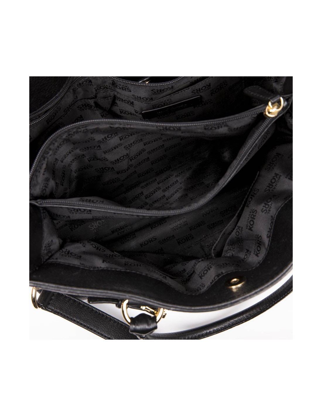 Sac Michael Kors en cuir grainé noir. Intérieur toile monogram noire. Trois compartiments dont un se fermant à l'aide d'une fermeture à glissière. Une poche fermeture à glissière et deux poches plaquées. Porté main à l'aide de deux poignées, épaule et crossover par une bandoulière 97 cm.Très bon état.