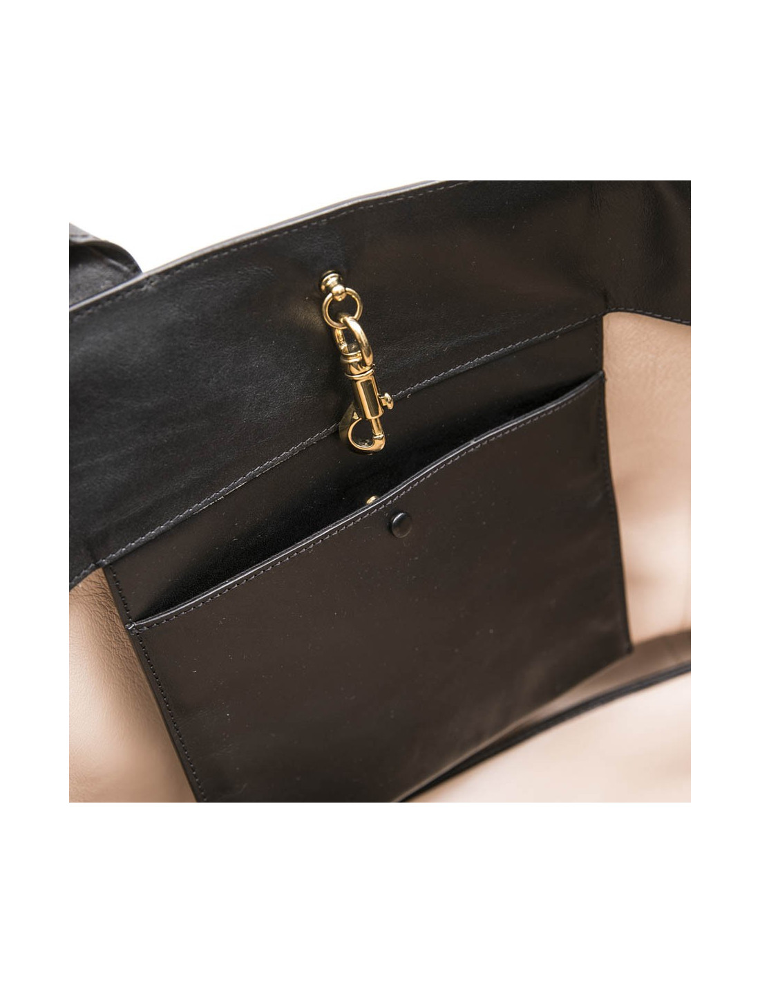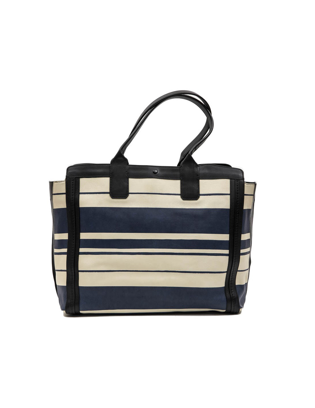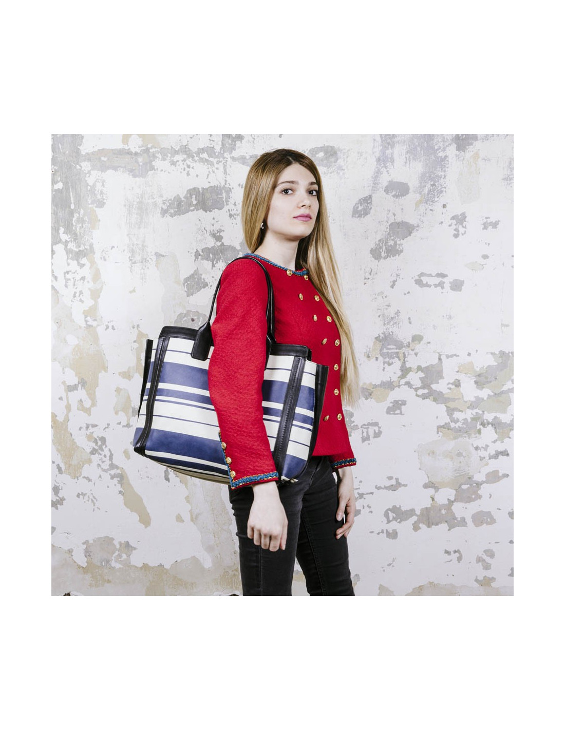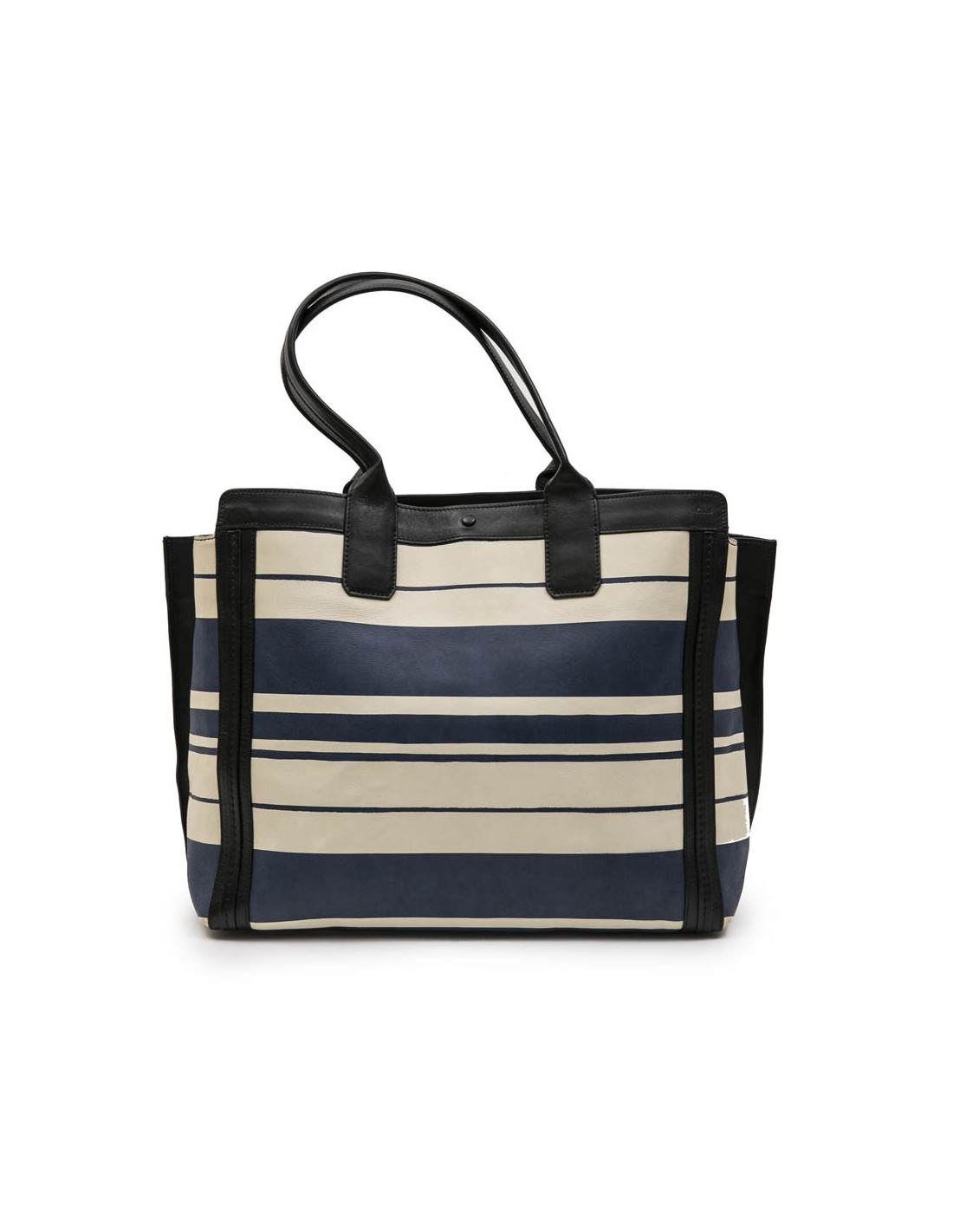 Sac Chloé, en cuir rayé blanc et bleu, bordures et anses noires. Intérieur doublé de cuir beige avec une poche qui se détache et se ferme par un bouton pression. Se porte à l'épaule.
