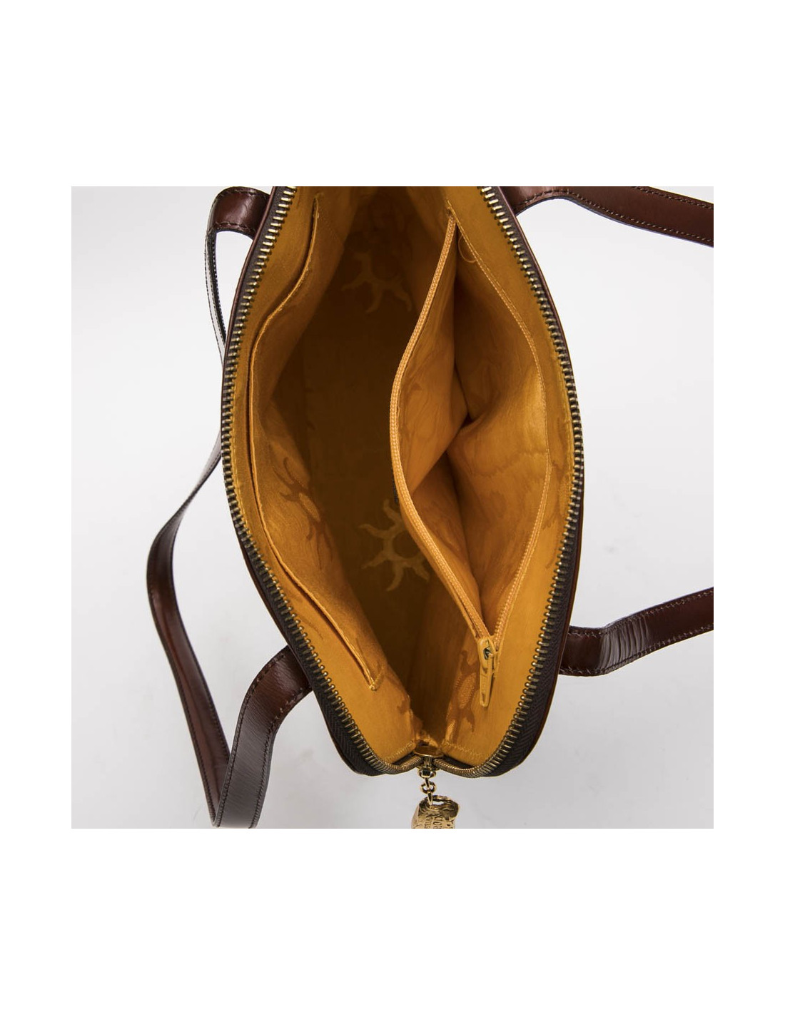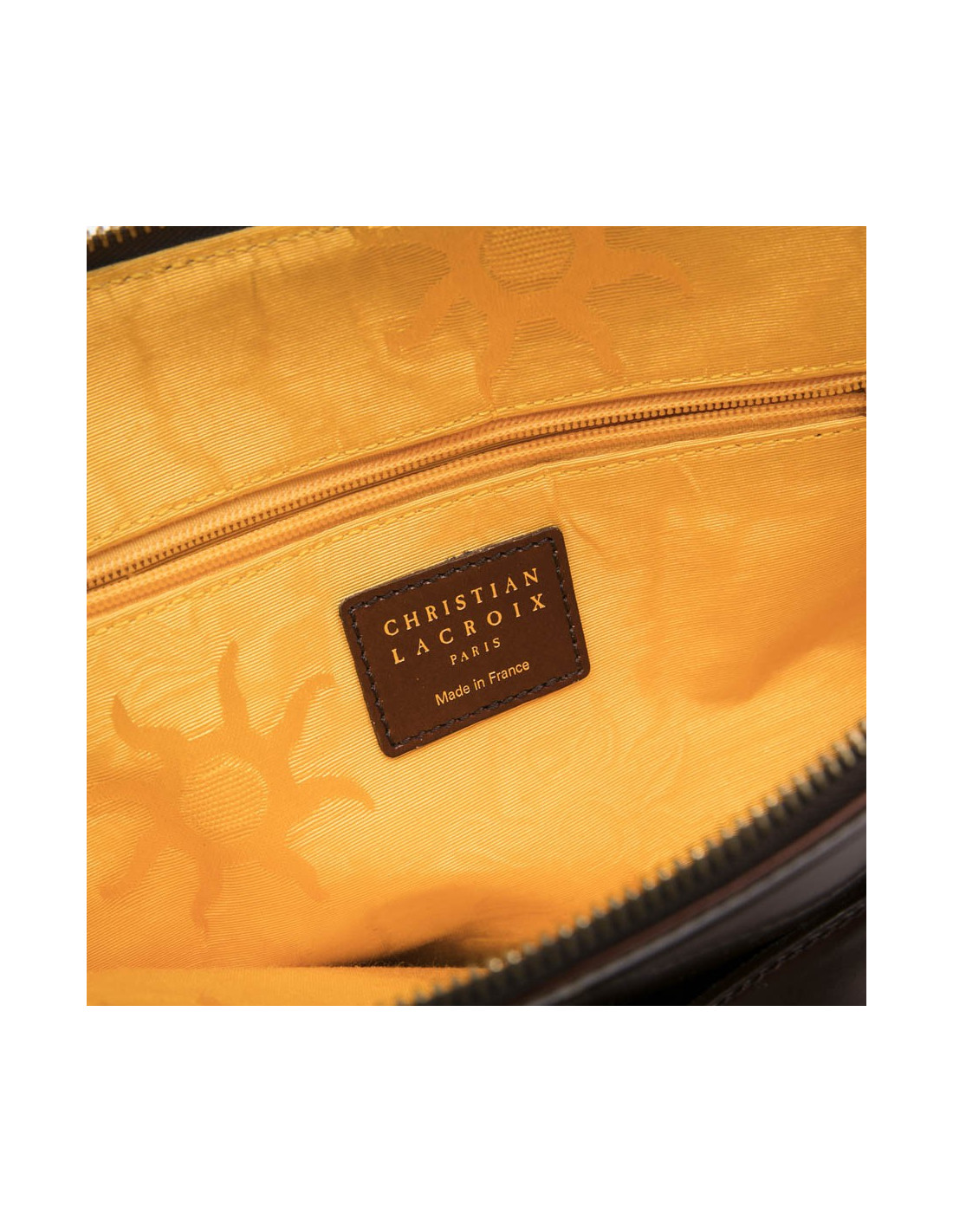 Sac Vintage Christian Lacroix en cuir fauve lisse. L'intérieur est en satin jaune monogram avec 2 poches une plate et l'autre avec une fermeture éclair.