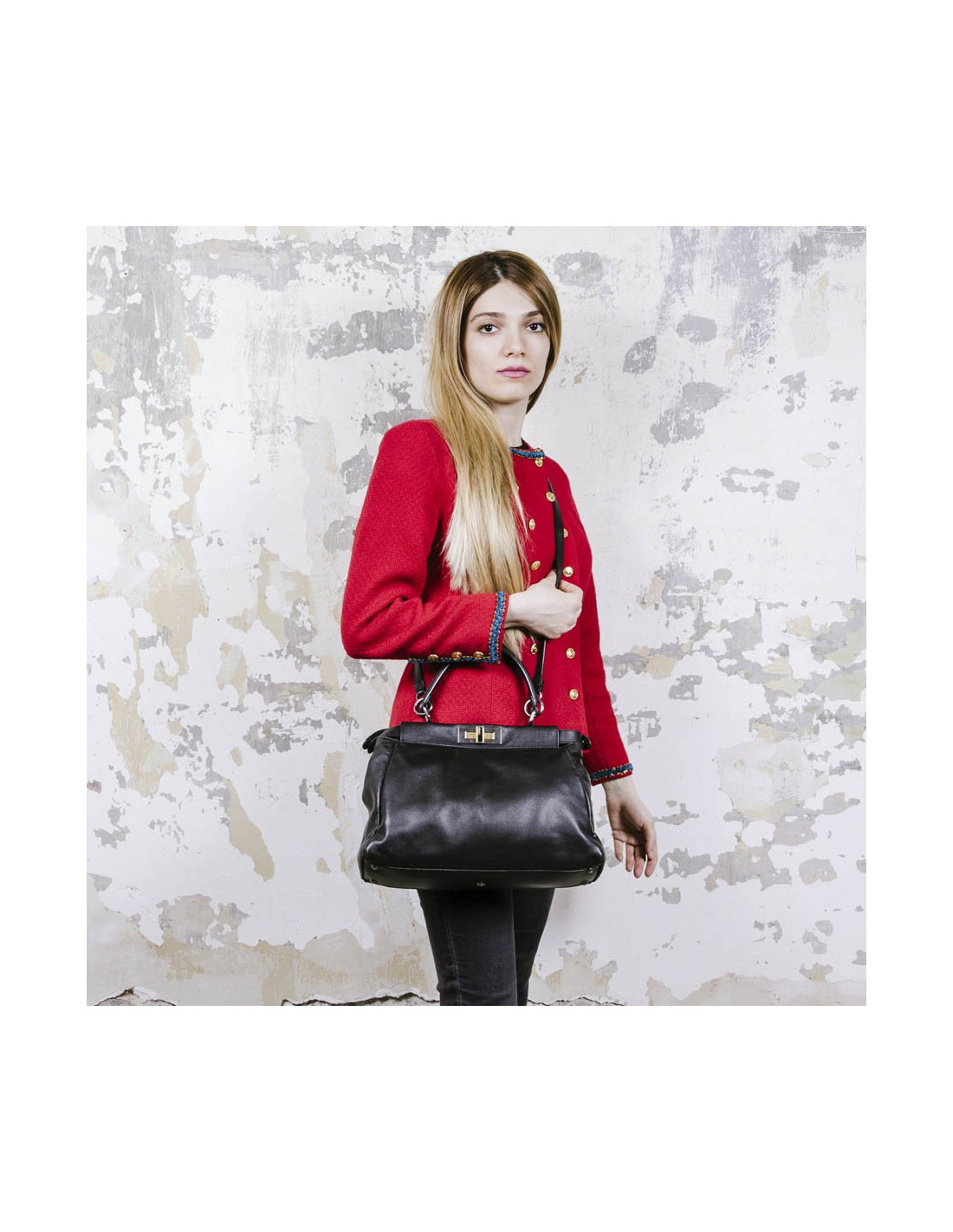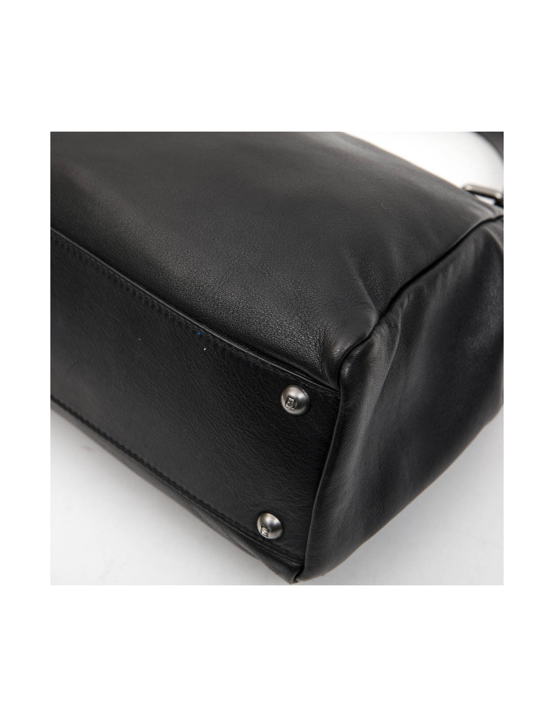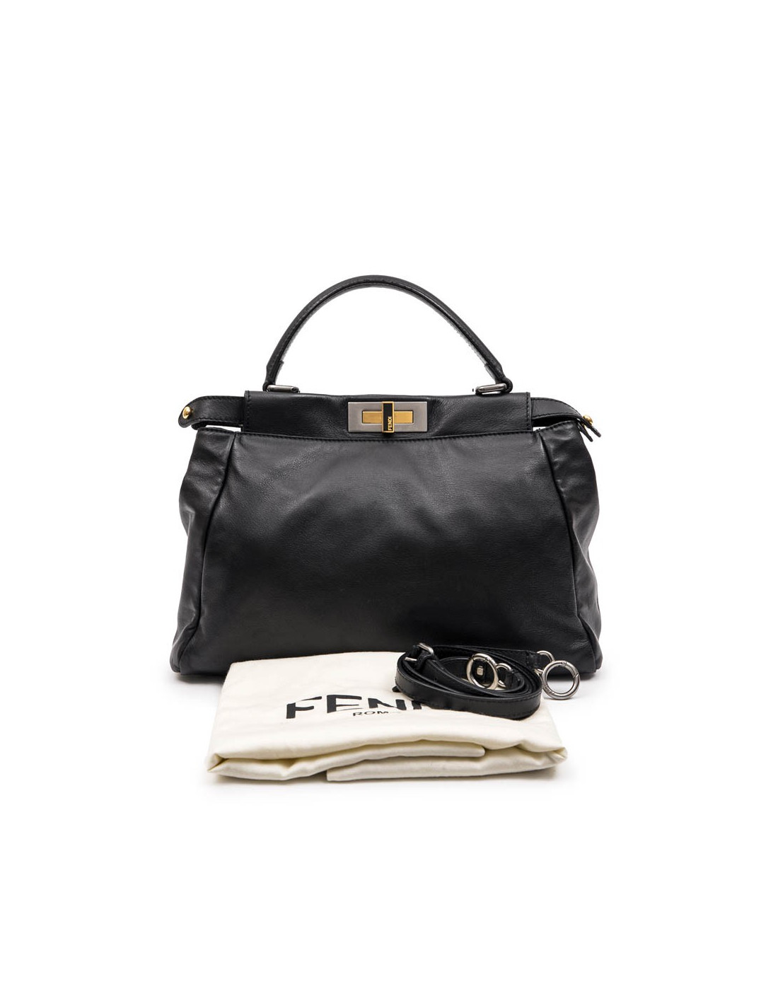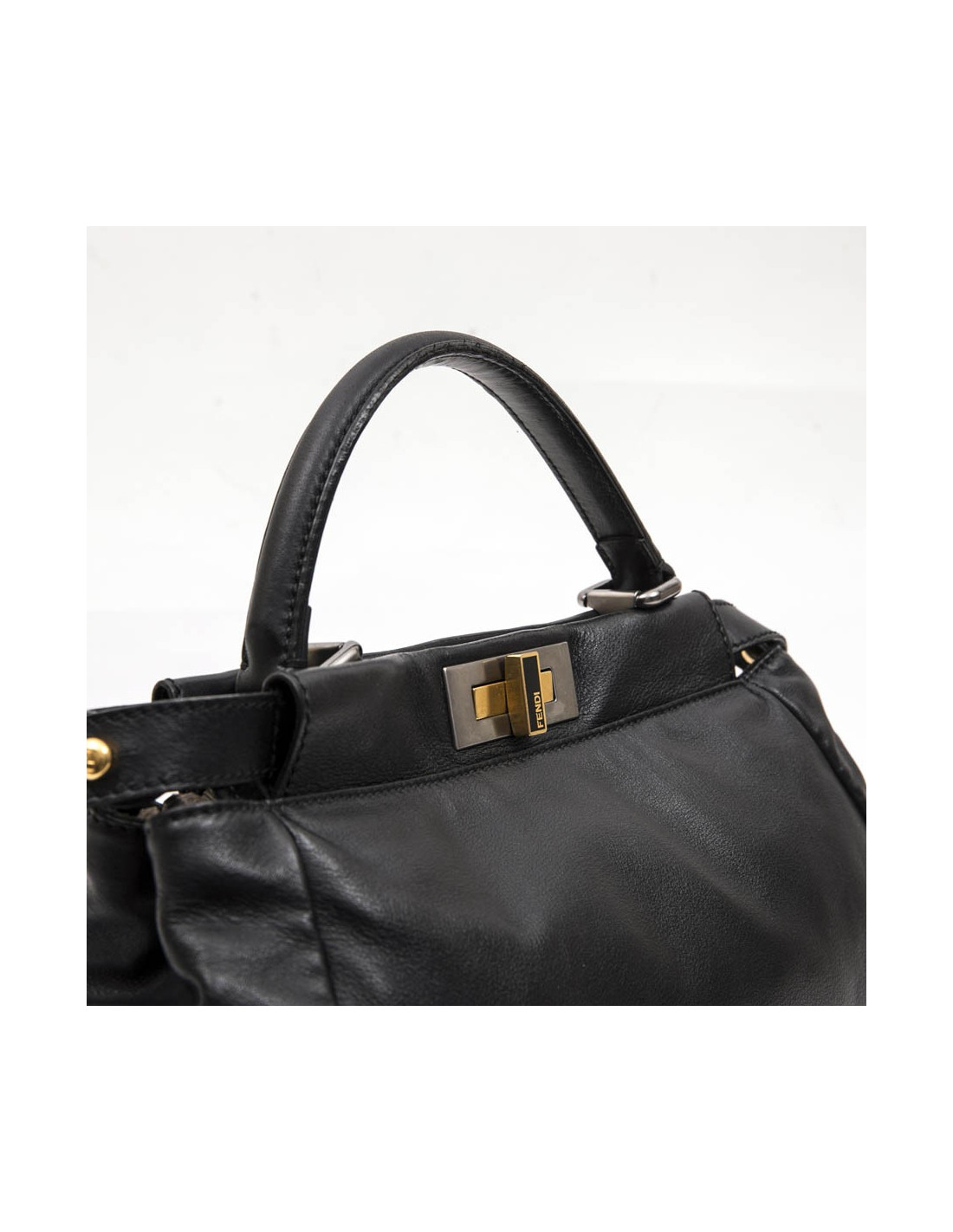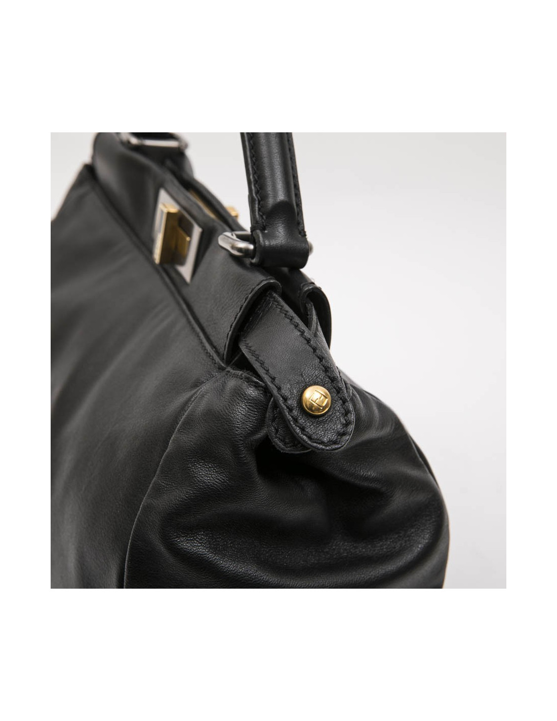 Sac peekaboo Fendi en cuir souple noir. Taille moyenne avec bandoulière ajustable et amovible et anse. La fermeture est pivotante : en métal doré et argenté.