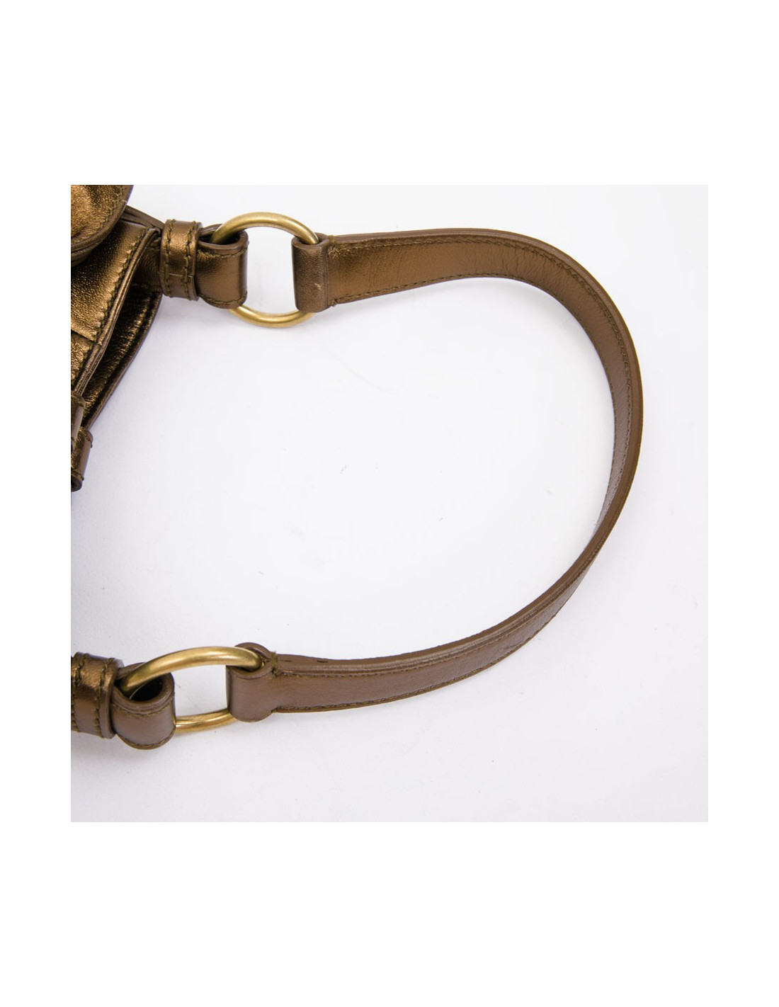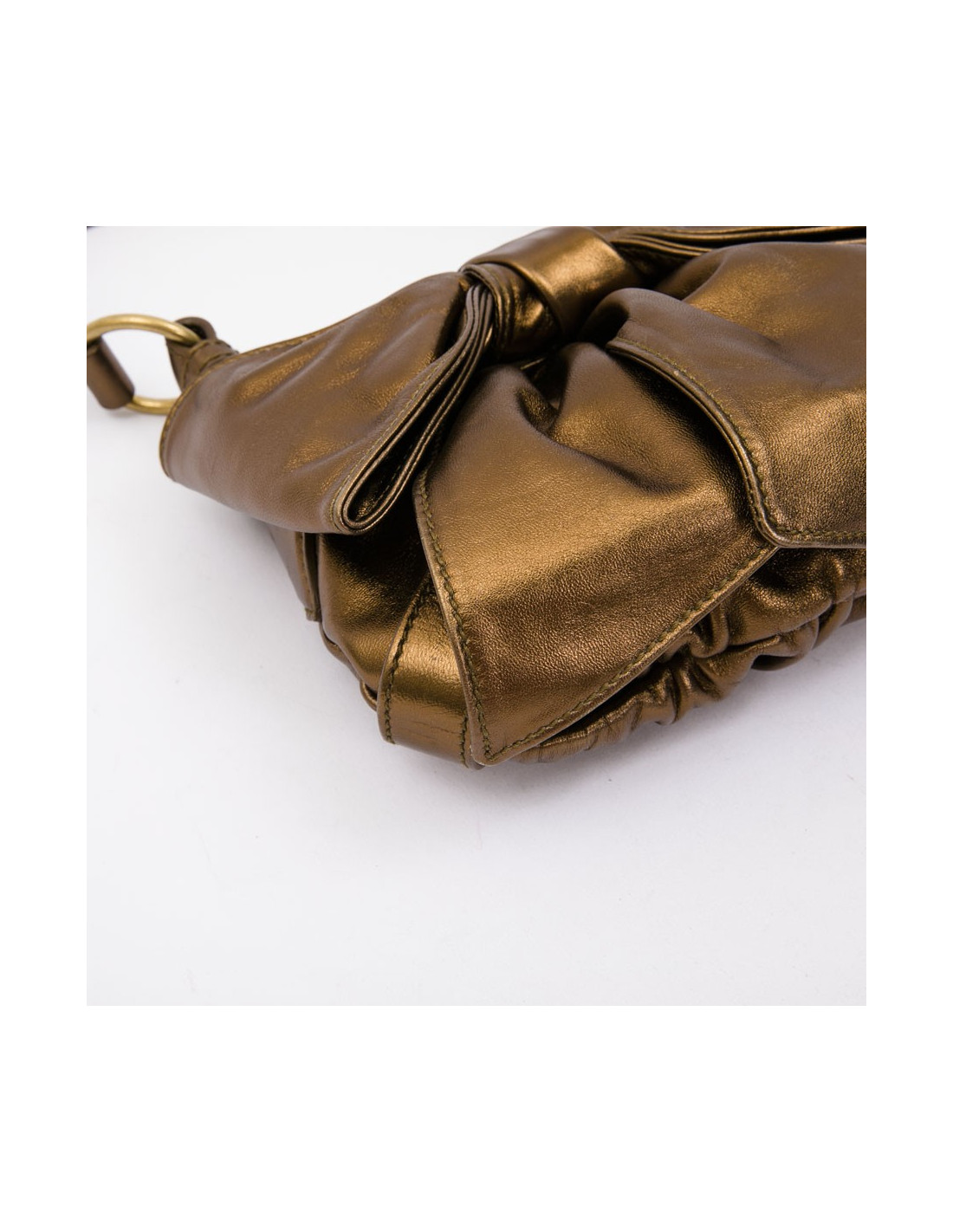 Bijouterie en laiton dorée. Noeud en cuir à l'avant du sac.