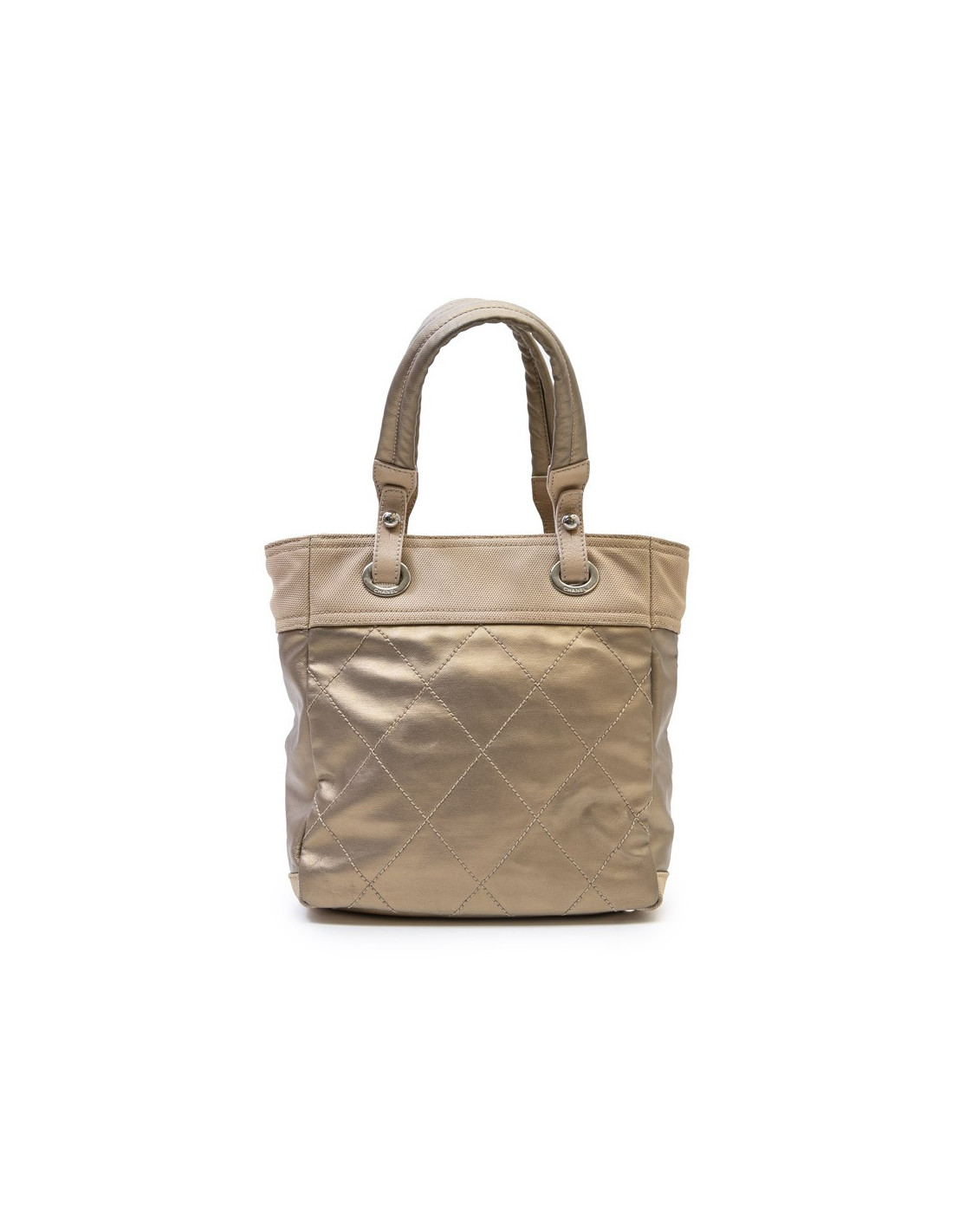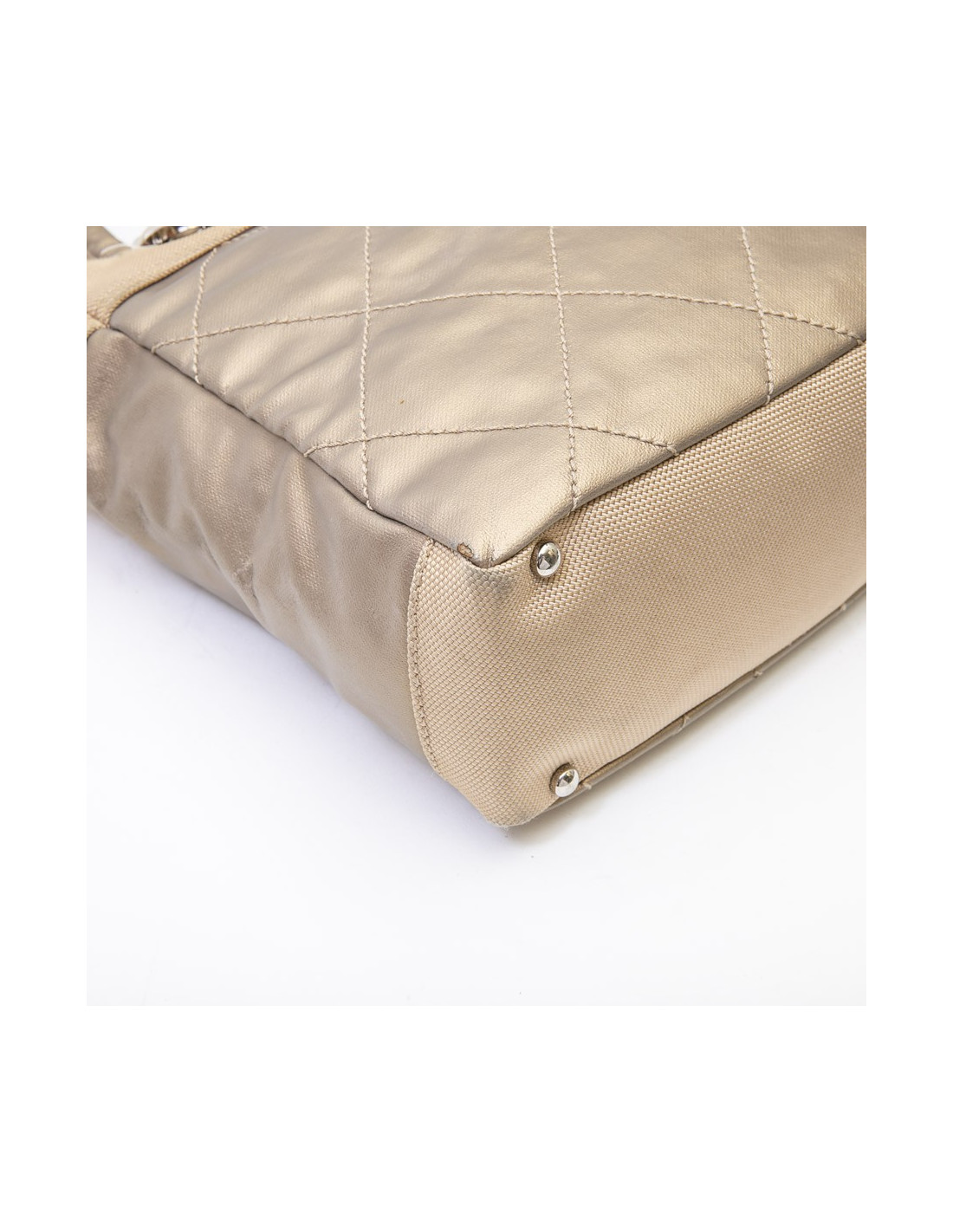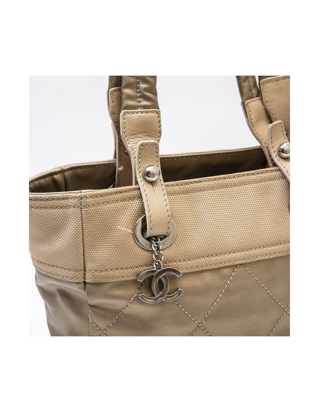 Ce sac "Biarritz" Chanel est en toile matelassée beige doré. La bijouterie est métal argent palladié. Il a une fermeture éclair. L'intérieur est en toile blanche légèrement décolorée, avec pochez zippée et 2 fentes.