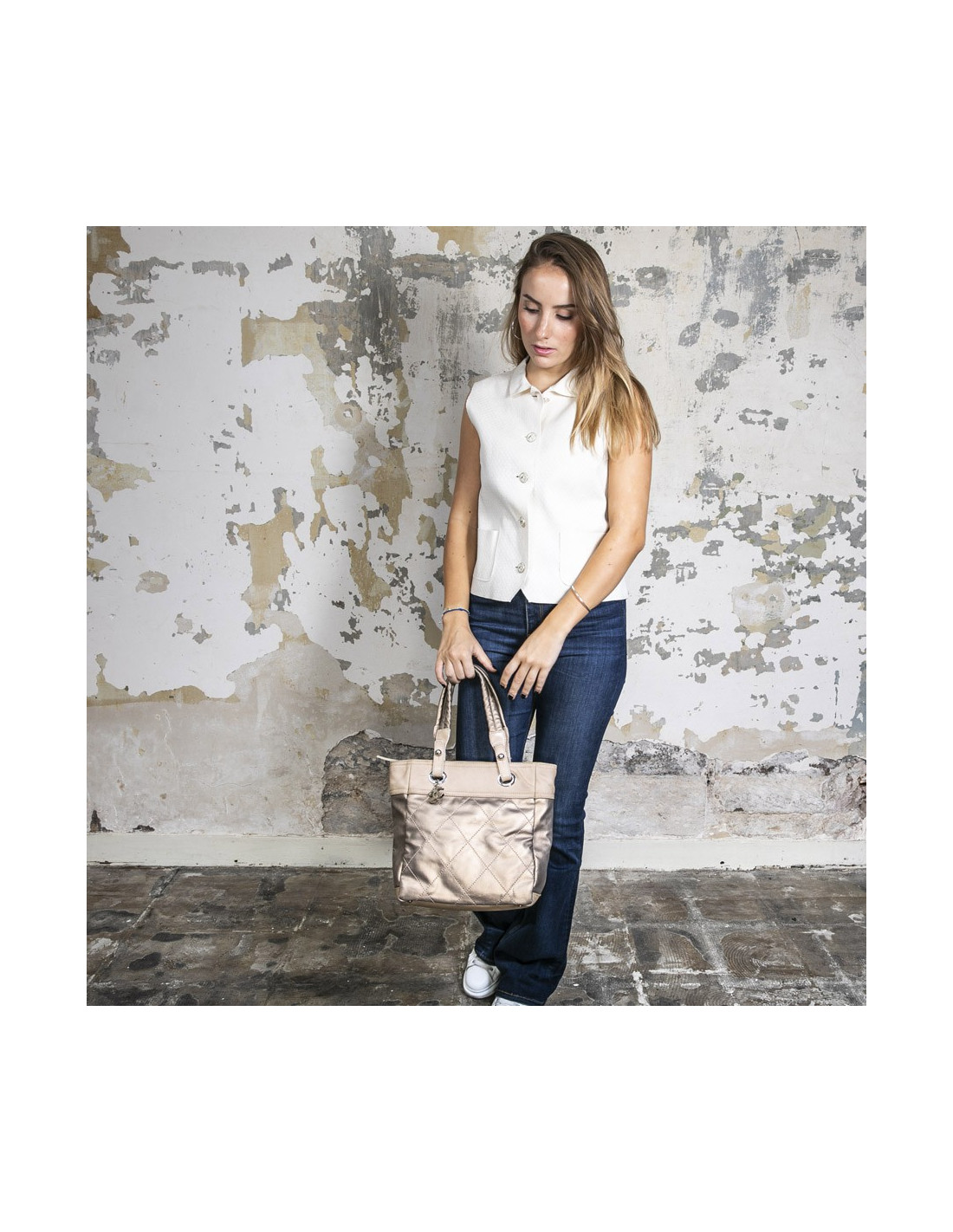 Sac "Biarritz" CHANEL toile matelassée beige doré
