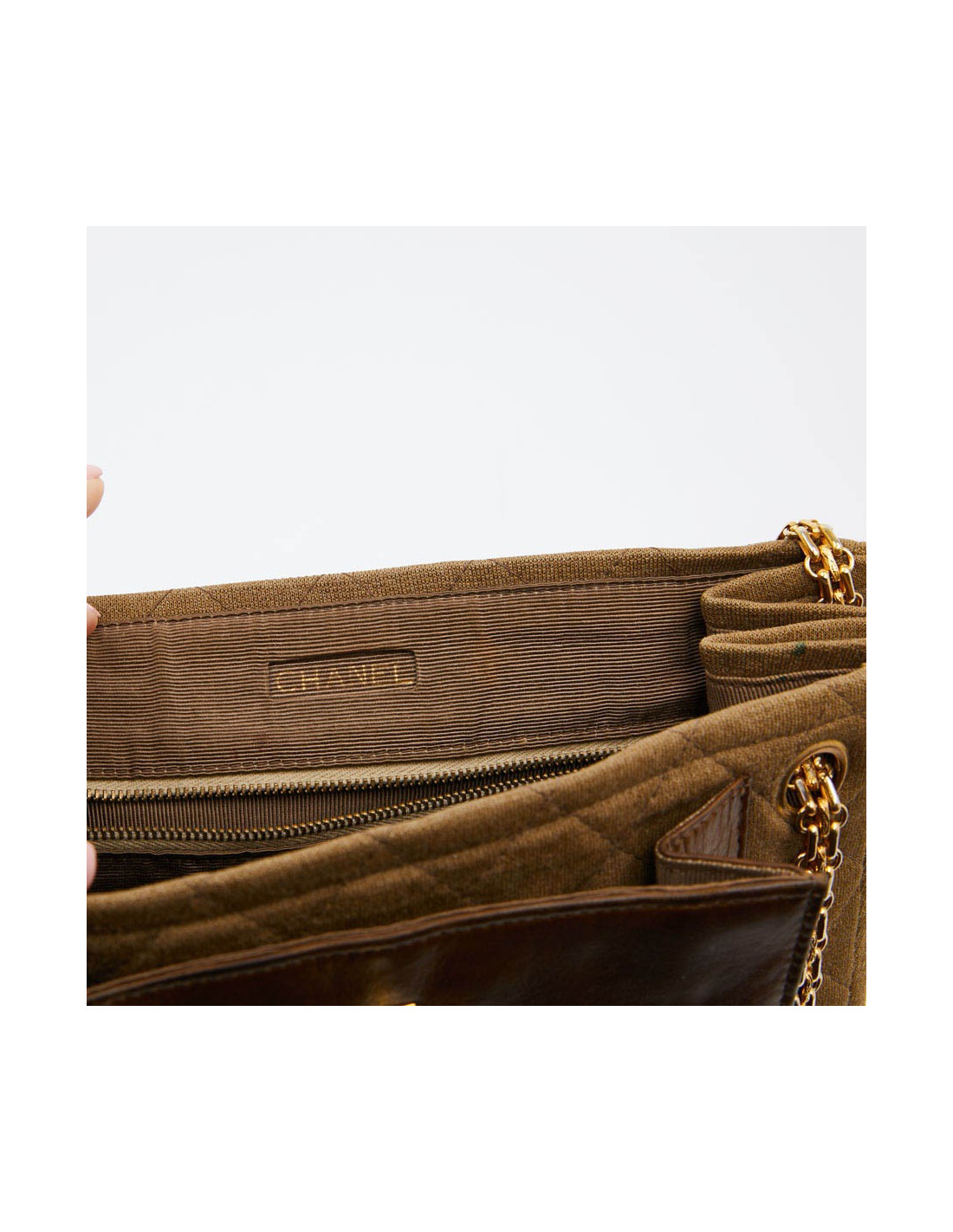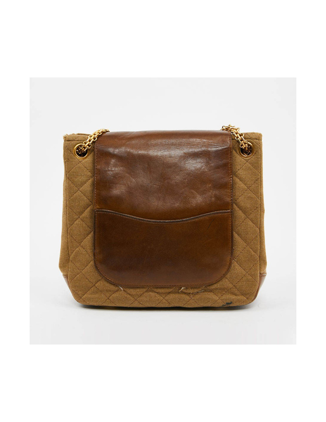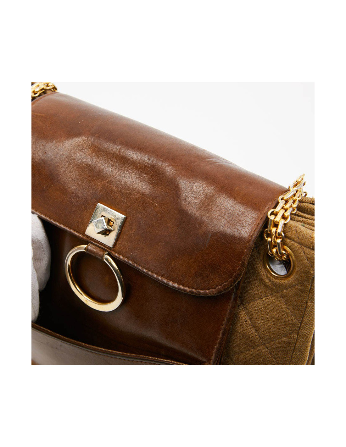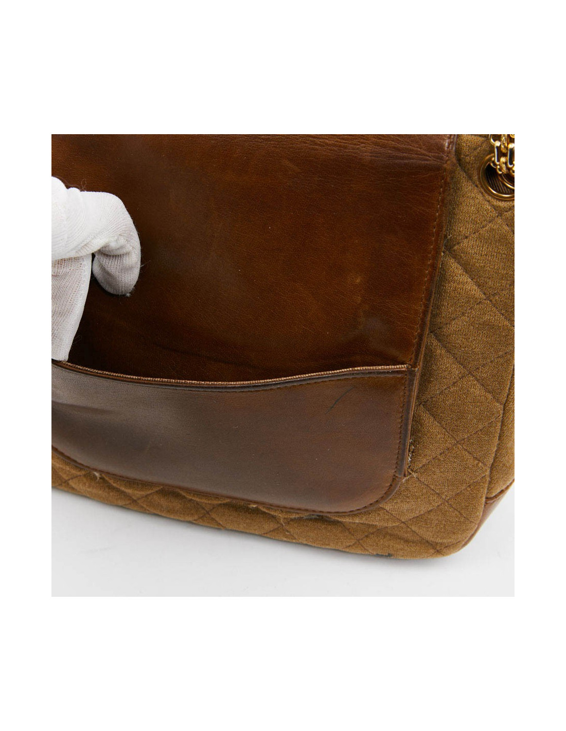 Ce sac CHANEL est en jersey matelassé et cuir marron. Ouverture par rabat. La bijouterie est en métal doré. Le fermoir carré tourne sur lui même. Il se porte à l'épaule ou en croisé. Le sac est en état correct : Le tissu a des accrocs à divers endroits sur le dessus et une marque noire est visible sur le jersey à l'arrière. Il a une poche plate à l'avant du sac sur la pièce en cuir, à l'intérieur plusieurs poches dont une zippée.