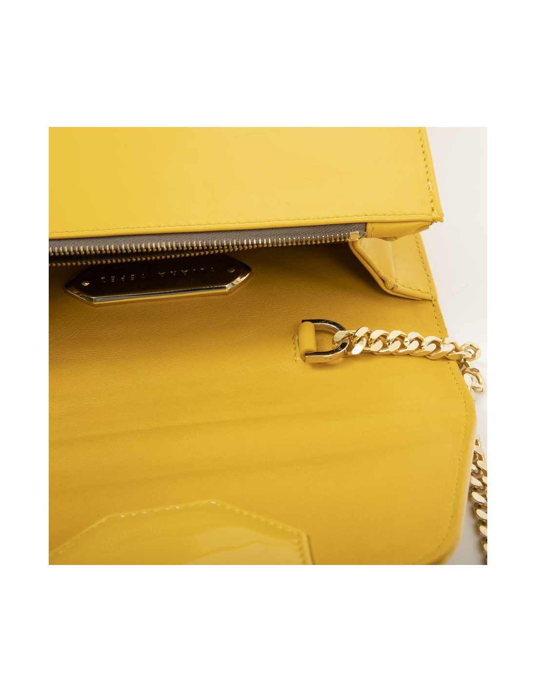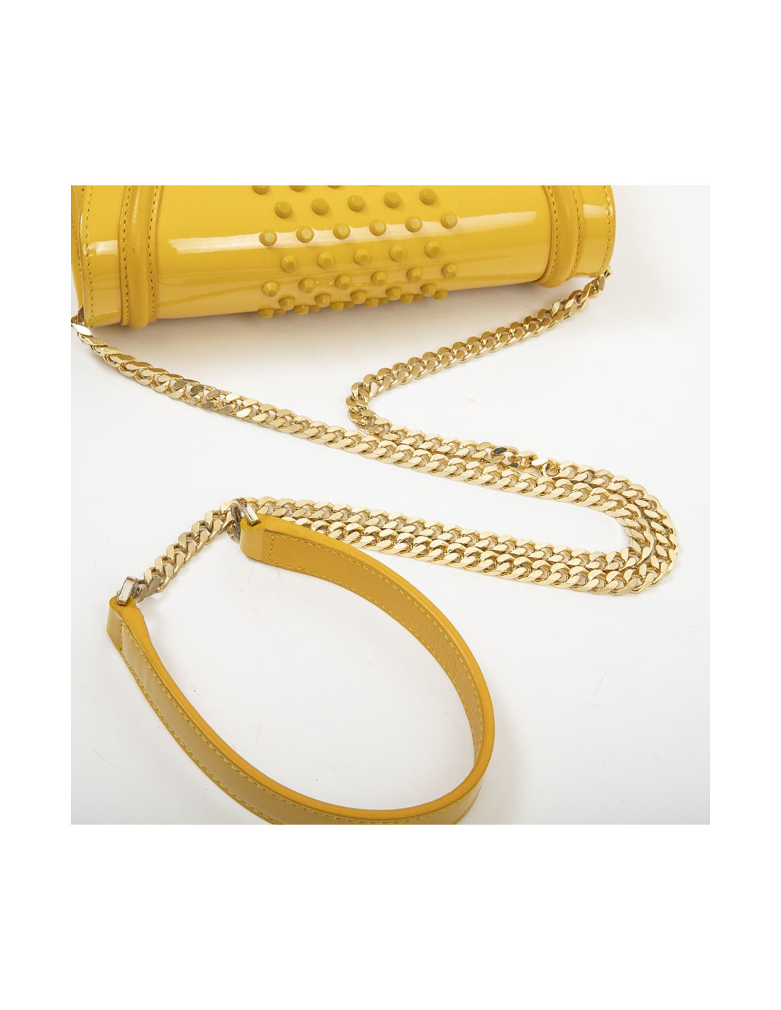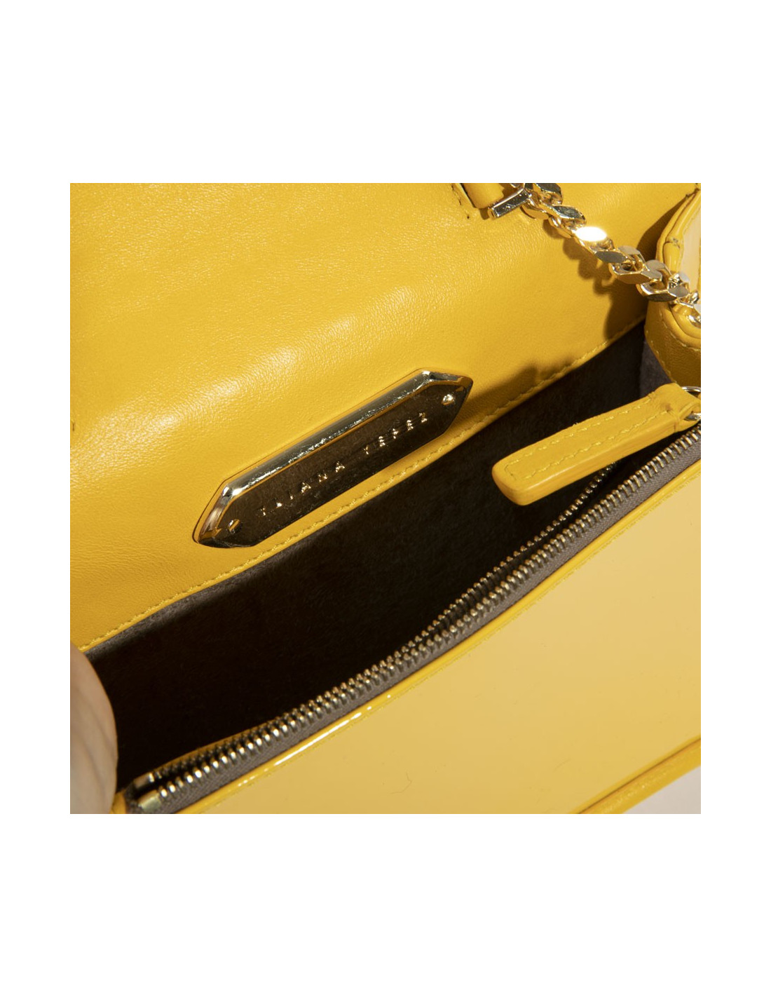 Sac Yliana Yepez en cuir jaune verni à picots. Doublure intérieure en feutrine marron clair. Une poche plate zippée. Anse bandoulière en métal doré.