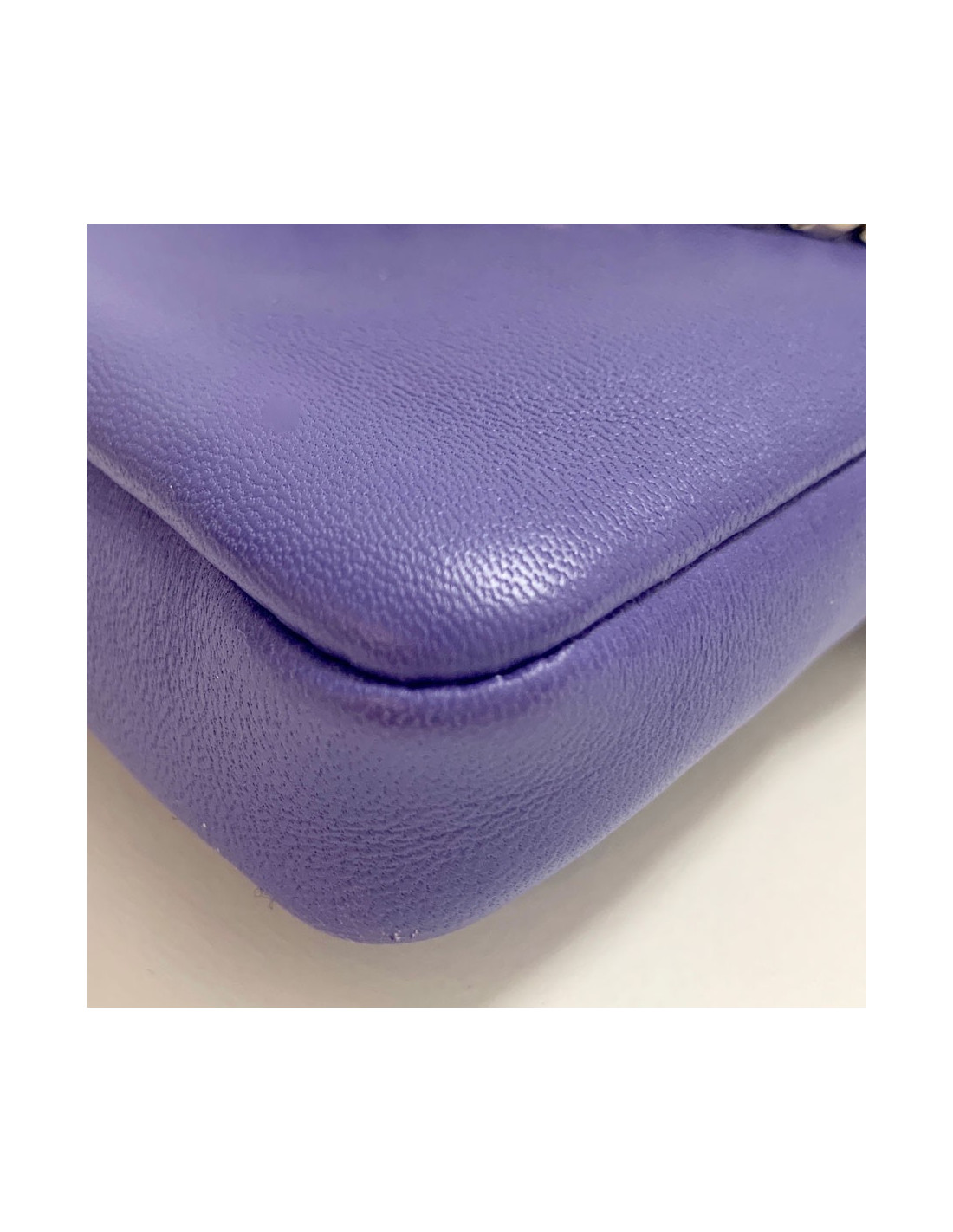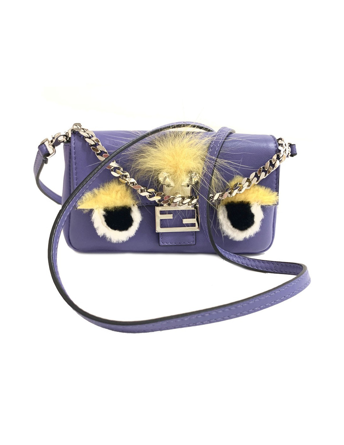 Mini sac baguette collection 'Monster' Fendi en cuir lisse violet. Bijouterie argentée. Le mini sac est agrémenté de fourrure teintée jaune, d'une perle nacrée et de 2 cristaux. Fermeture par bouton pression. Vous pouvez le porter en pochette ou en bandoulière. Il est agrémenté d'une chaîne en maille argentée.