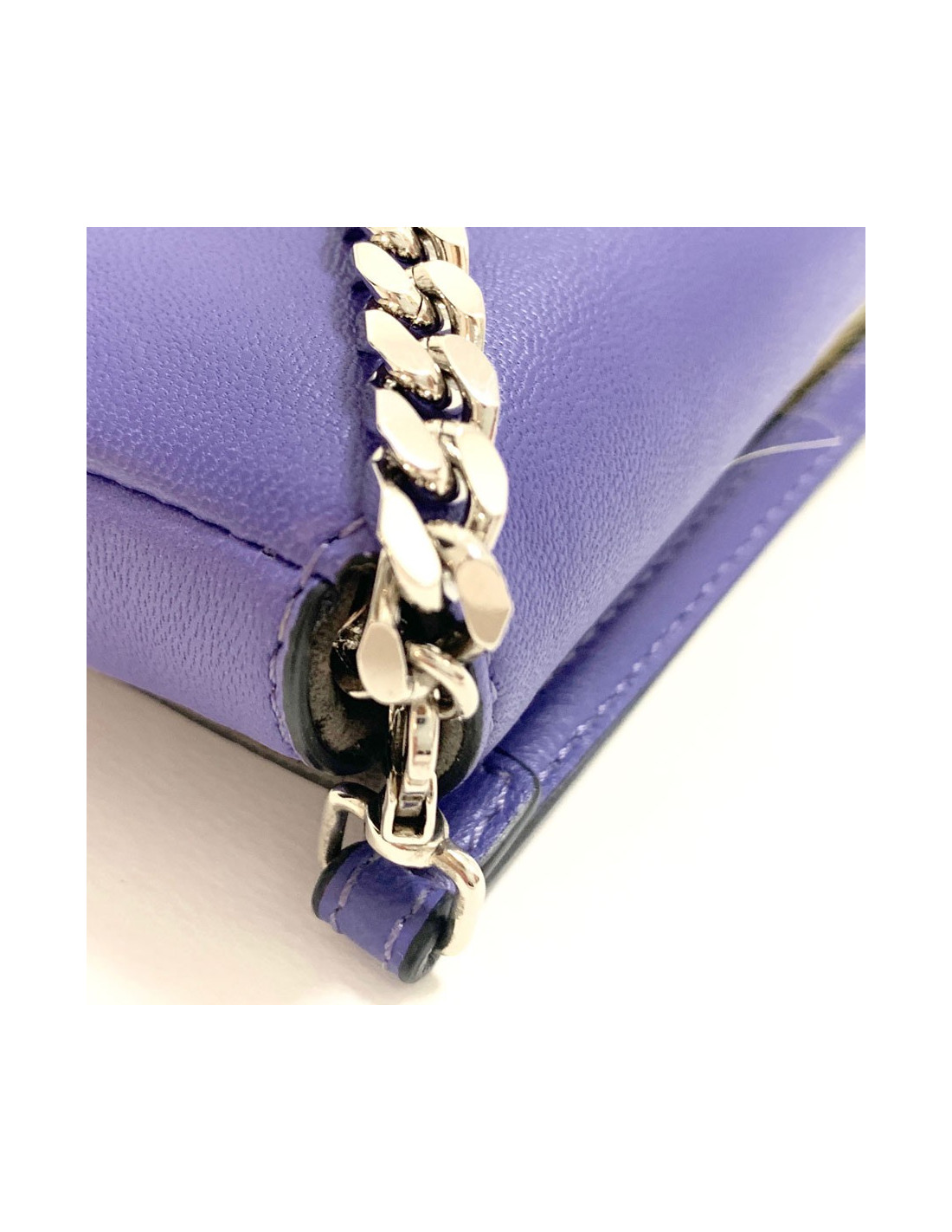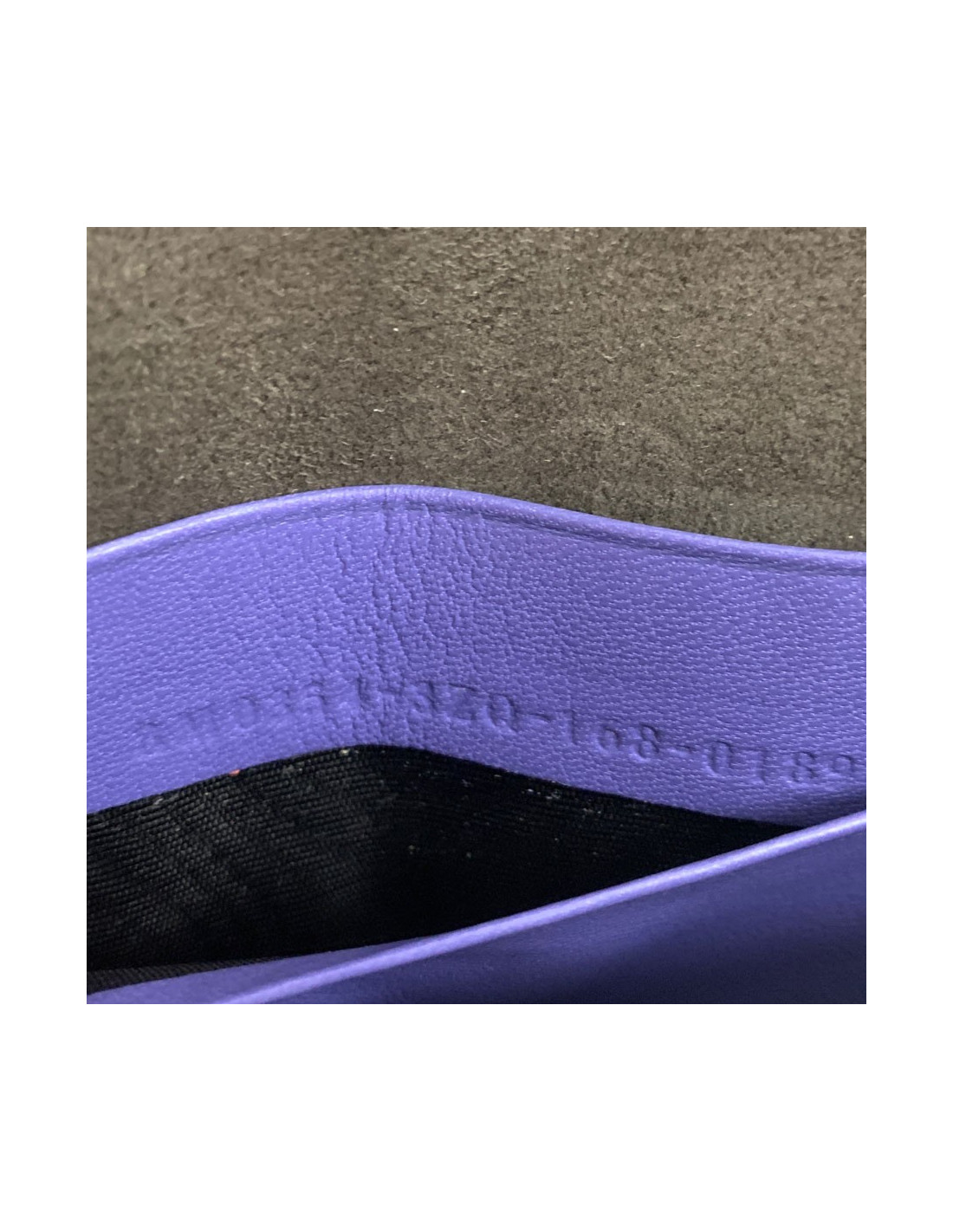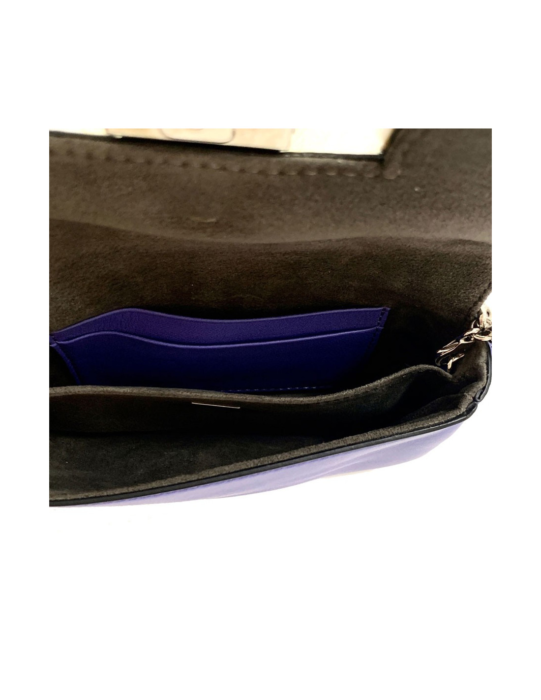 L'intérieur est en daim gris et est composé de 2 soufflets ainsi que de 2 fentes à cartes en cuir violet.