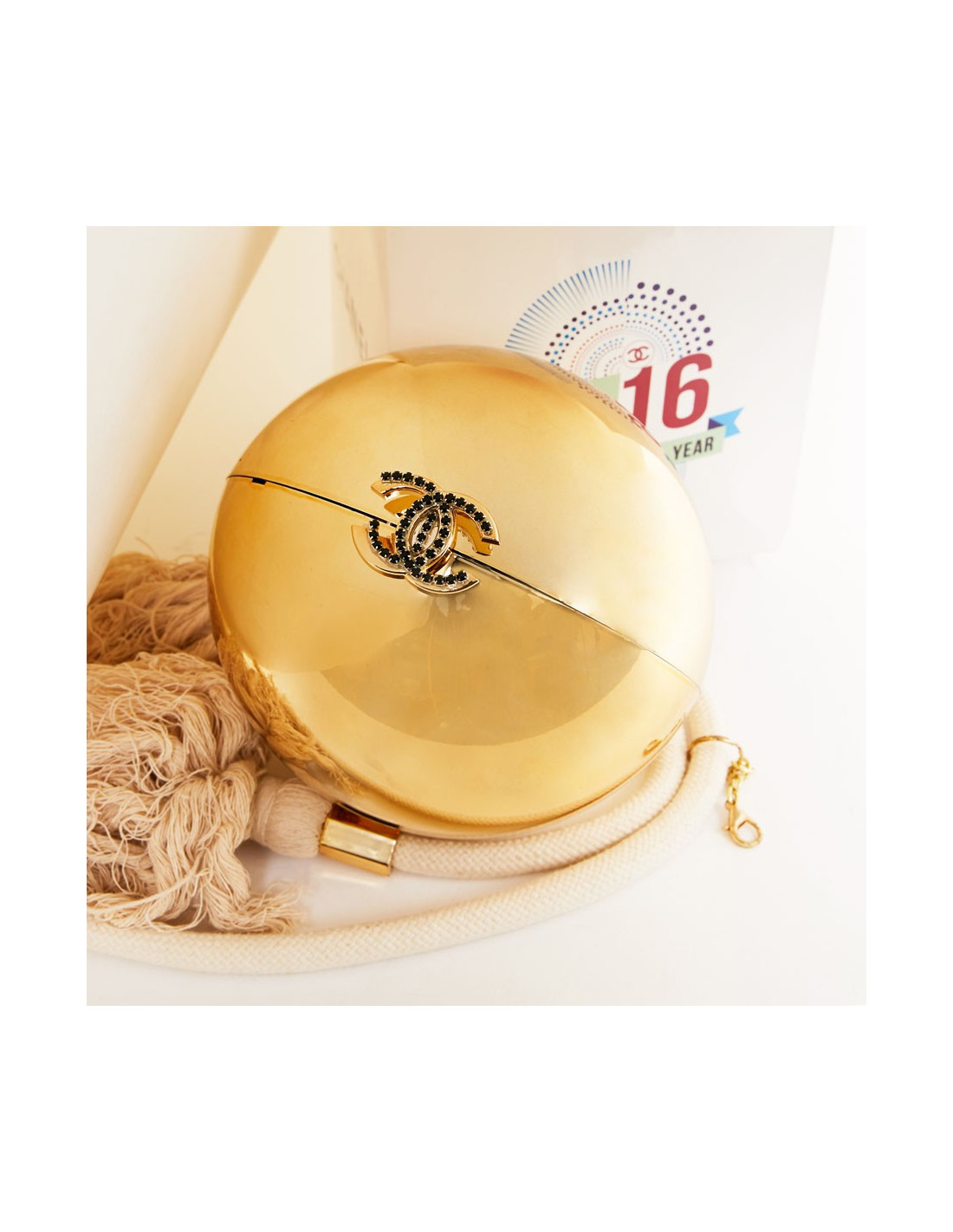 Jolie Minaudière ronde Chanel, édition Limitée en plexiglas doré avec garniture en métal doré, l'anse bandoulière est amovible en toile tressée beige pour un porté épaule ou bandoulière. Fermoir double "C". L'intérieur est doublé en cuir doré. Il sera vendu avec sa boite d'origine Chanel. Il est en très bonne condition. Cadeau VIP 2016.