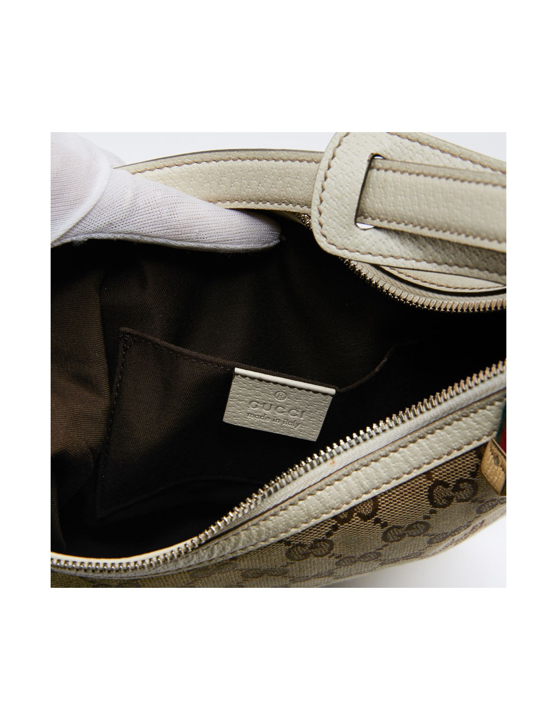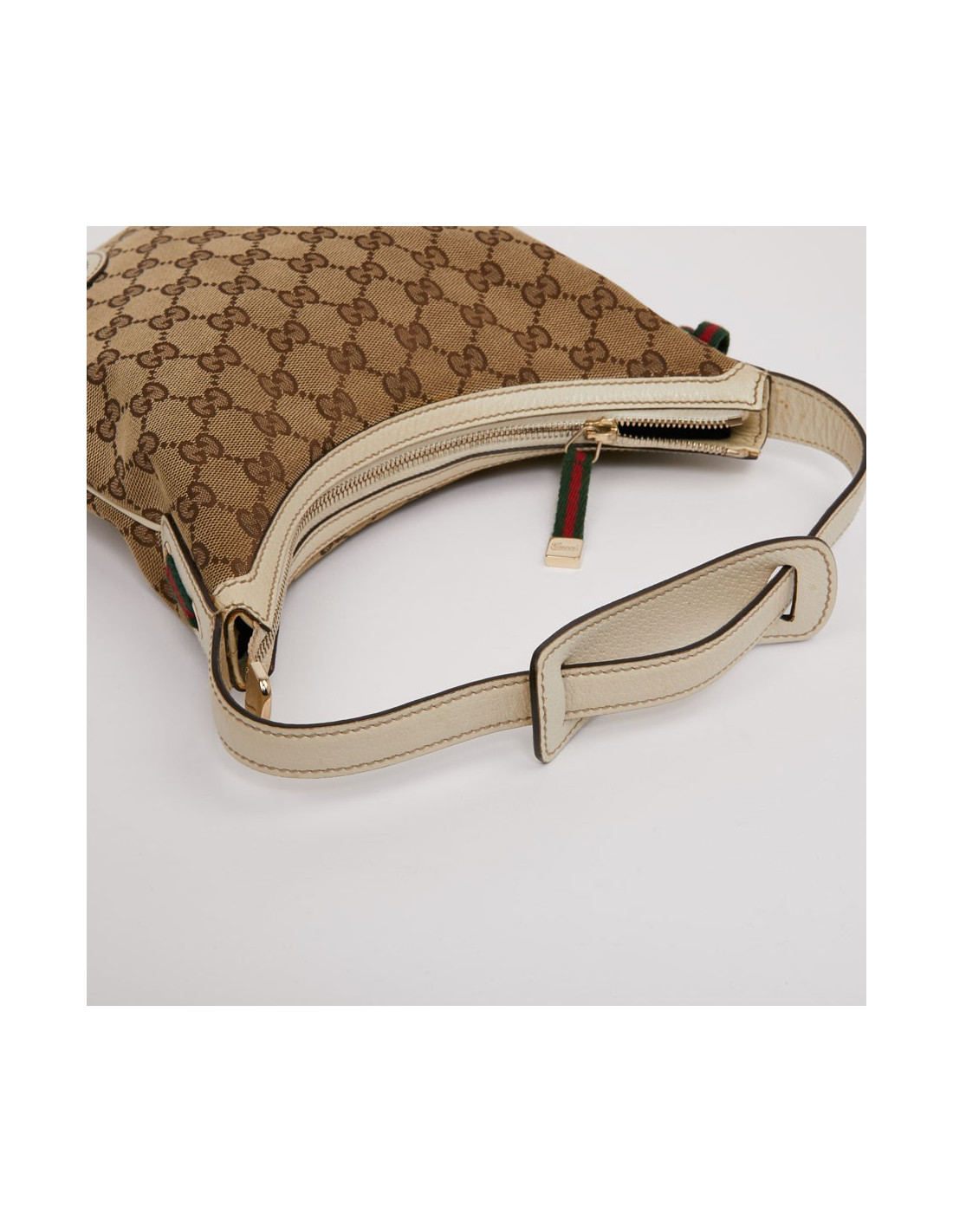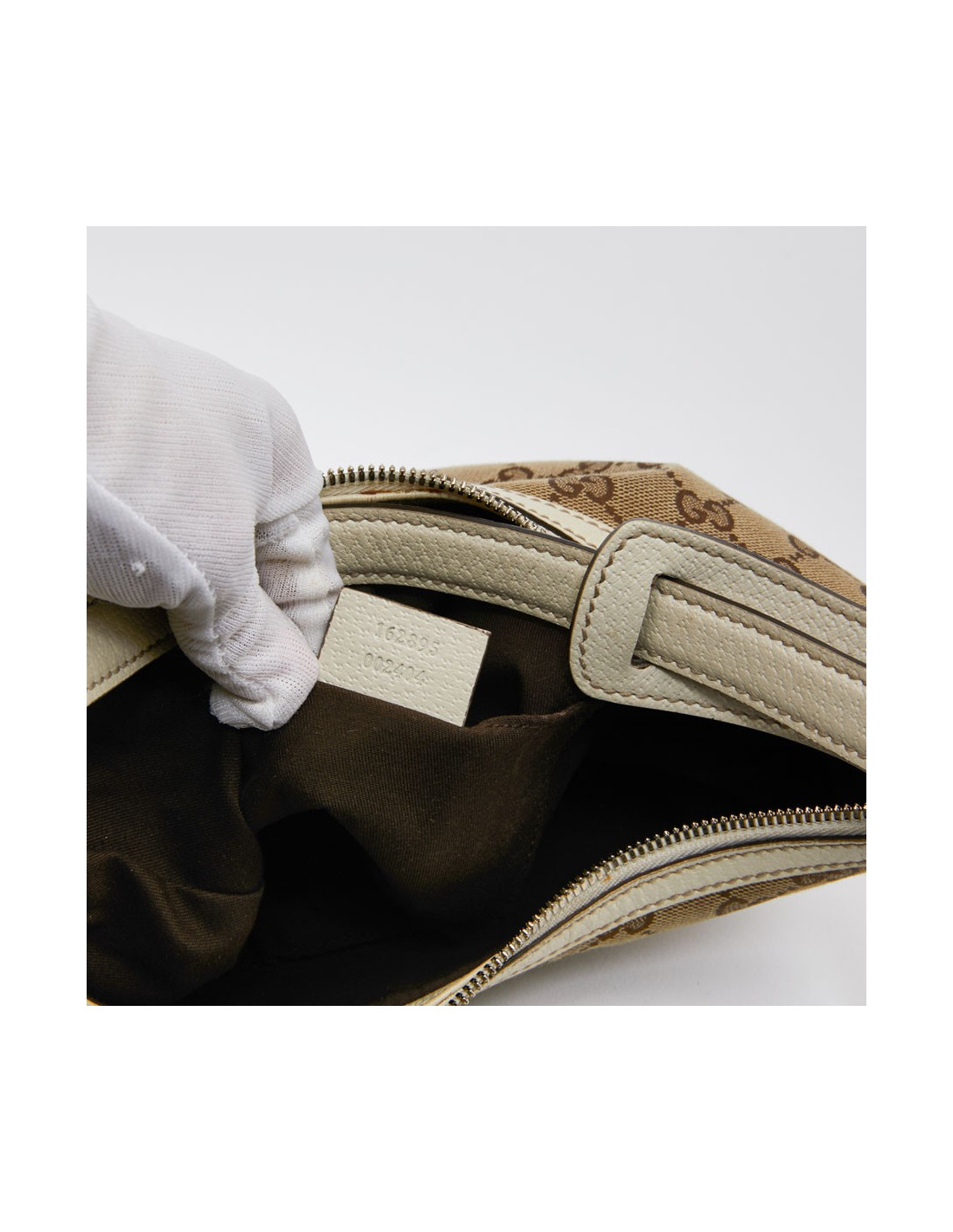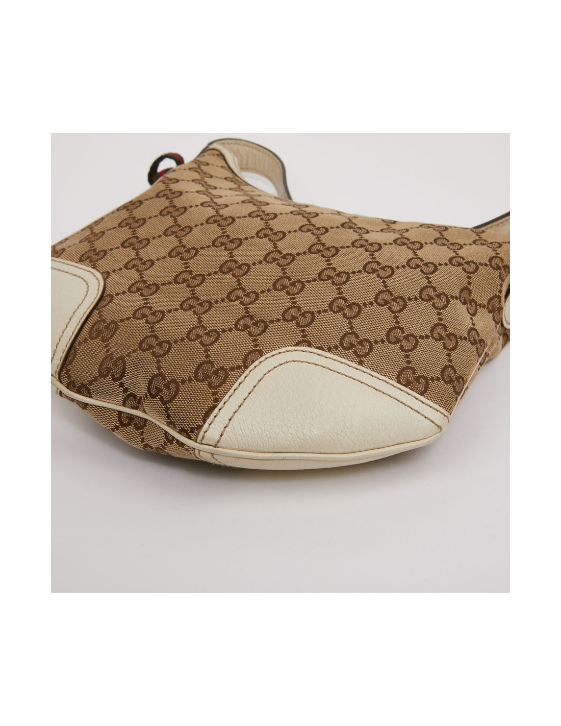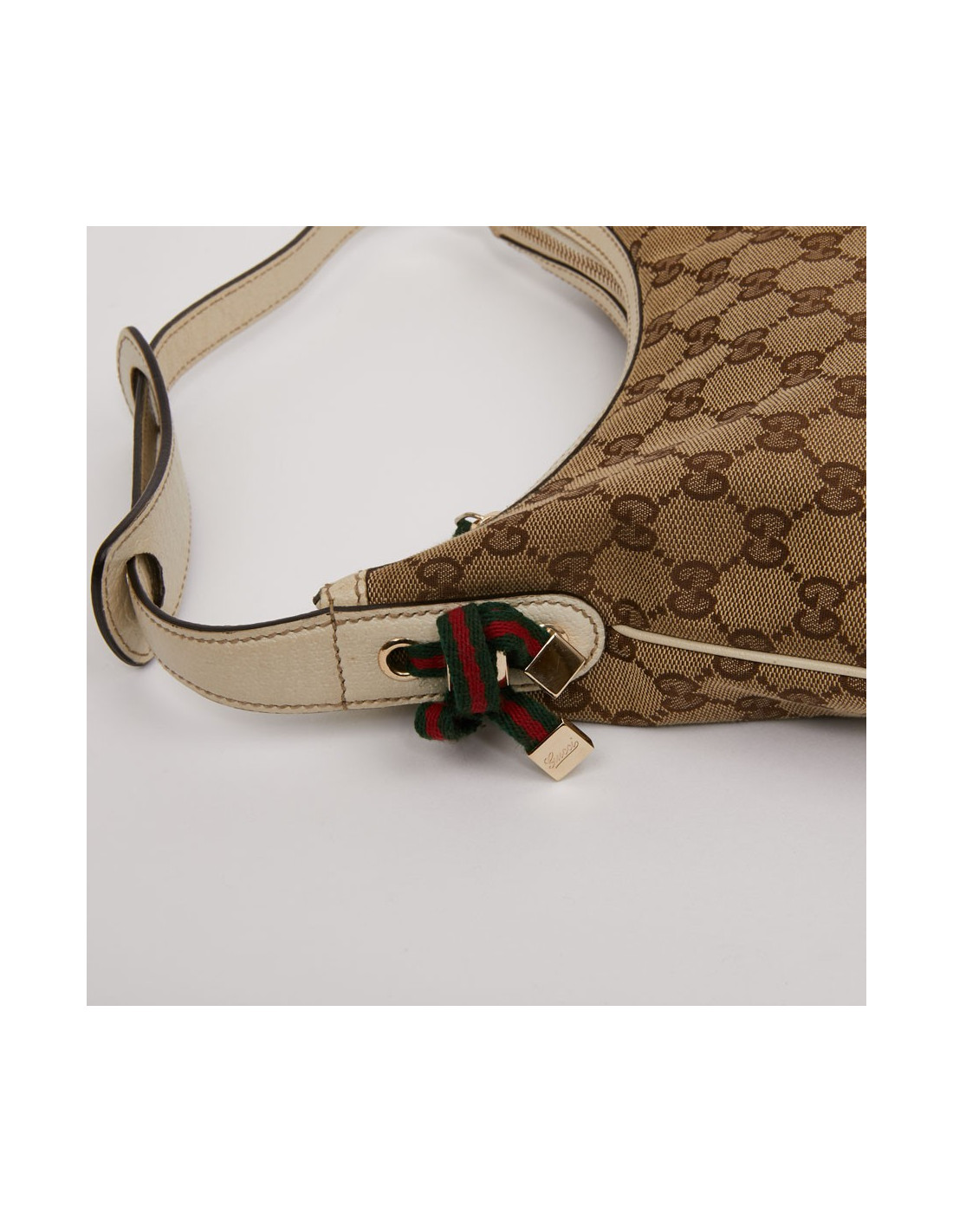 Très joli sac à main GUCCI d'occasion. Il est en toile monogramme et cuir beige. Il se porte à l'épaule grâce à son anse en cuir. L'intérieur est en tissu marron, avec une petite poche plate et une poche pour smartphone. Il a un noeud bande web (vert et rouge) sur le côté. Il est en parfait état, aucune usure des coins.