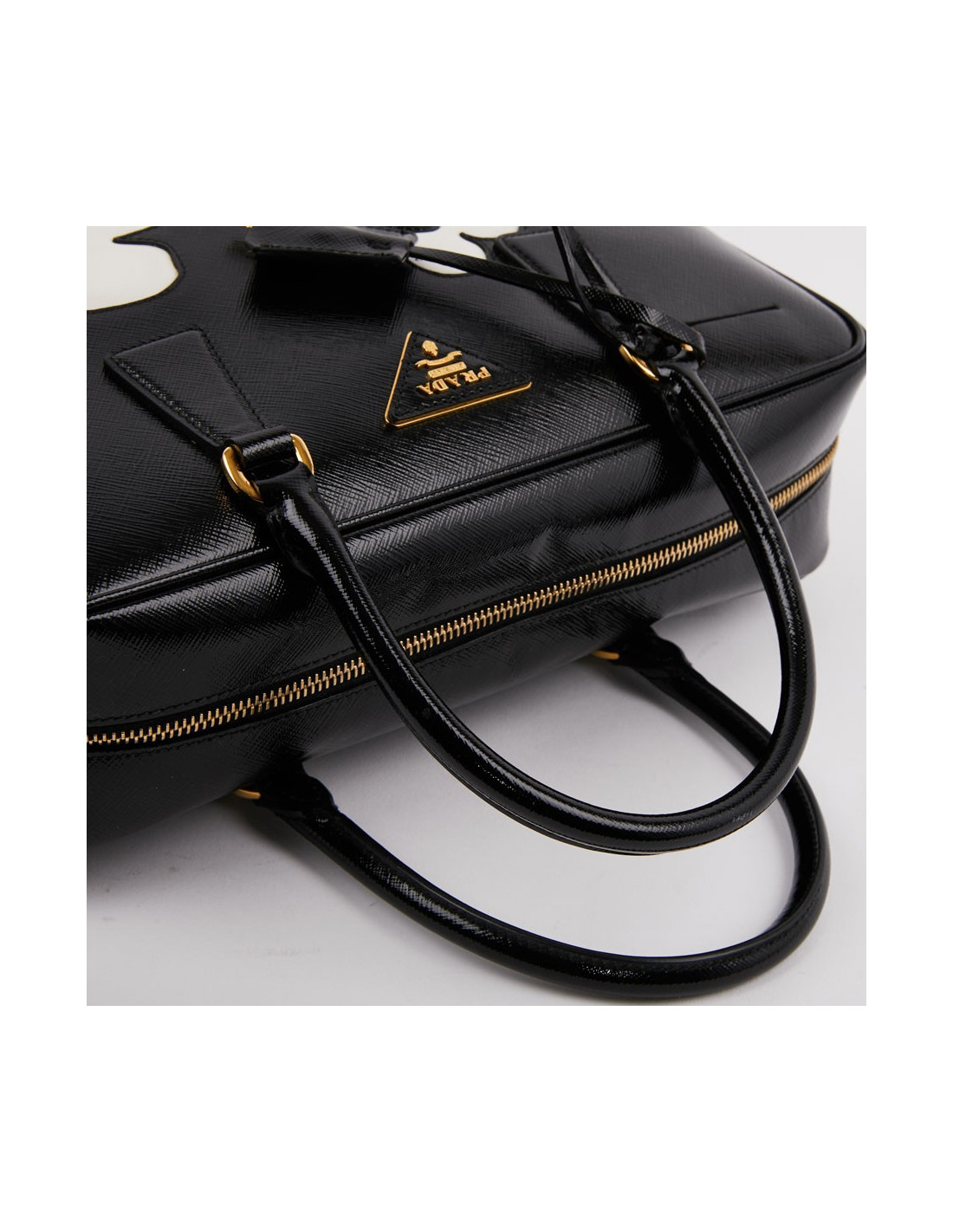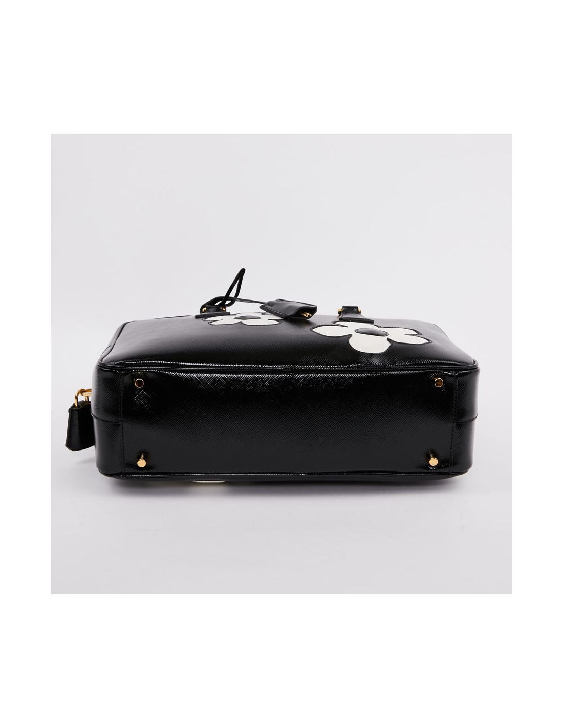 Magnifique sac PRADA d'occasion en cuir Saffiano verni noir avec de chaque côté deux grosses fleurs blanches incrustées. Il a une fermeture éclair. La doublure est en toile monogrammée "PRADA". Il y a 4 poches plates dont une zippée. Les ferrures sont en métal doré. Il se porte à la main ou à l'épaule par une bandoulière amovible (ajustable). Sur le côté se trouve un cadenas, avec clés dans la clochette. Il est en parfait état aucune usure visible. 4 petits clous sous le sac.
