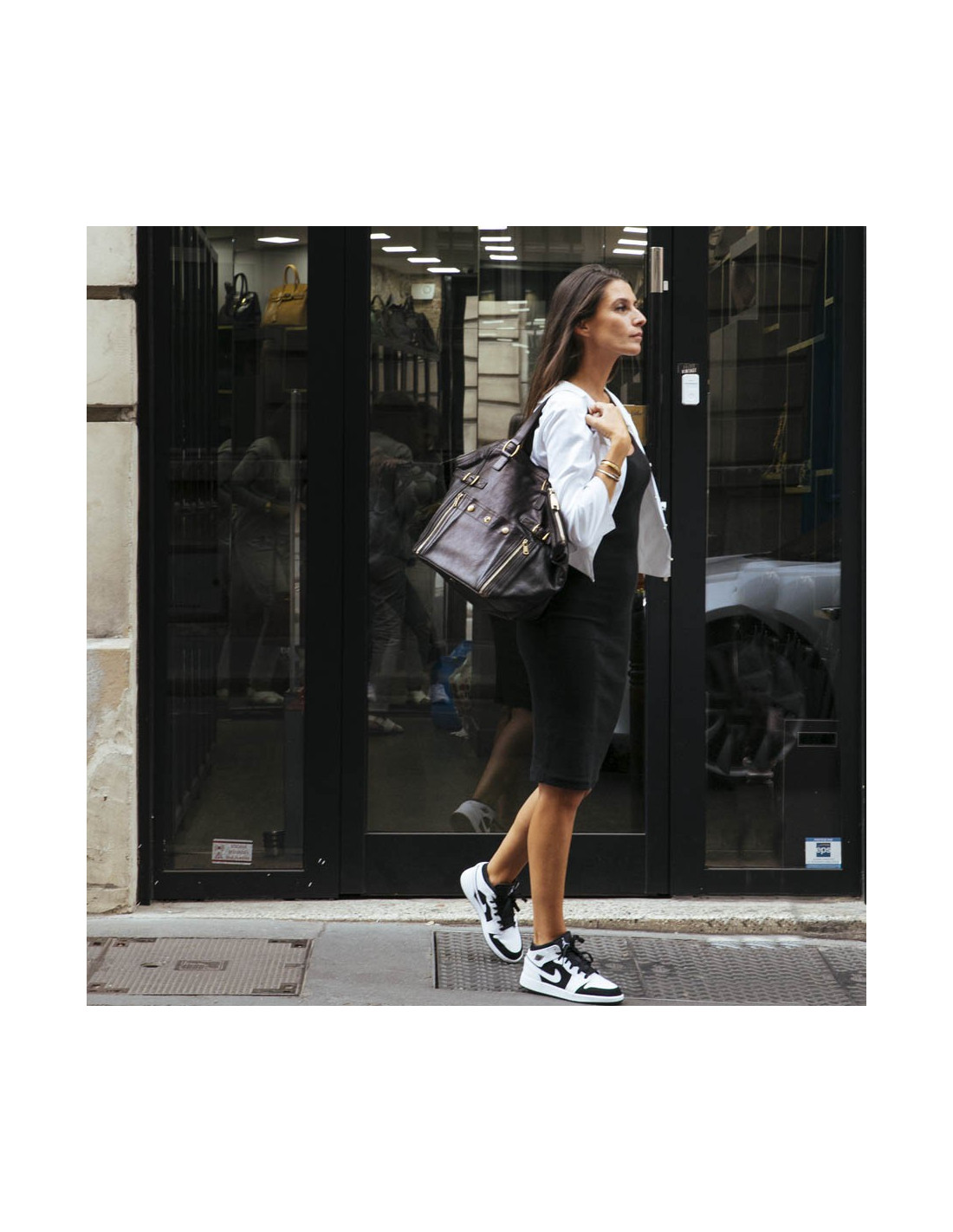 Porté épaule ou au bras. Vous trouverez un bouton pression sous le sac et qui vous permettra d'agrandir ou rétrécir le sac.