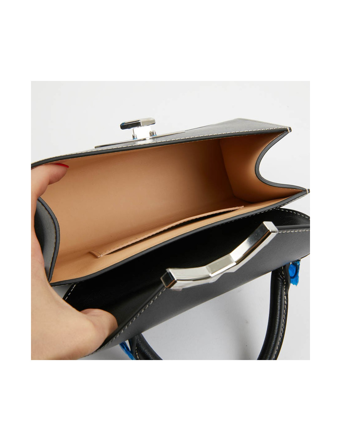 Petit sac Gabrielle de la Maison MOYNAT. Il est en cuir de veau noir avec une surpiqûre blanche. La bijouterie est en argent palladié. Un fermoir V pivotant laisse apparaître un M comme MOYNAT. La doublure est en cuir beige, une petite poche fente. ce sac se porte à main avec sa poignée en cuir ou à l'épaule avec sa bandoulière amovible.