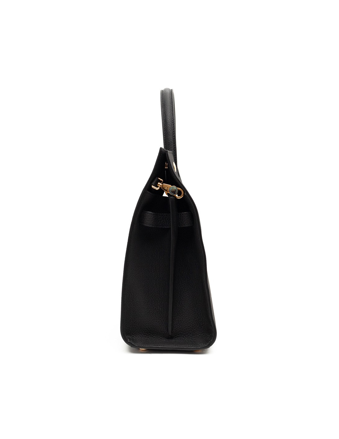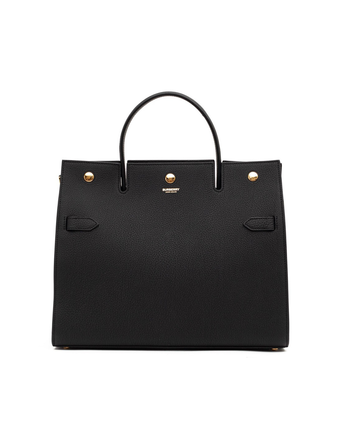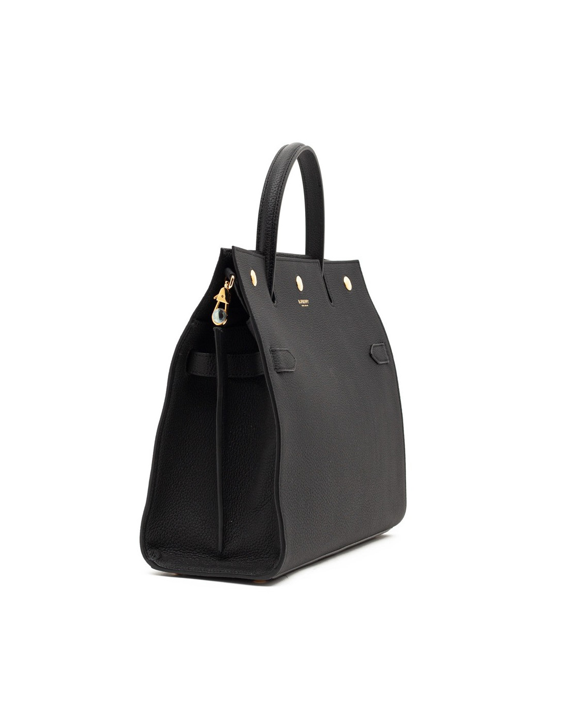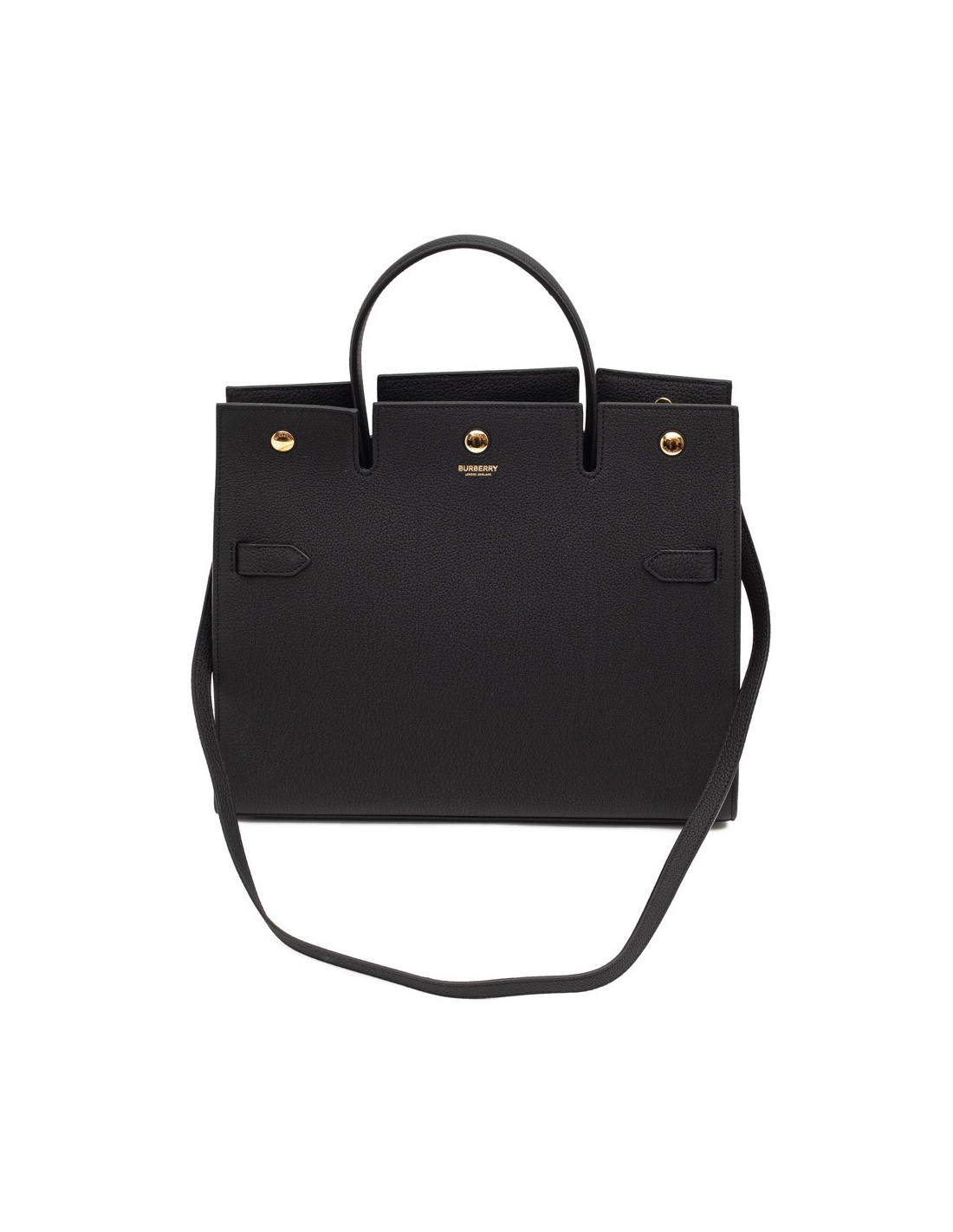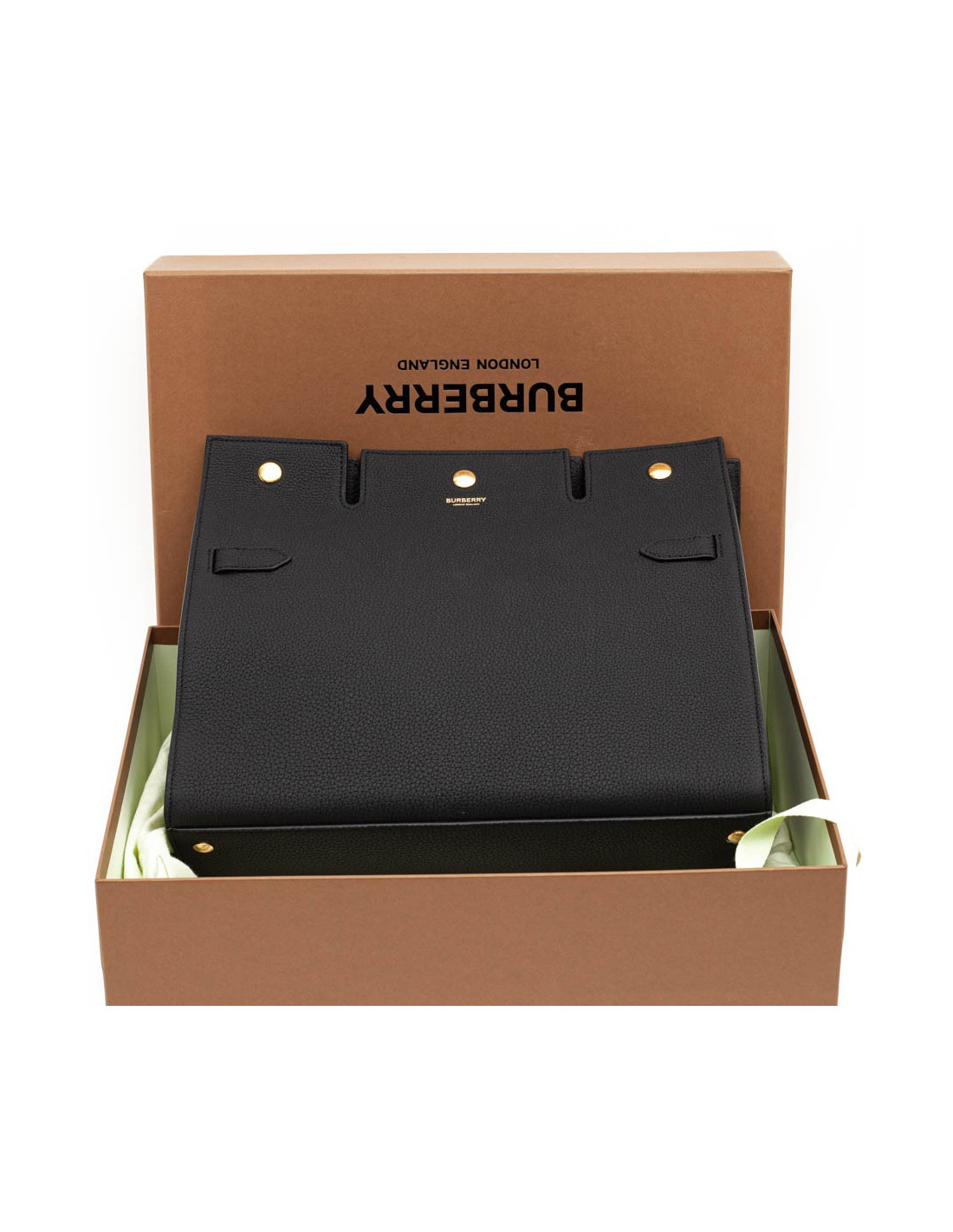 Sac rigide de la Maison BURBERRY en cuir de veau grainé noir. Il se porte à la main par sa poignée en cuir pouvant pivoter vers l'intérieur d'un des deux espaces de rangement pour se laisser porter à l'épaule par une bandoulière amovible. L'accastillage est doré, fermeture par bouton pression. Lettrage embossé à l'avant du sac au nom de la marque. Il est doublé en coton avec une poche avec fermeture à glissière.