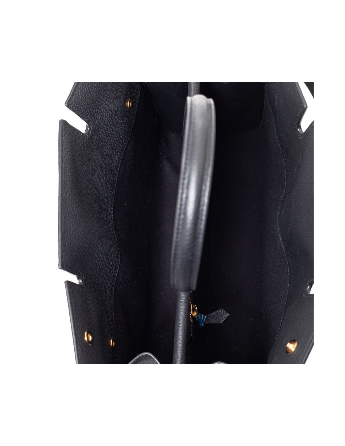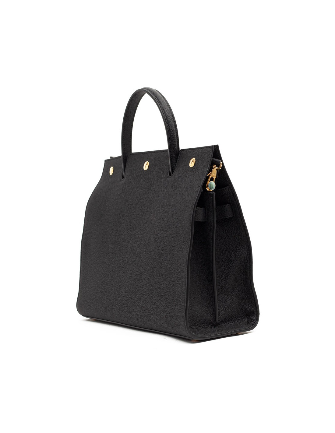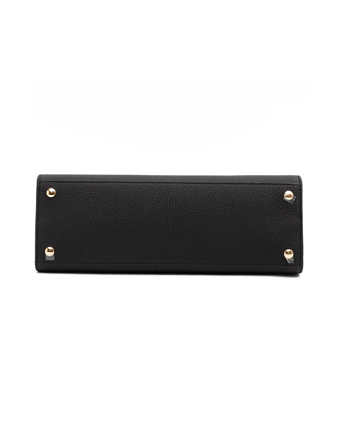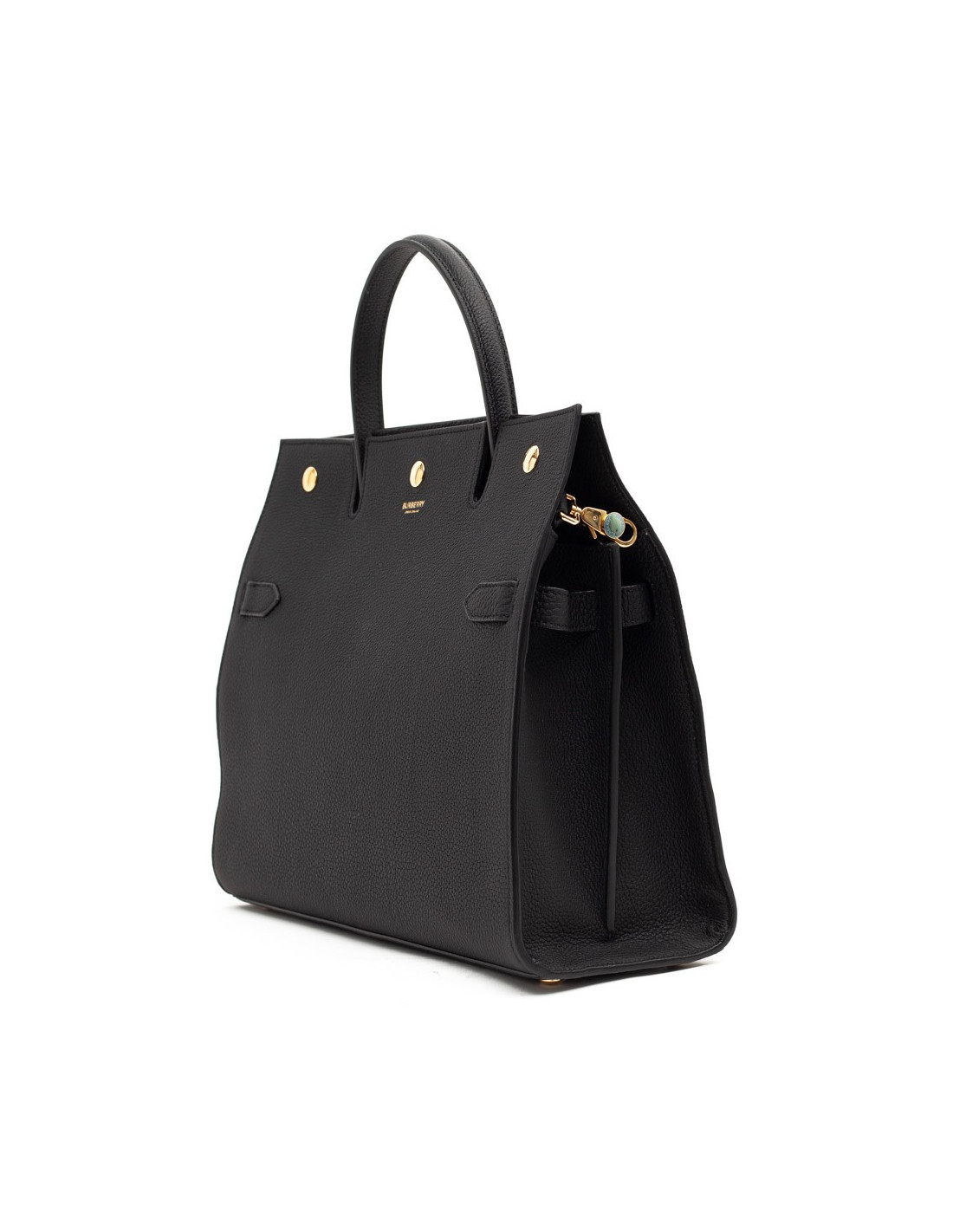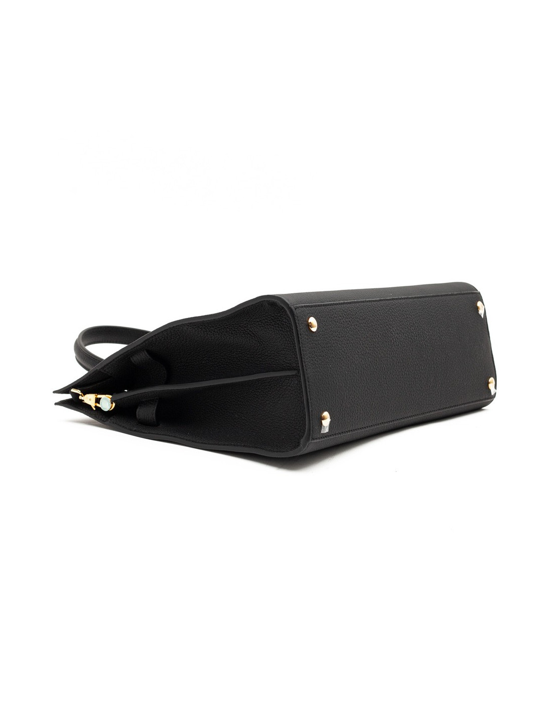 Sac rigide de la Maison BURBERRY en cuir de veau grainé noir. Il se porte à la main par sa poignée en cuir pouvant pivoter vers l'intérieur d'un des deux espaces de rangement pour se laisser porter à l'épaule par une bandoulière amovible. L'accastillage est doré, fermeture par bouton pression. Lettrage embossé à l'avant du sac au nom de la marque. Il est doublé en coton avec une poche avec fermeture à glissière.