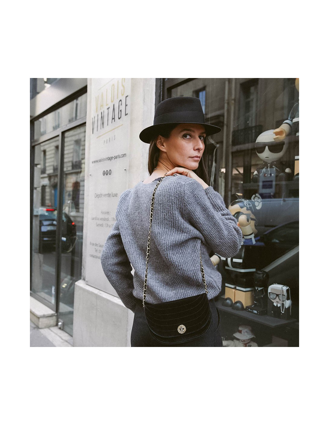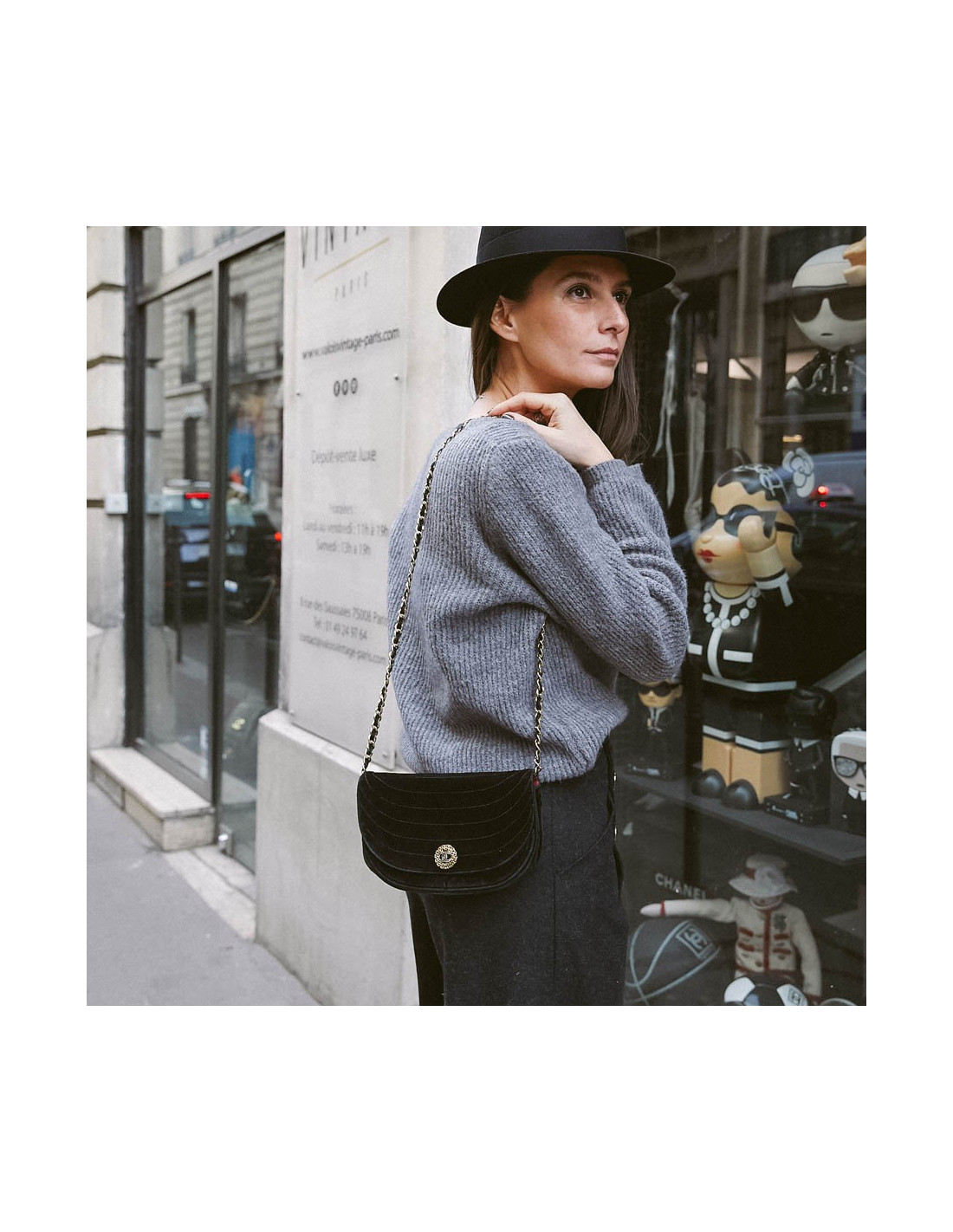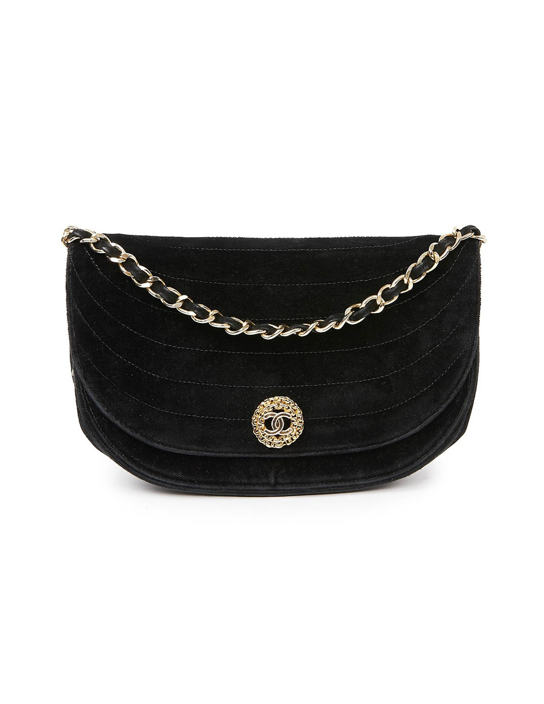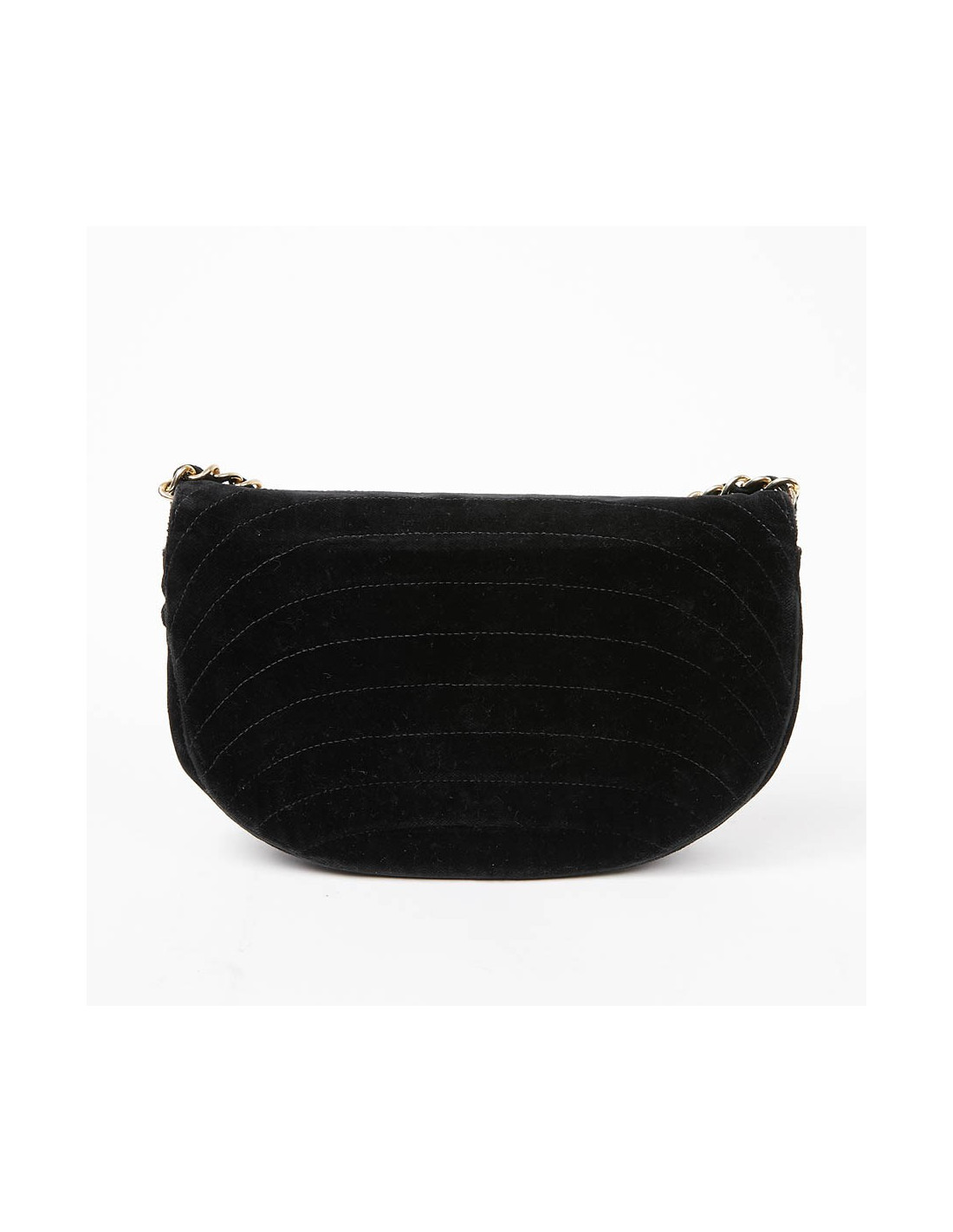 Un vrai bijou du soir signé la Maison CHANEL en velours noir. Ravissant avec une robe ou un pantalon. L'intérieur est en piqué bordeaux avec une poche zippée. Fermeture par bouton pression. Il se porte à l'épaule ou en crossover à l'aide d'une bandoulière en chaîne doré et velours noir.