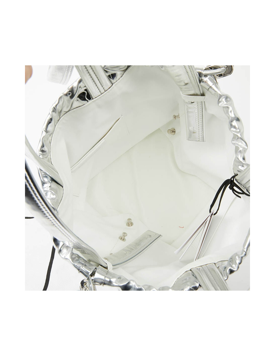 Ce sac a été réalisé dans la fameuse cotte de maille, métal argenté matière mythique créée par Paco Rabanne. Il manie à la fois souplesse et rigidité du cuir avec la fluidité de la cotte de maille. Il est doublé de cuir blanc.