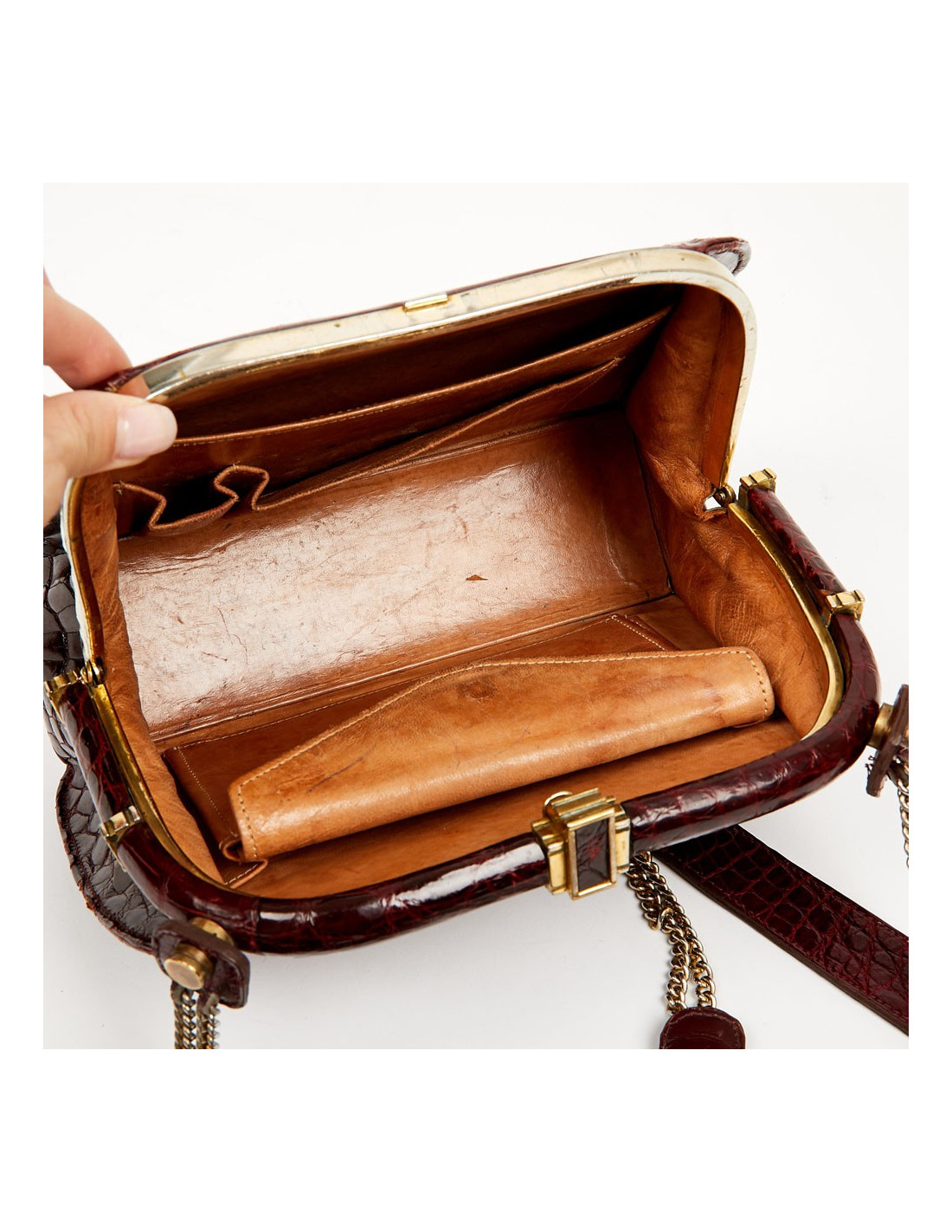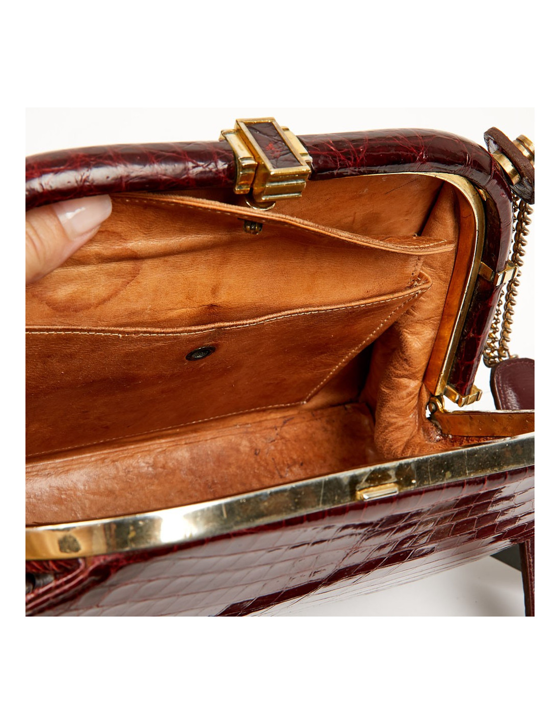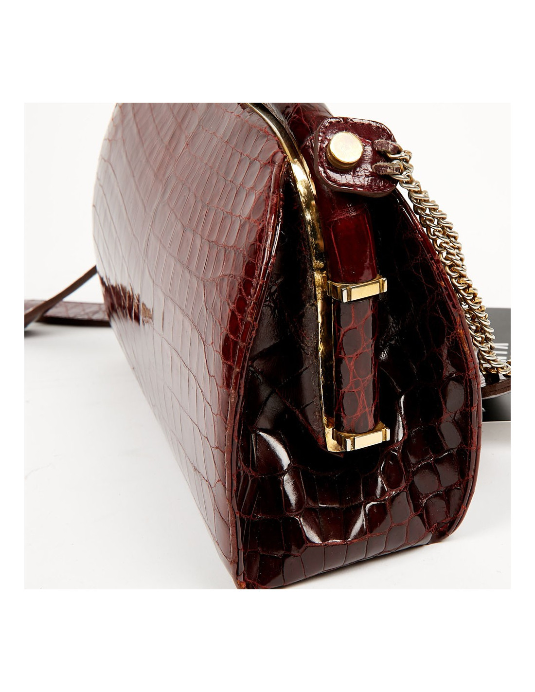 Ce très joli sac vintage est en véritable crocodile bordeaux avec une bijouterie en métal doré. Il s'ouvre par un fermoir à bascule. La doublure intérieure est en cuir couleur naturelle. On le place dans la catégorie bon état car il a une légère usure sur les côtés du sac et des taches sont visibles sur le cuir intérieur.