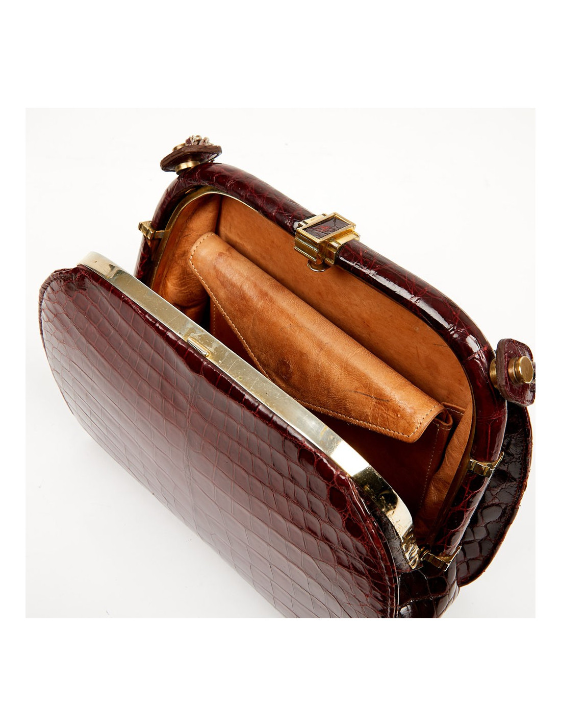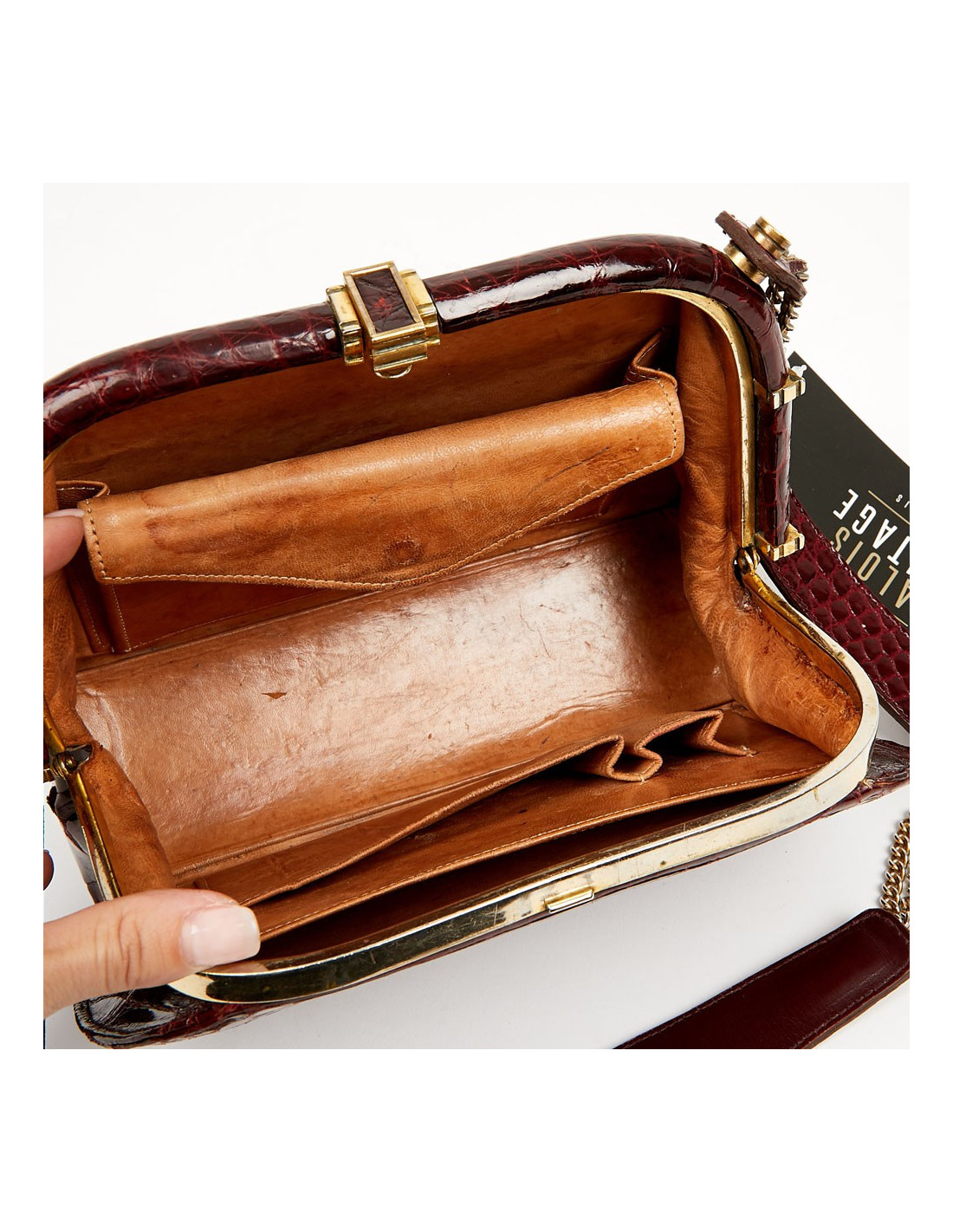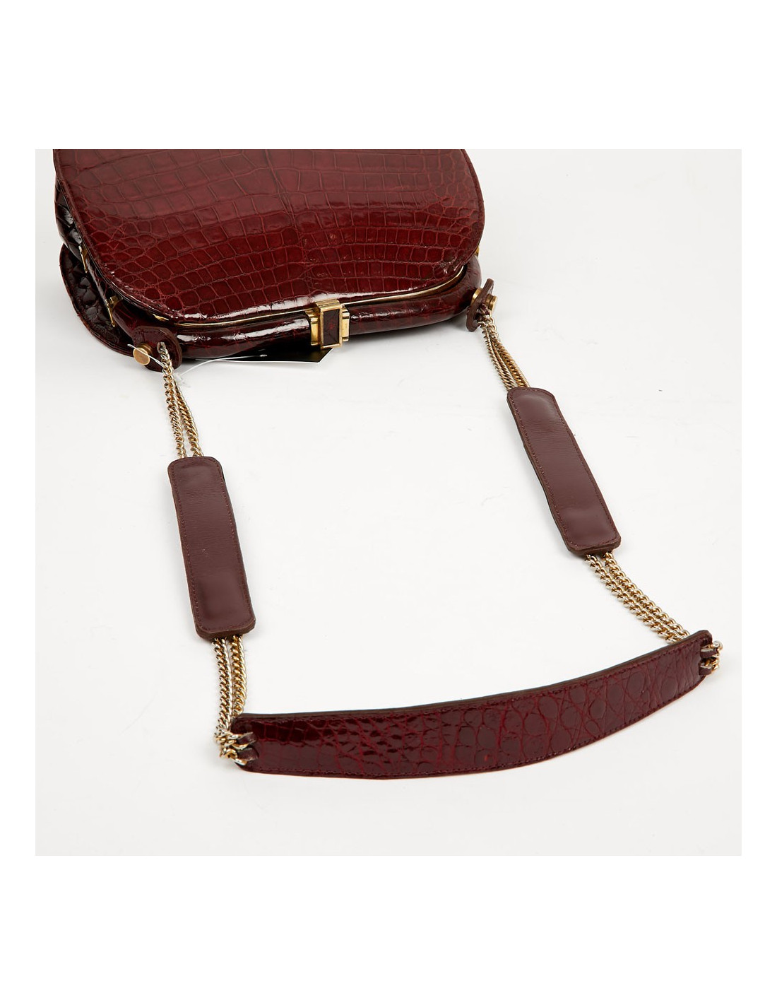 Ce très joli sac vintage est en véritable crocodile bordeaux avec une bijouterie en métal doré. Il s'ouvre par un fermoir à bascule. La doublure intérieure est en cuir couleur naturelle. On le place dans la catégorie bon état car il a une légère usure sur les côtés du sac et des taches sont visibles sur le cuir intérieur.
