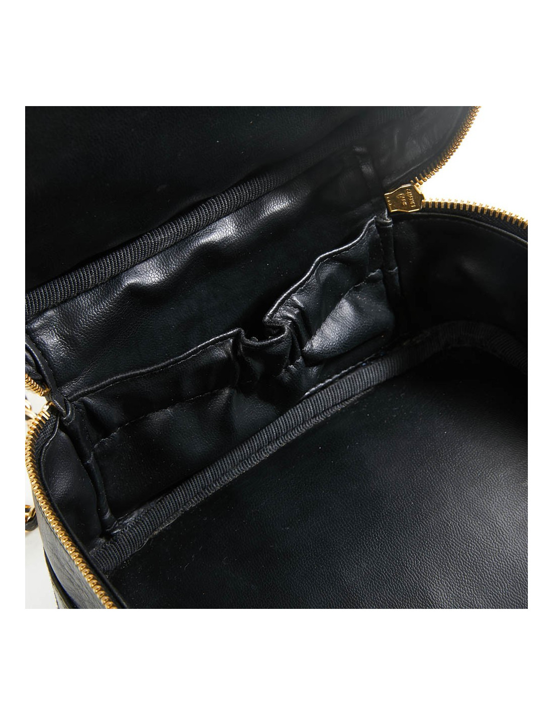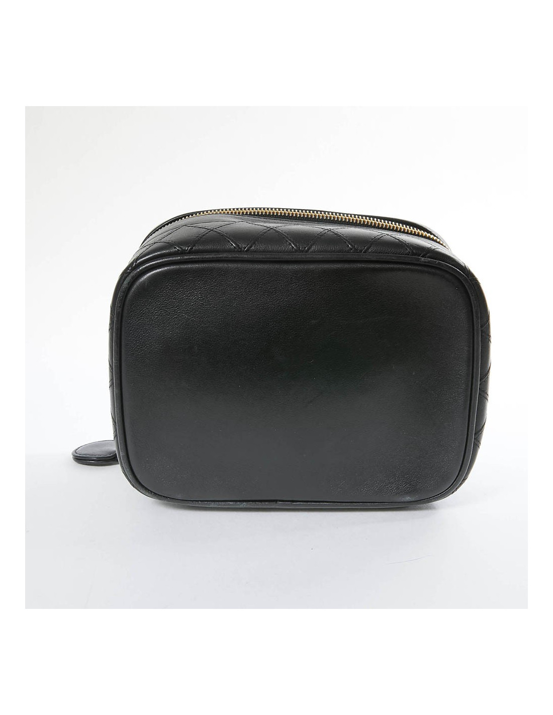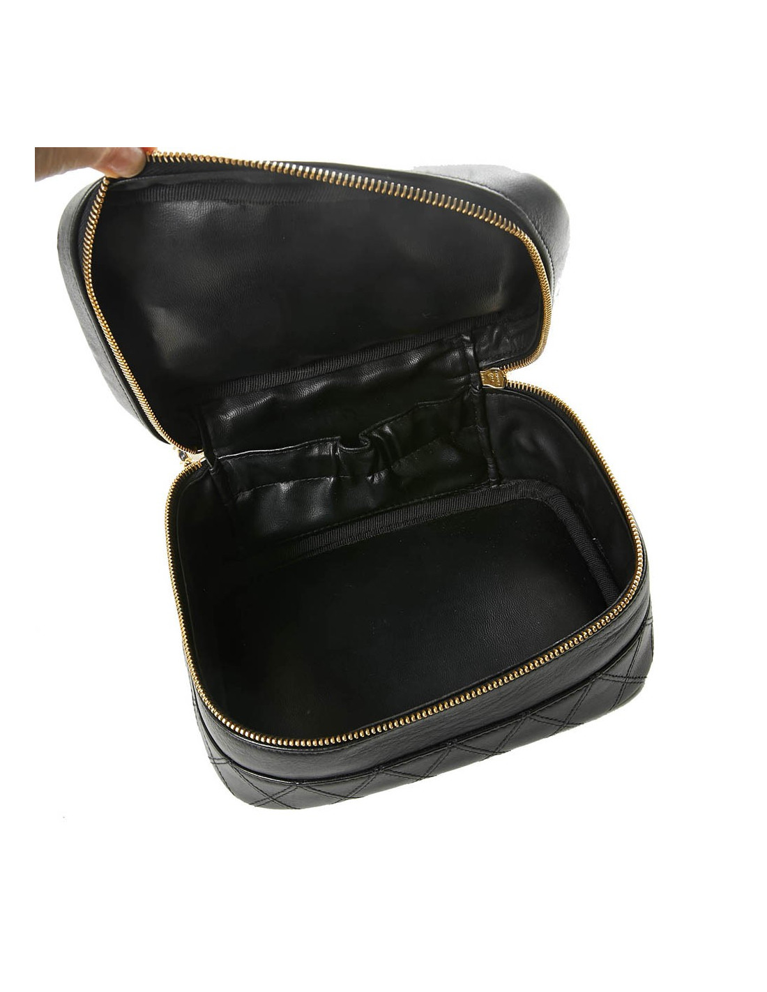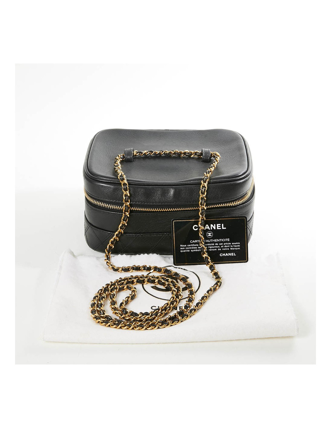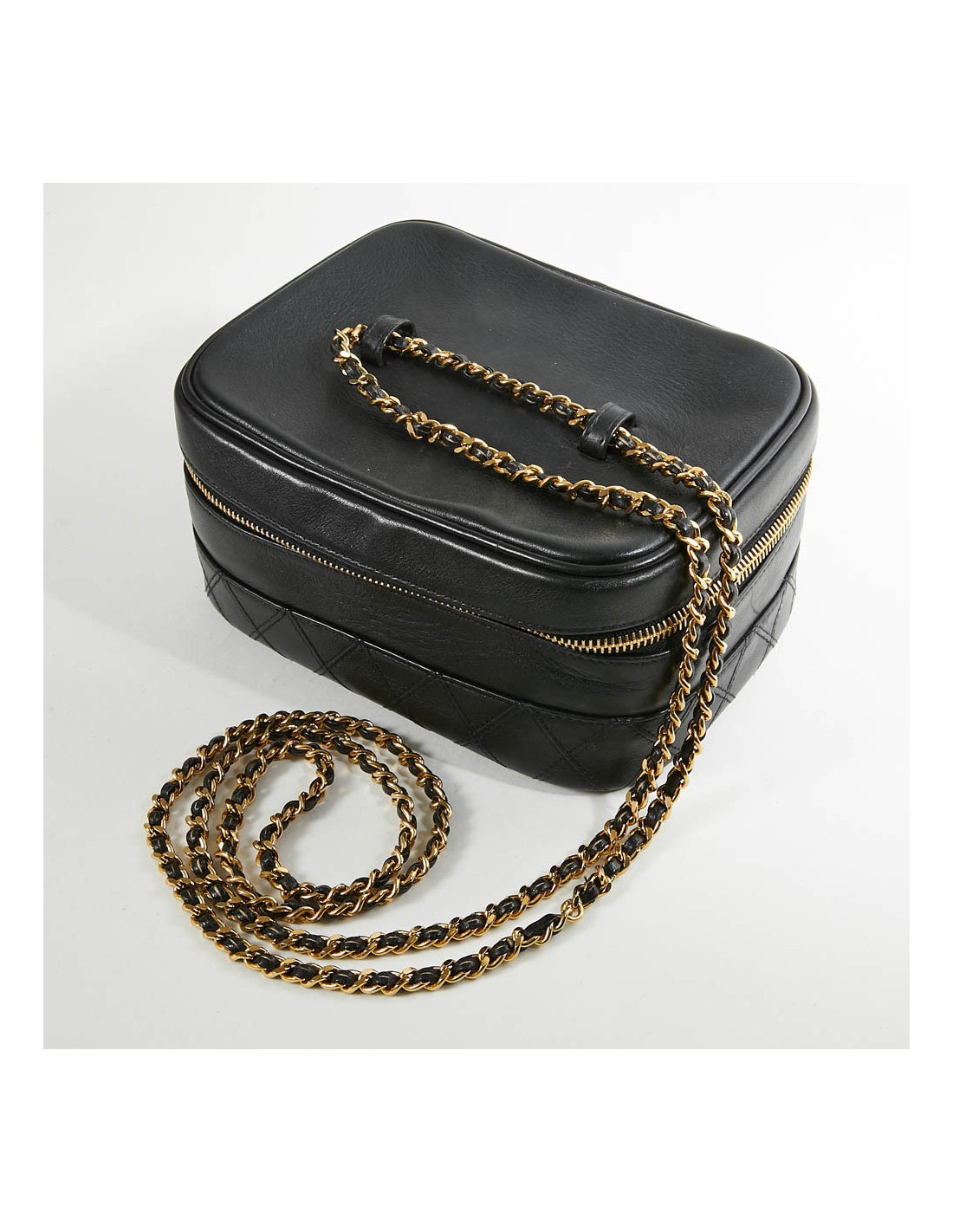 Ce sac, à l'origine servait de boite à bijoux. Avec la tendance vintage, il sera détourné comme un sac de jour. La chaîne métal doré entrelacé de cuir a été remplacée à l'identique. Il se porte à l'épaule ou croisé. C'est un cuir lisse et matelassé. Se ferme par une fermeture à glissière. Il est doublé en plastique noir avec une poche fente.