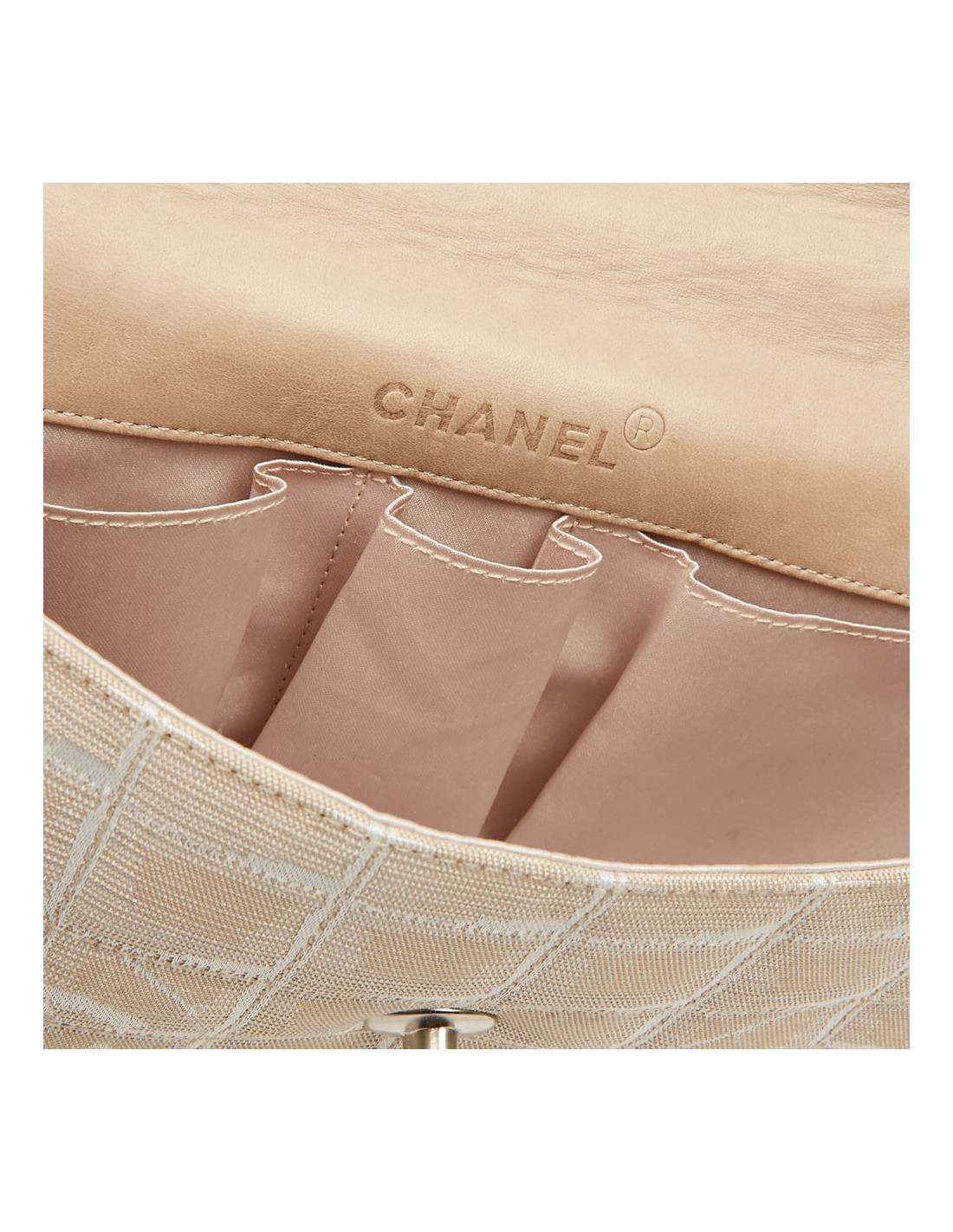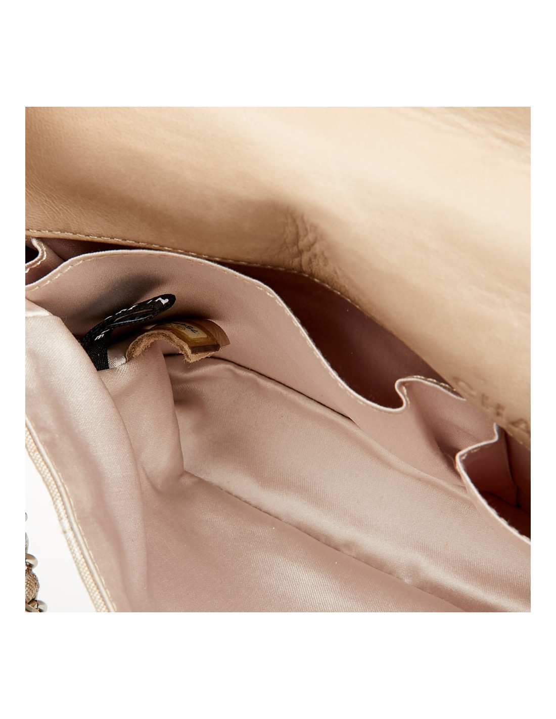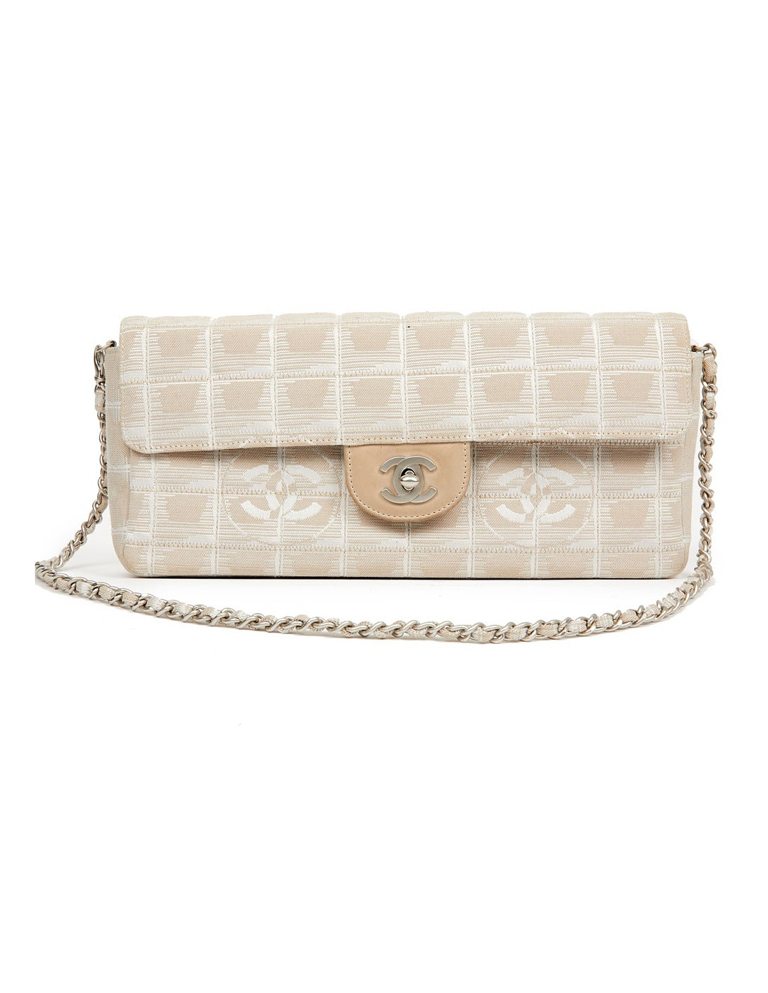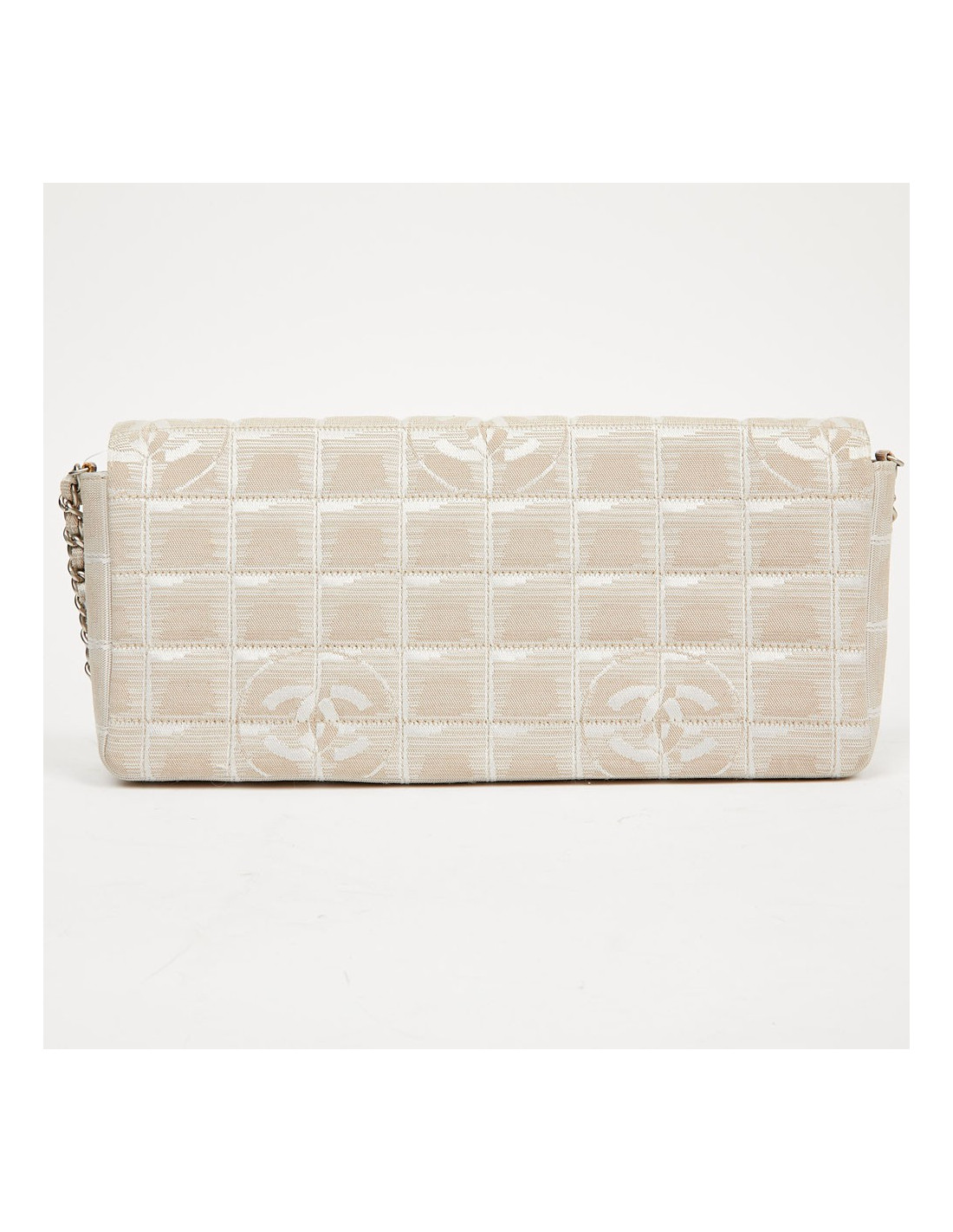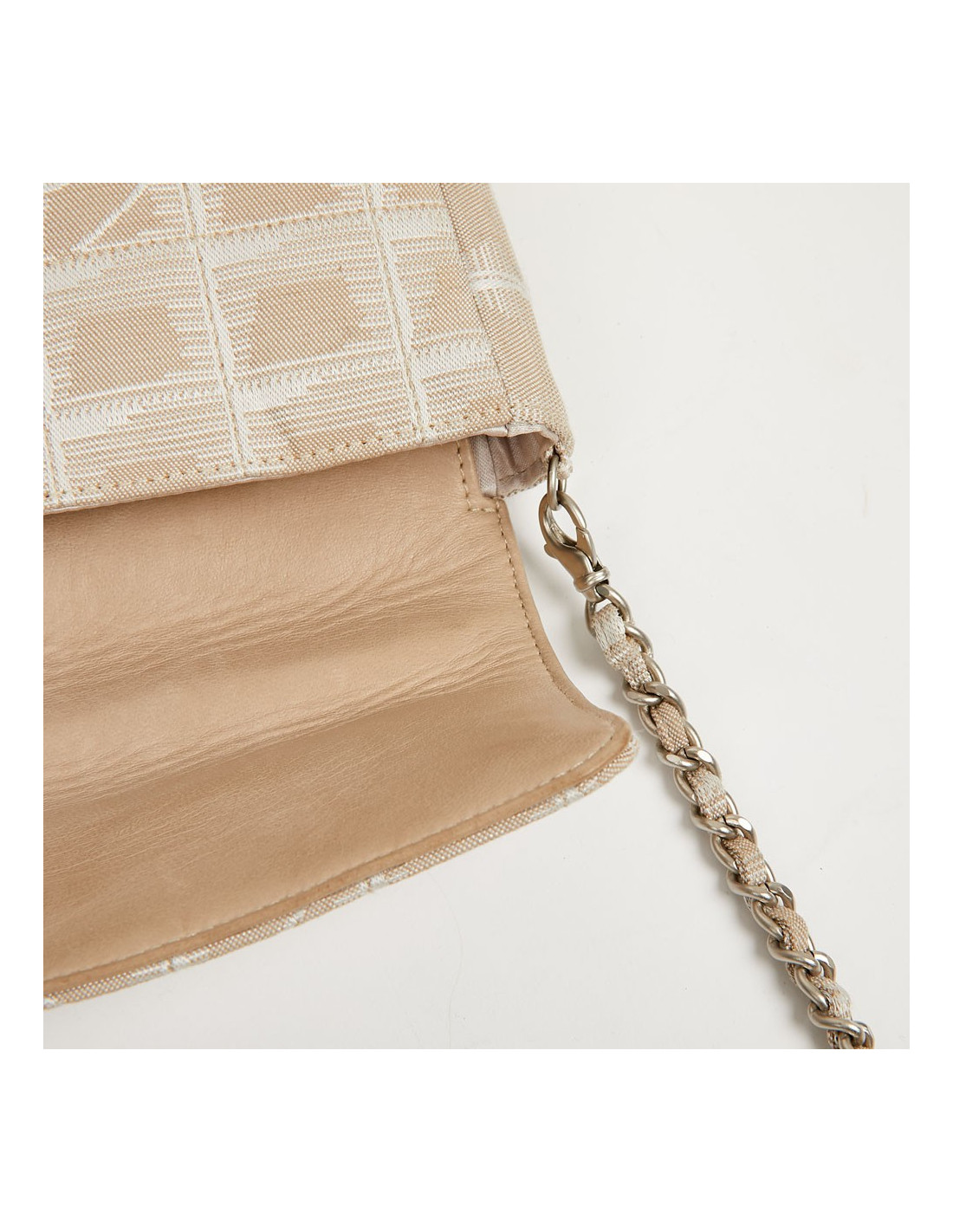 Sac baguette, un modèle phare de la Maison Chanel collection 2002-2003. La languette du fermoir ainsi que le fond sous le rabat sont en cuir et la bijouterie en métal argent palladié. Il est doublé en satin gris avec 3 poches. Il se porte à l’épaule par une chaîne en métal entrelacée de cuir. En très bon état. Il se porte en pochette, la bandoulière se détache d’un côté par un mousqueton.