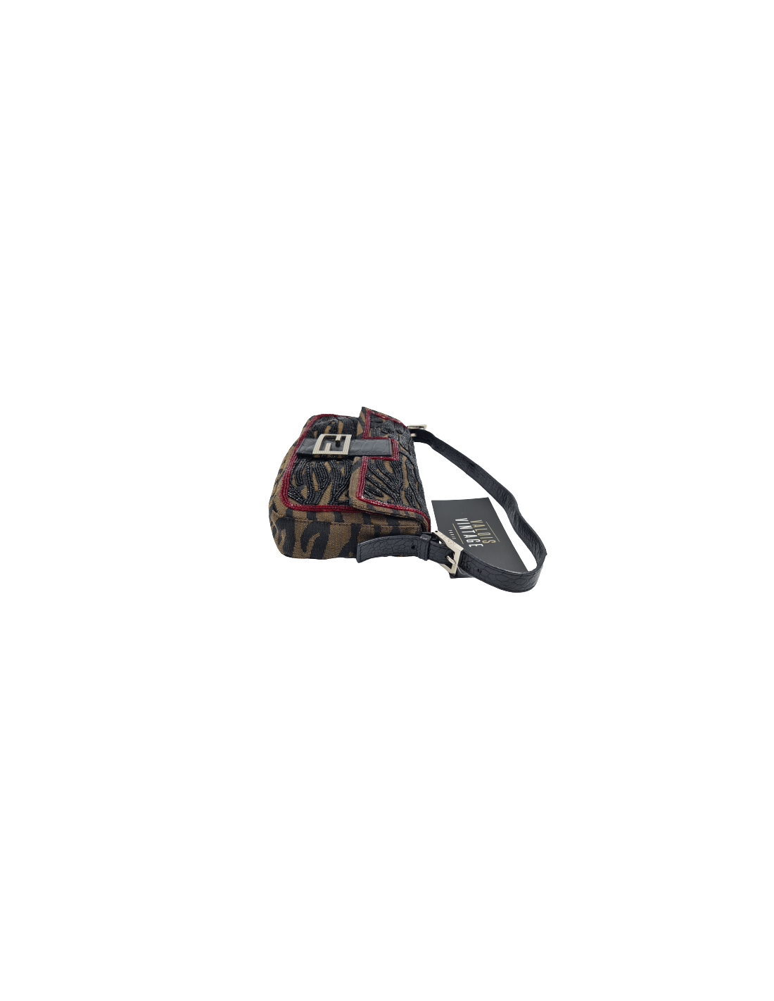Emblématique sac Baguette de la Maison FENDI en toile zébrée marron agrémentée de perles noires et bordeaux. La bijouterie est en métal argent, fermeture par un bouton aimanté. La boucle est en métal guilloché. La languette est recouverte de cuir d'autruche.