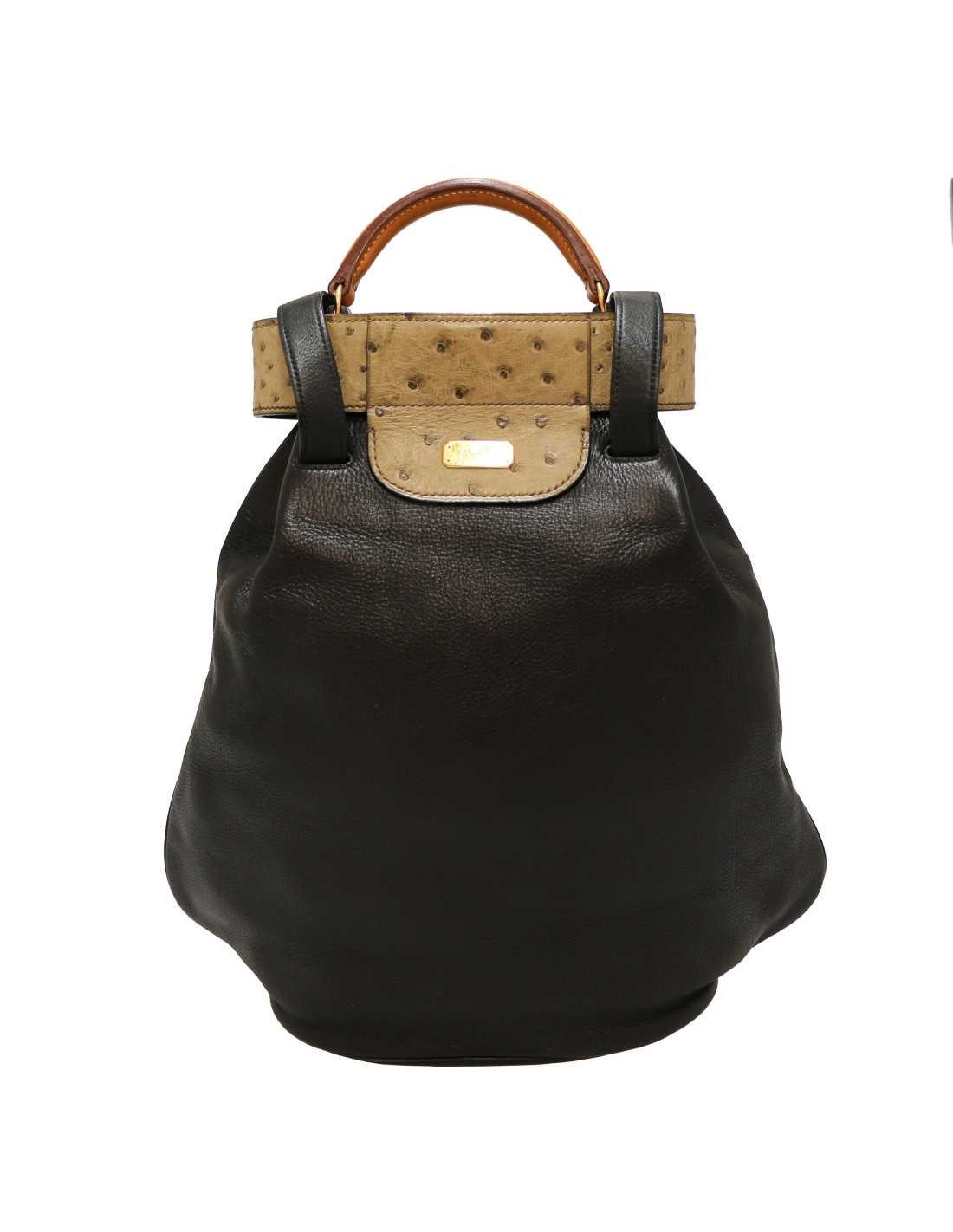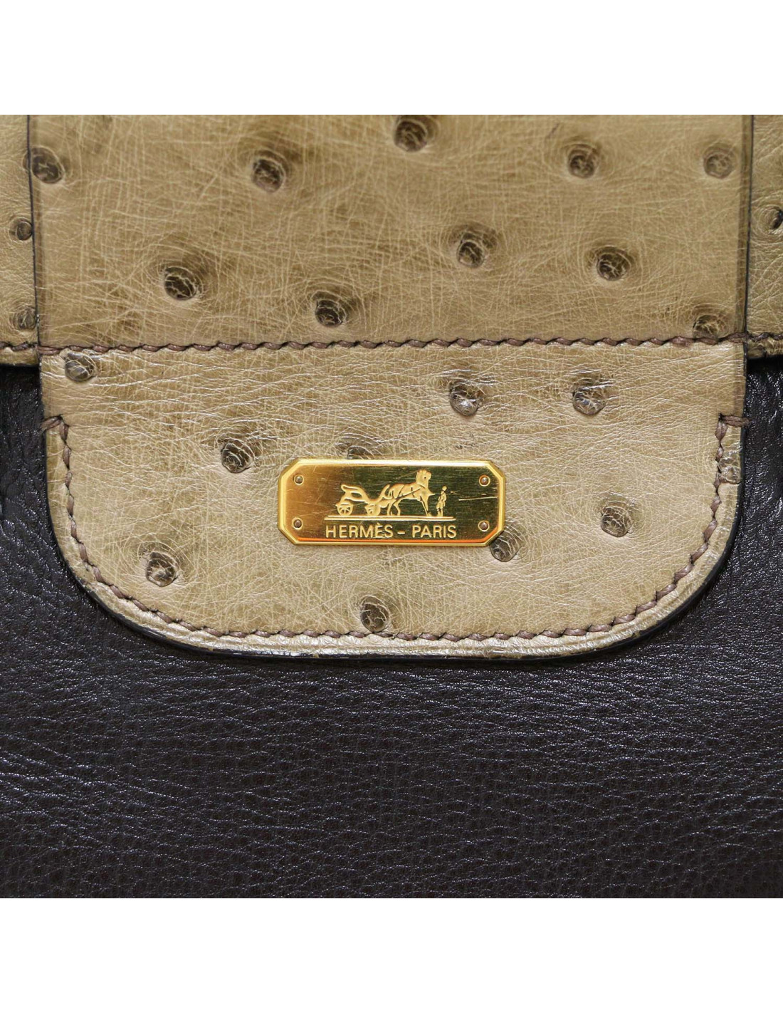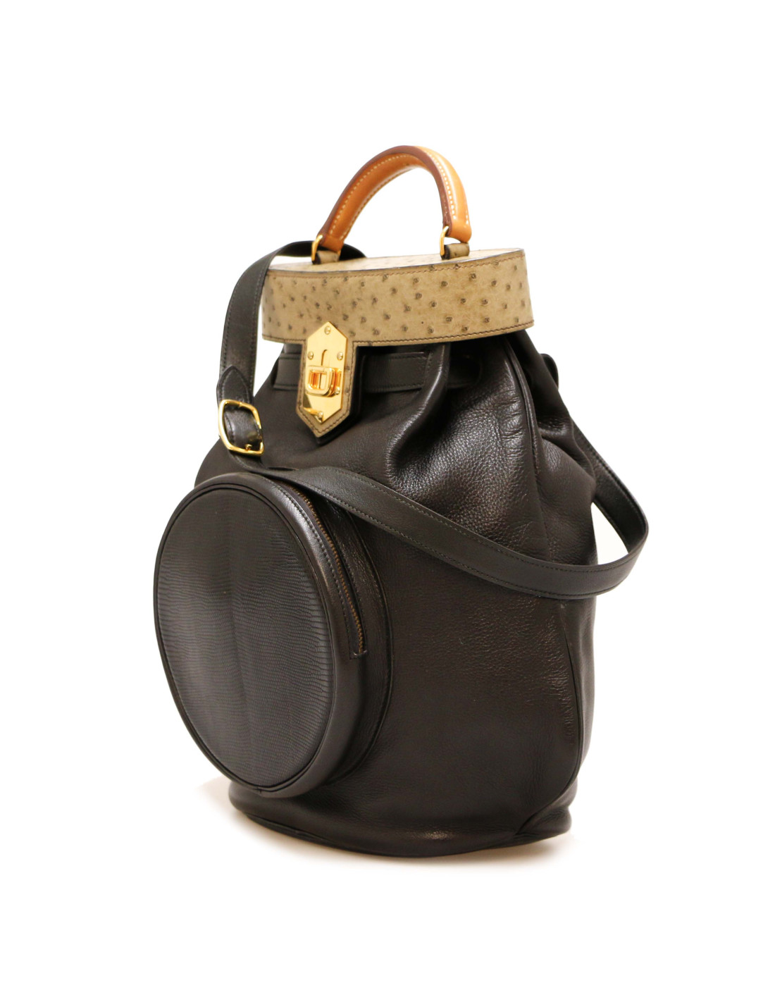 Détails : vintage, forme sac de golf, cette pièce de collection est composée de trois matières, cuir gulliver noir, lézard noir et autruche kaki. La poignée est en cuir naturel. Une poche à l'avant