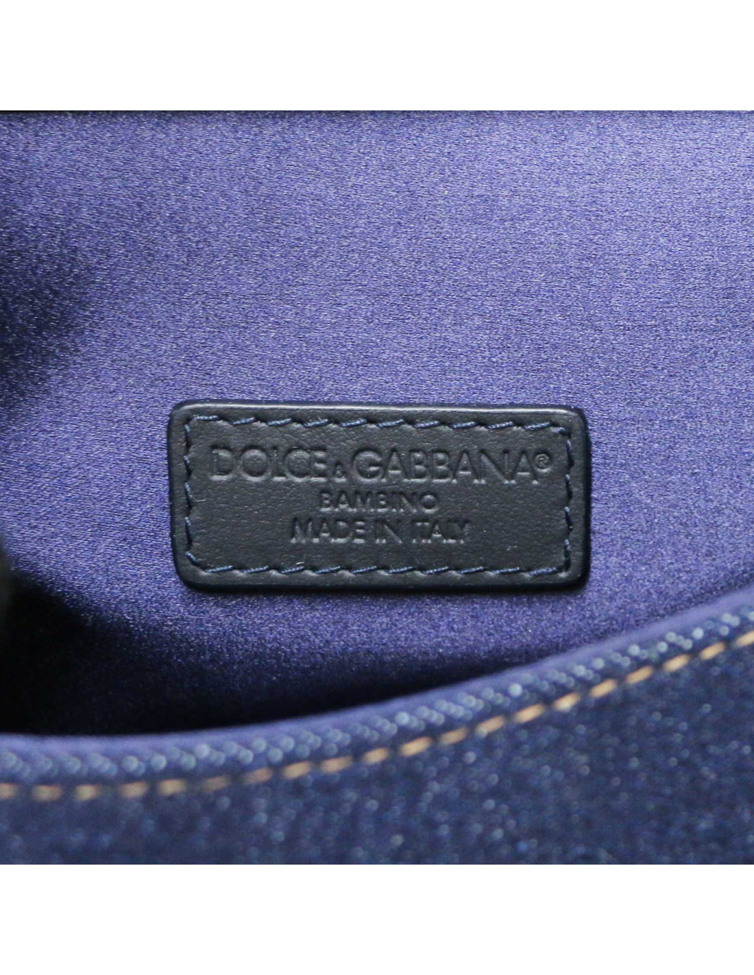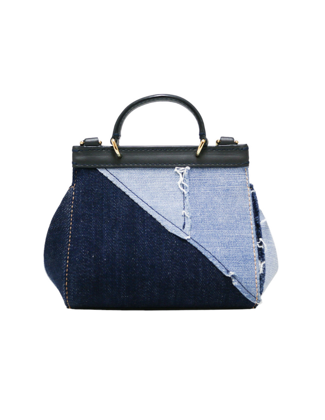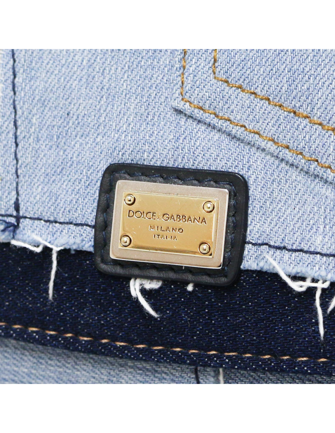 Détails : petite plaque en métal "Dolce & Gabbana Milano", fermeture par deux boutons pression, effet patchwork en denim.