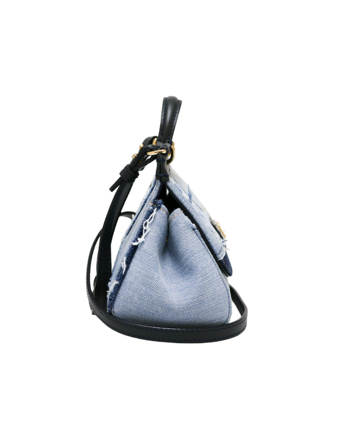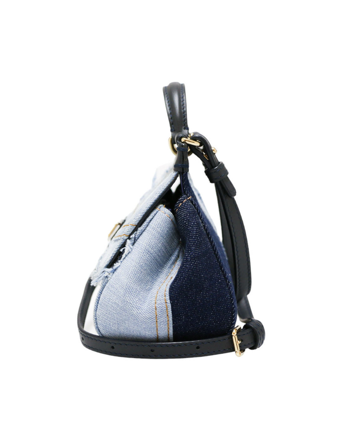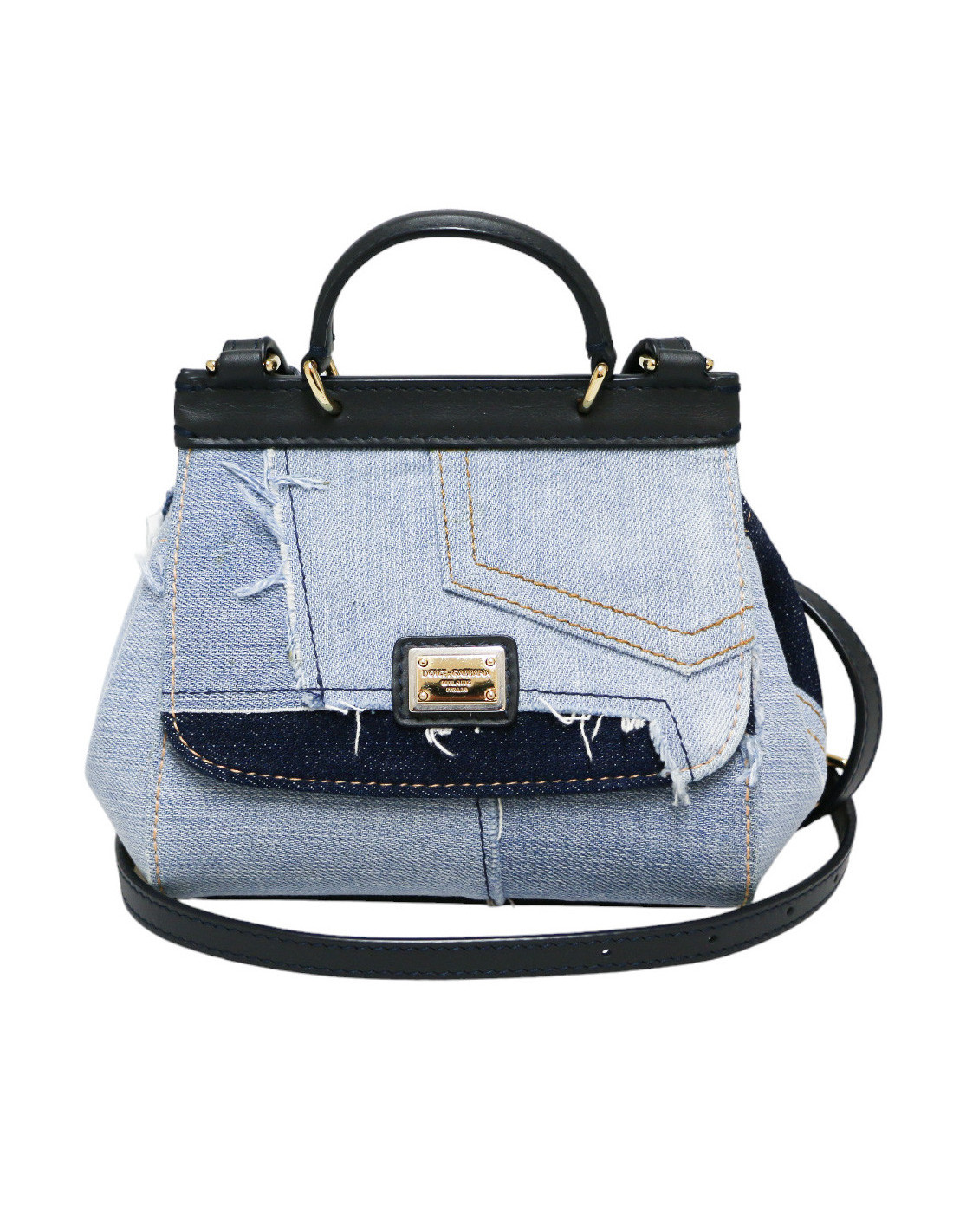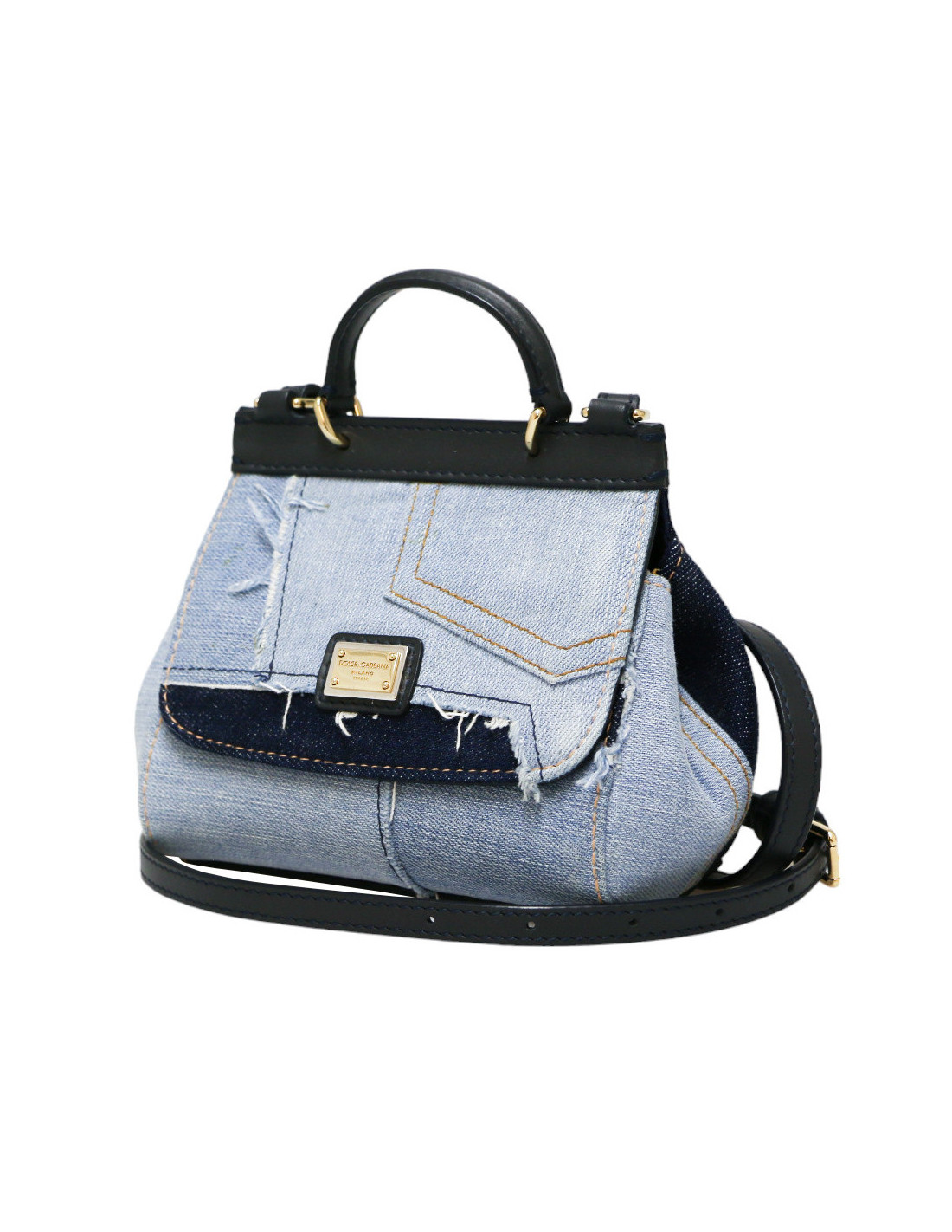 Détails : petite plaque en métal "Dolce & Gabbana Milano", fermeture par deux boutons pression, effet patchwork en denim.