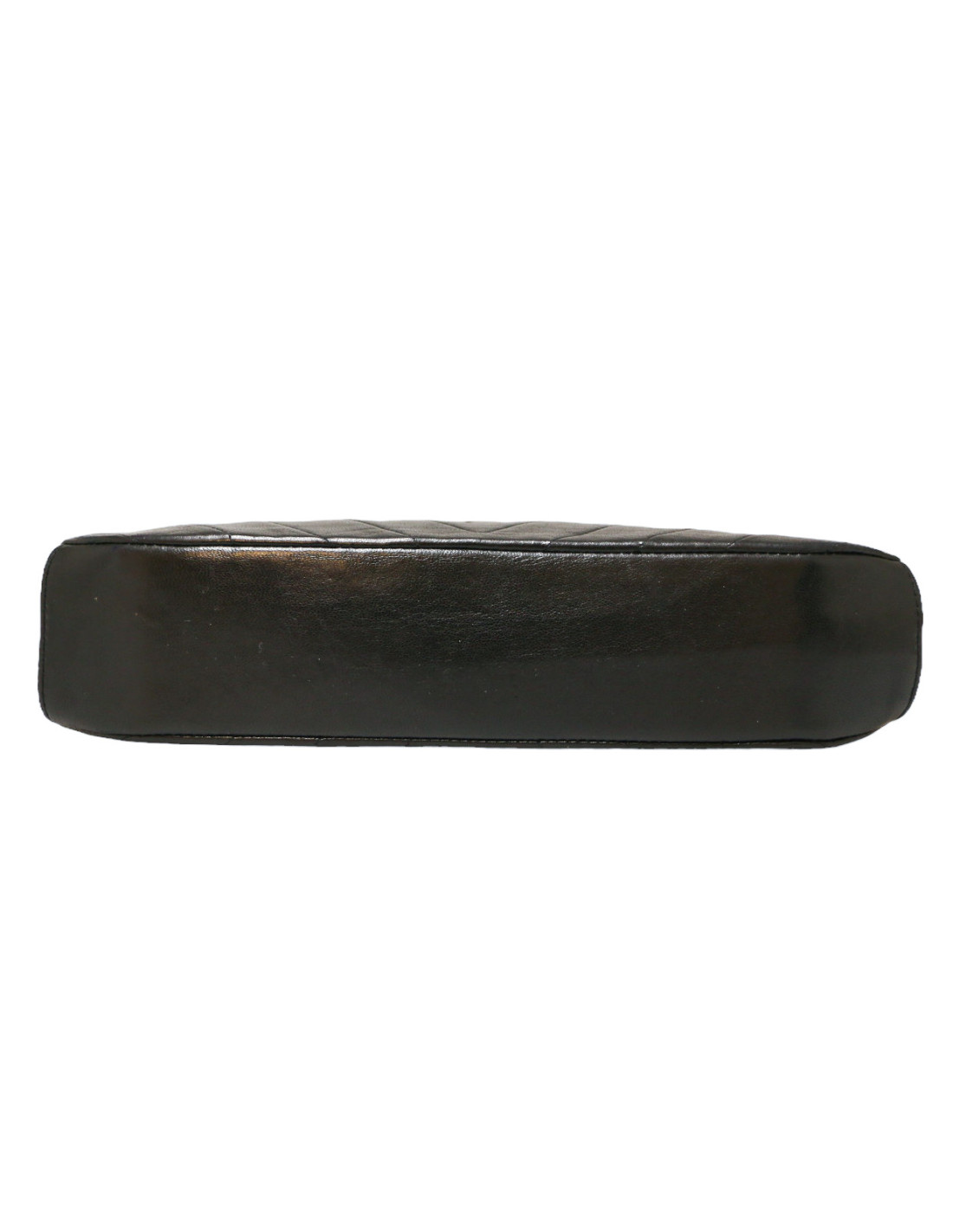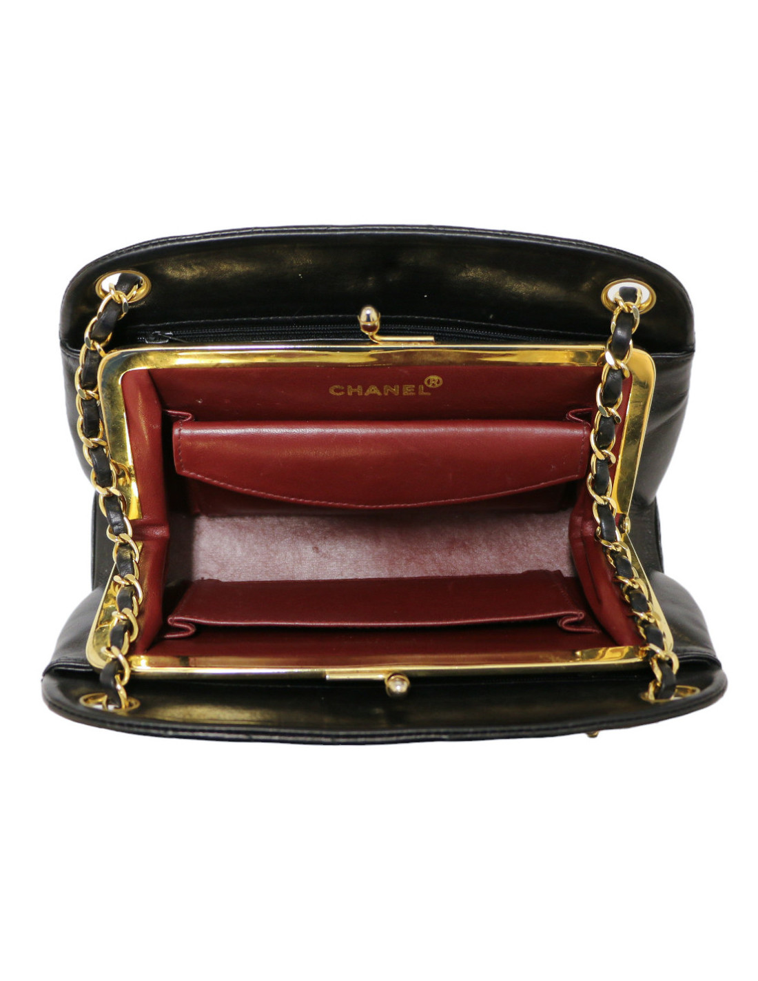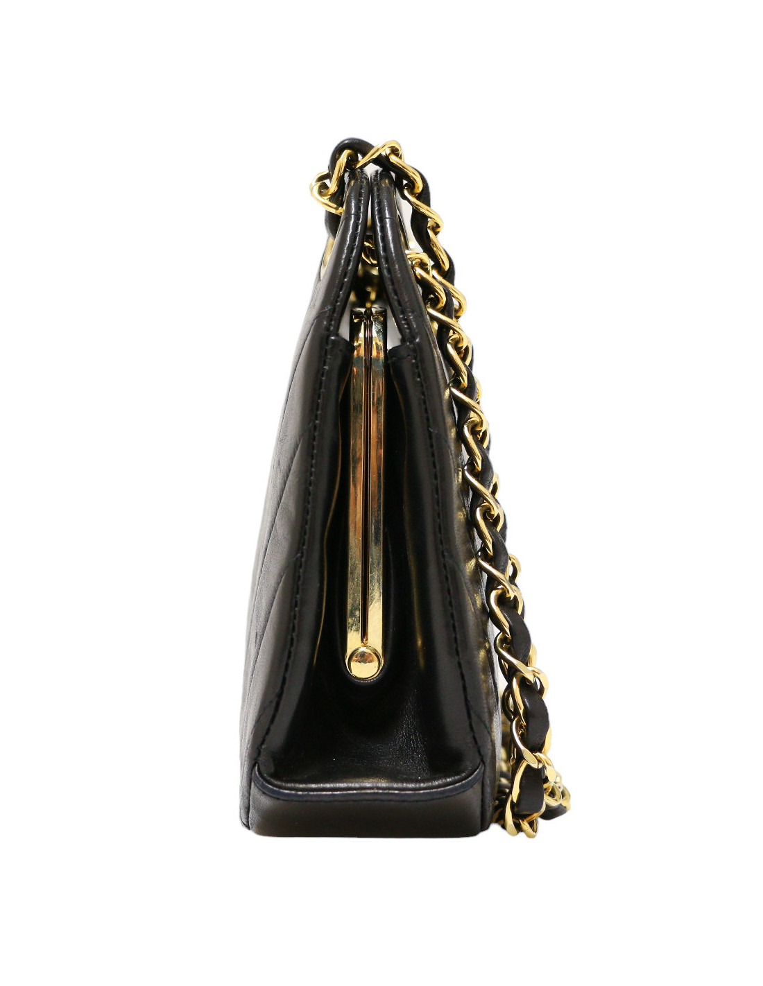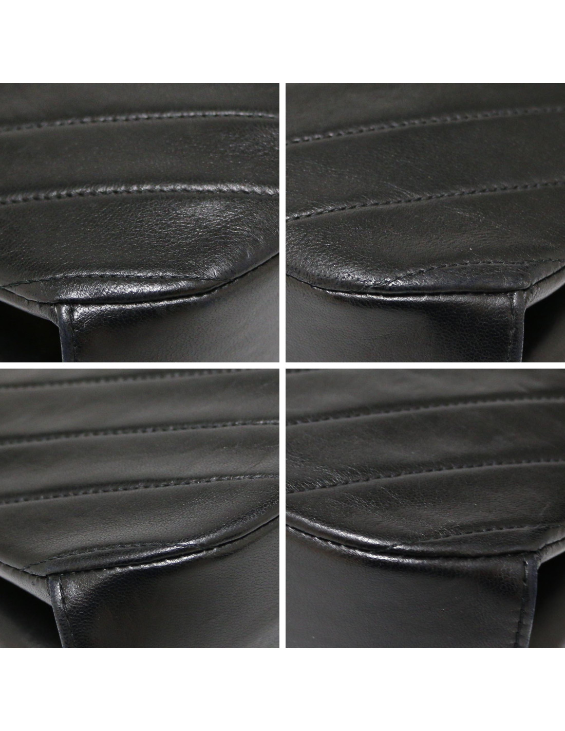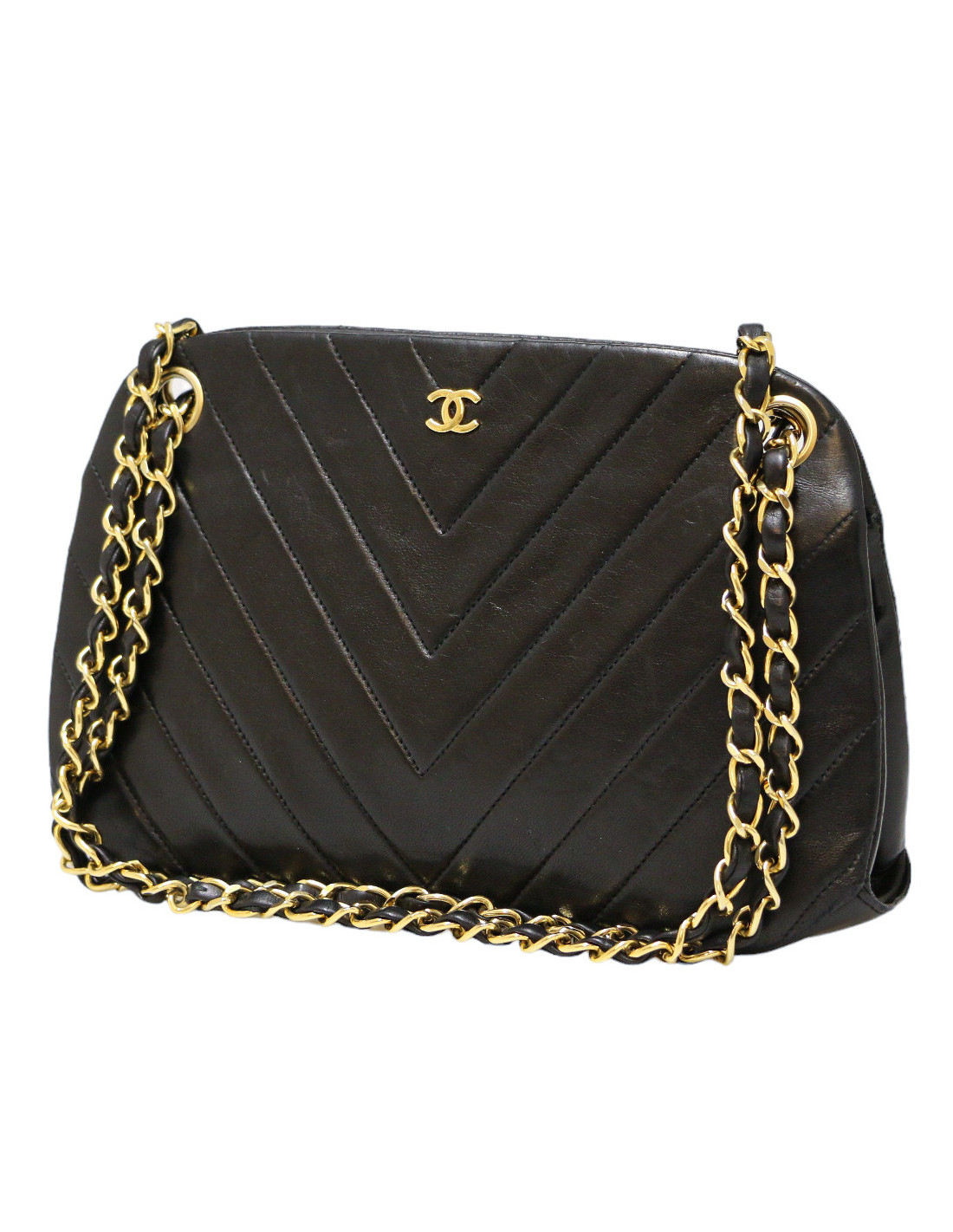 Détails : petit sac vintage qui se porte à l'épaule, deux anses en chaîne dorée entrelacée de métal. Cuir chevron, petit CC doré sur l'avant du sac