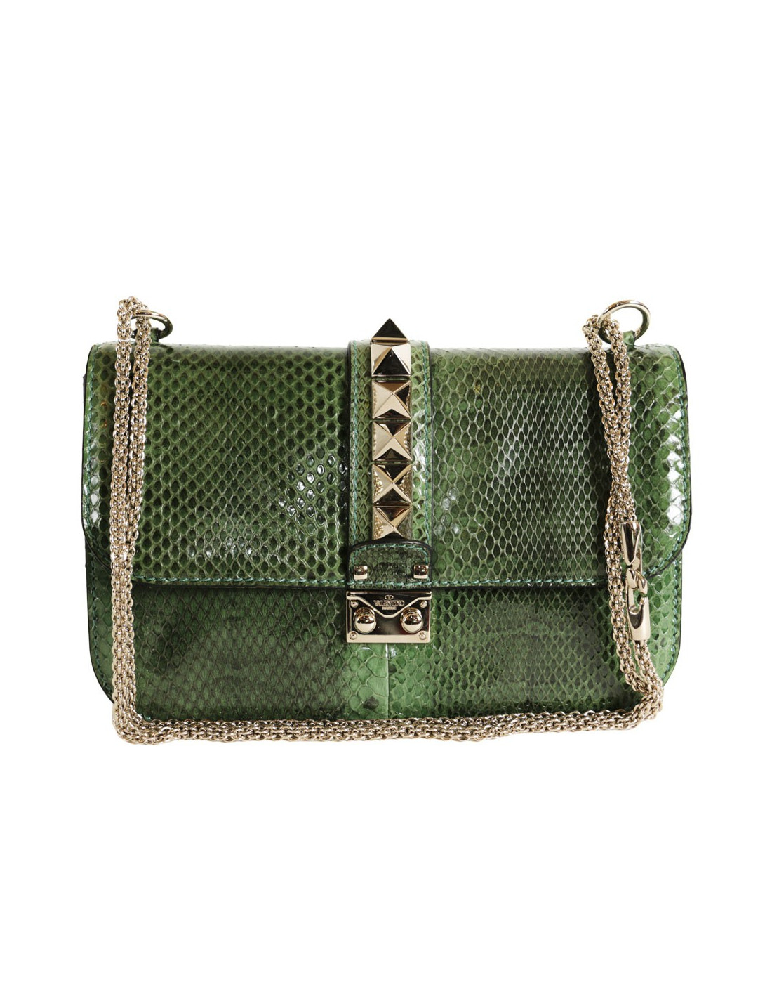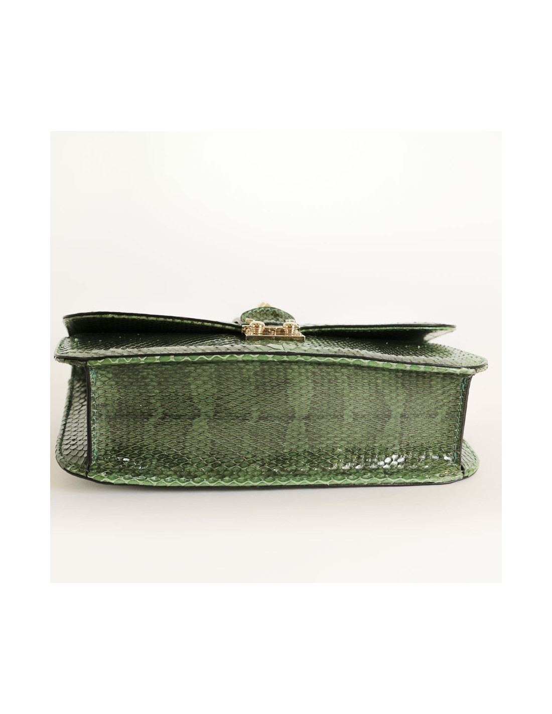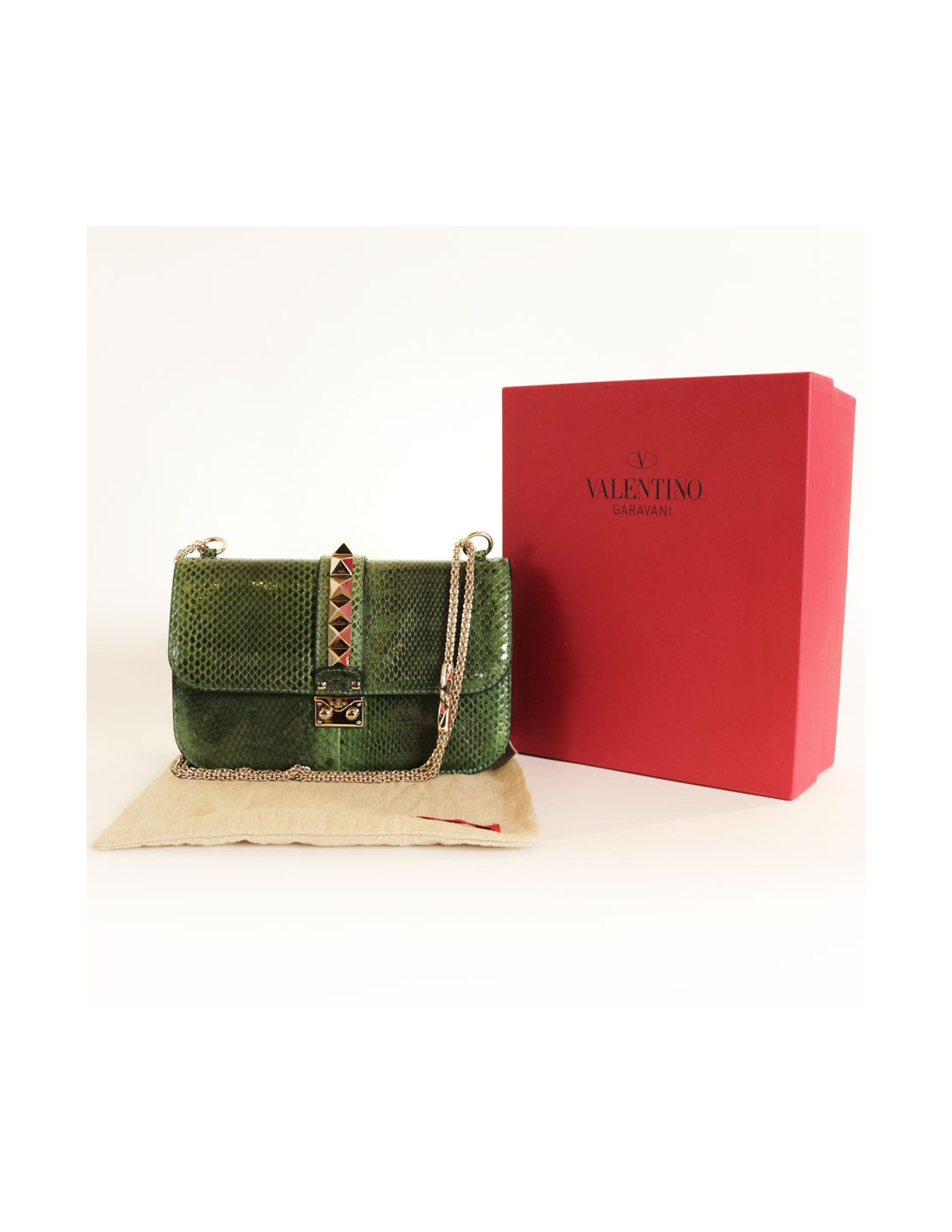 Iconique sac "Vavavoom" VALENTINO GARAVANI, en python vert gazon et attributs or pâle. L'intérieur est en toile beige, avec 3 poches dont une zippée. Il est en parfait état. Il se porte à l'épaule et en bandoulière grâce à sa jolie chaîne tressée qui se termine par 2 mousquetons.