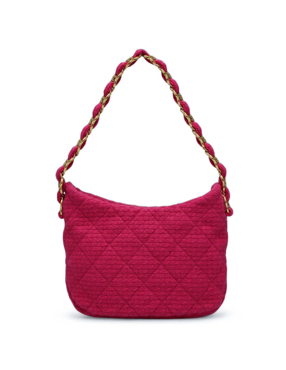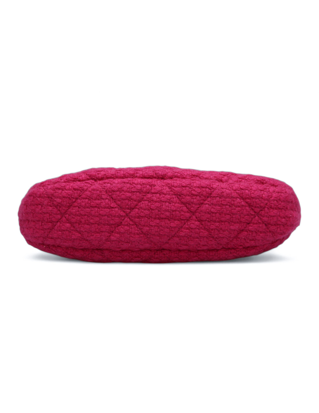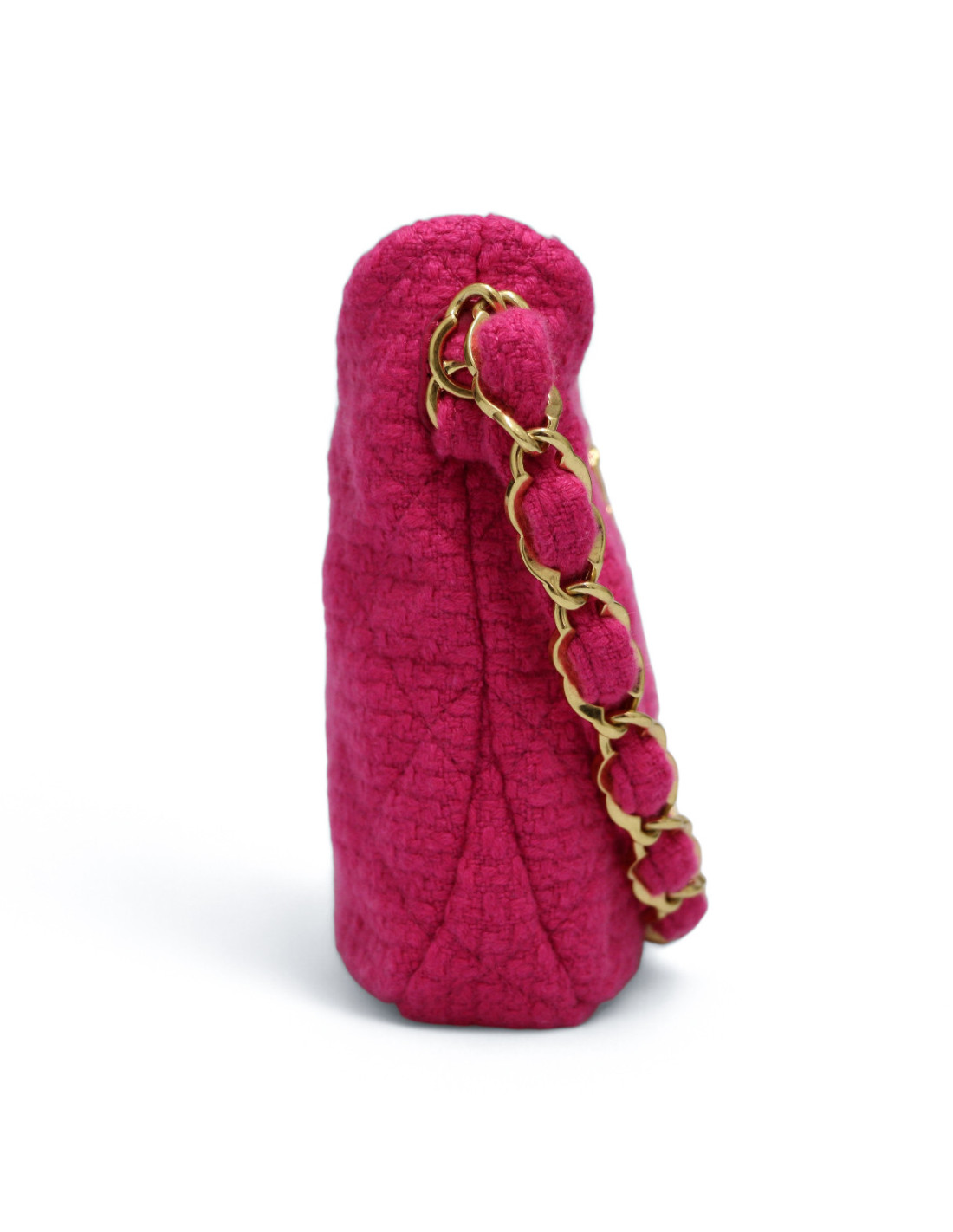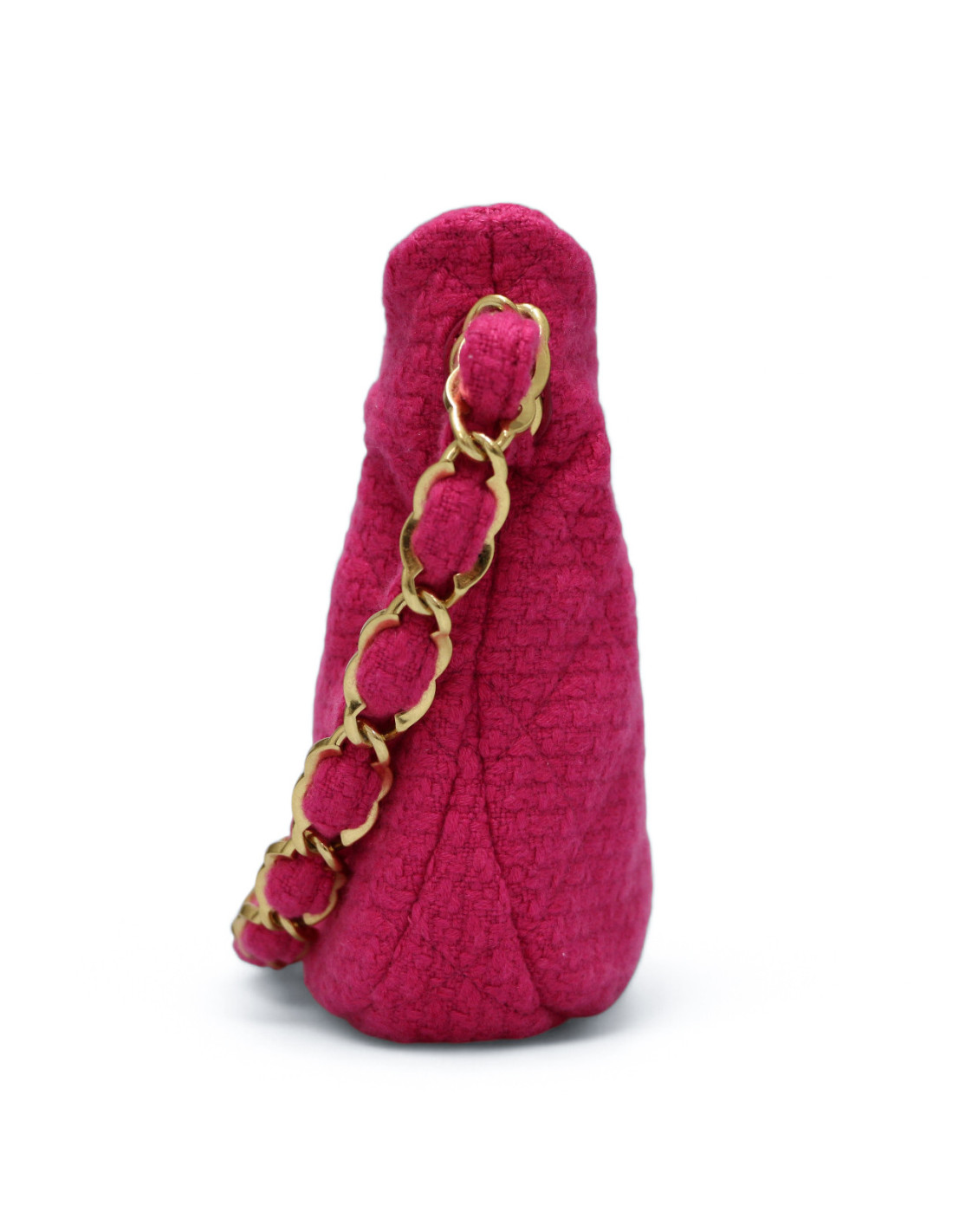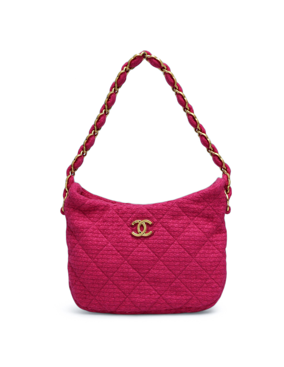 Détails : logo CC en métal doré entrelacé de tweed formant la anse du sac. Grande poche et petite poche plaquée