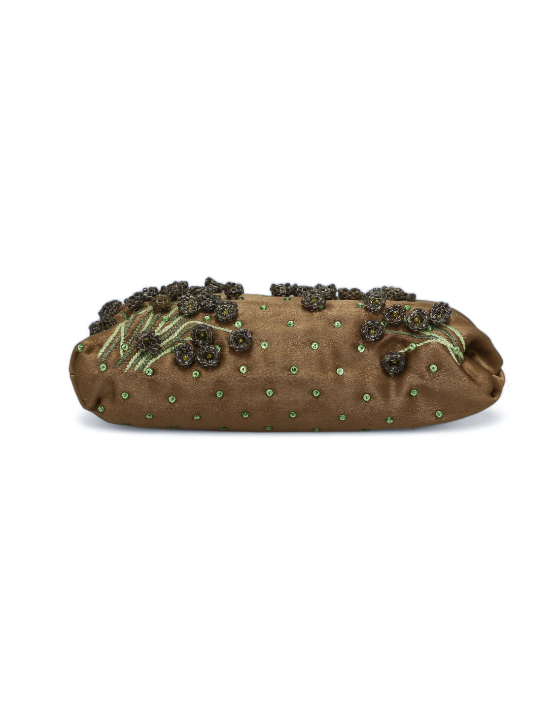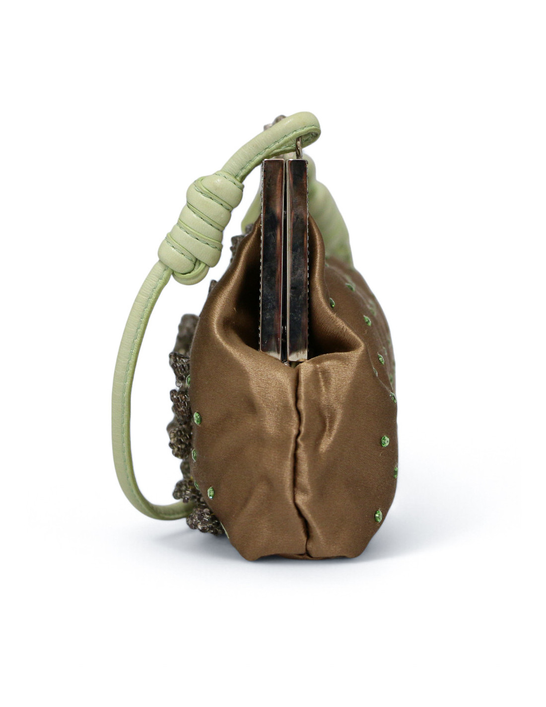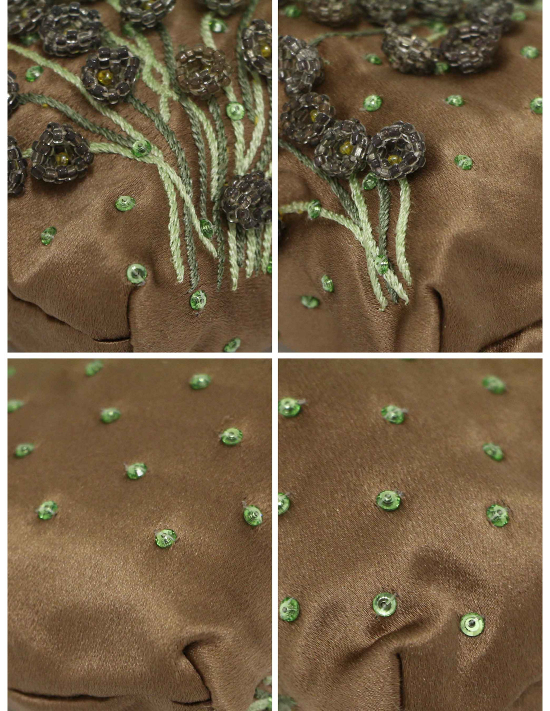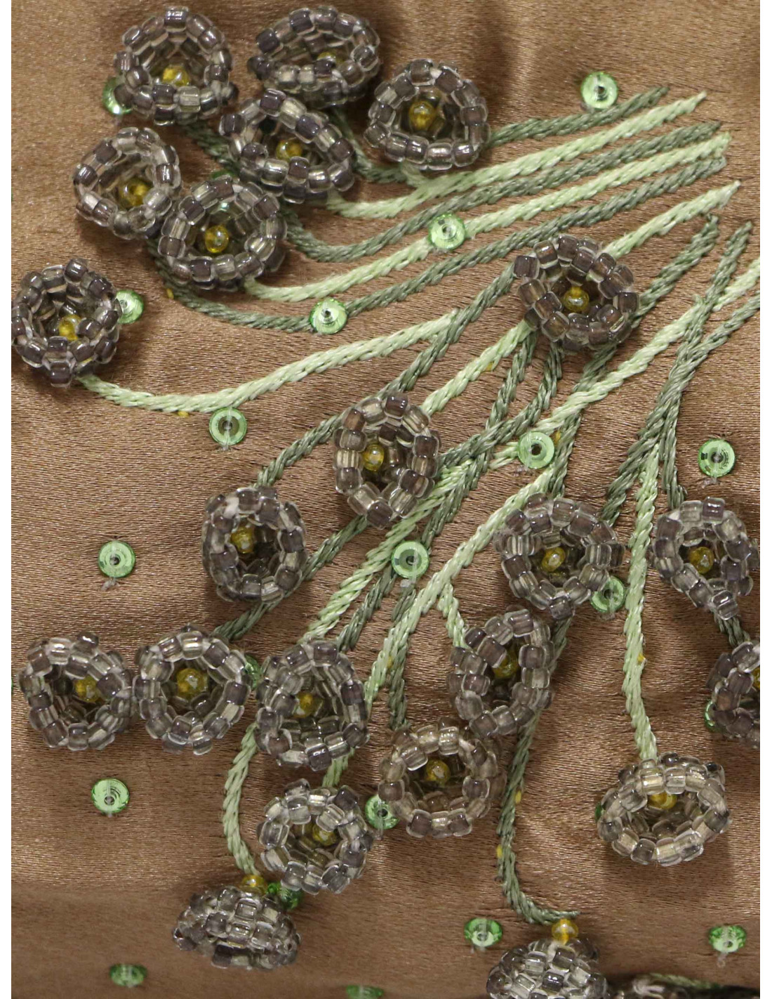 Détails : fleurs avec pétales en petites perles brodées, cristaux verts