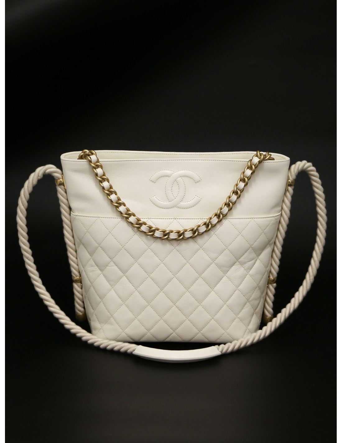 Détails : sac en cuir de veau effet froissé pouvant se porter de deux manières, en bandoulière avec sa sangle en corde ou à l'épaule avec son anse en métal entrelassé de cuir. Il offre un grand espace de rangement agrémenté d'une poche zippée. Fermeture du sac par une fermeture à glissière et à l'arrière une poche plate fermée par un bouton aimanté. A l'avant un CC est embossé sur le cuir. Aucune usure