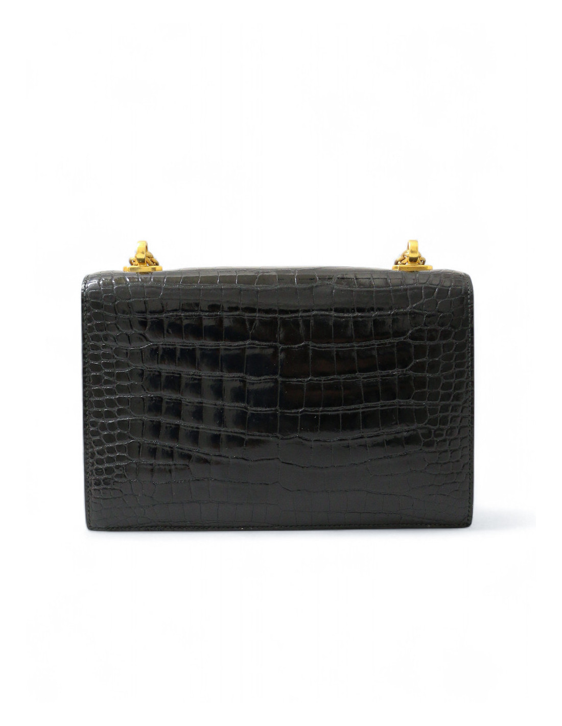 Détails : sac à rabat Hermes en crocodile porosus vintage doté d'un compartiment de rangement principal comprenant une poche zippée et une plate. A l'avant du sac un second espace plus fin avec également une poche plate. Fermeture par un fermoir à bascule. La bandoulière en métal guilloché apporte une touche sophistiquée. Aucune usure extérieur.