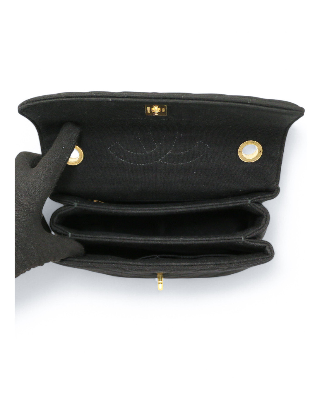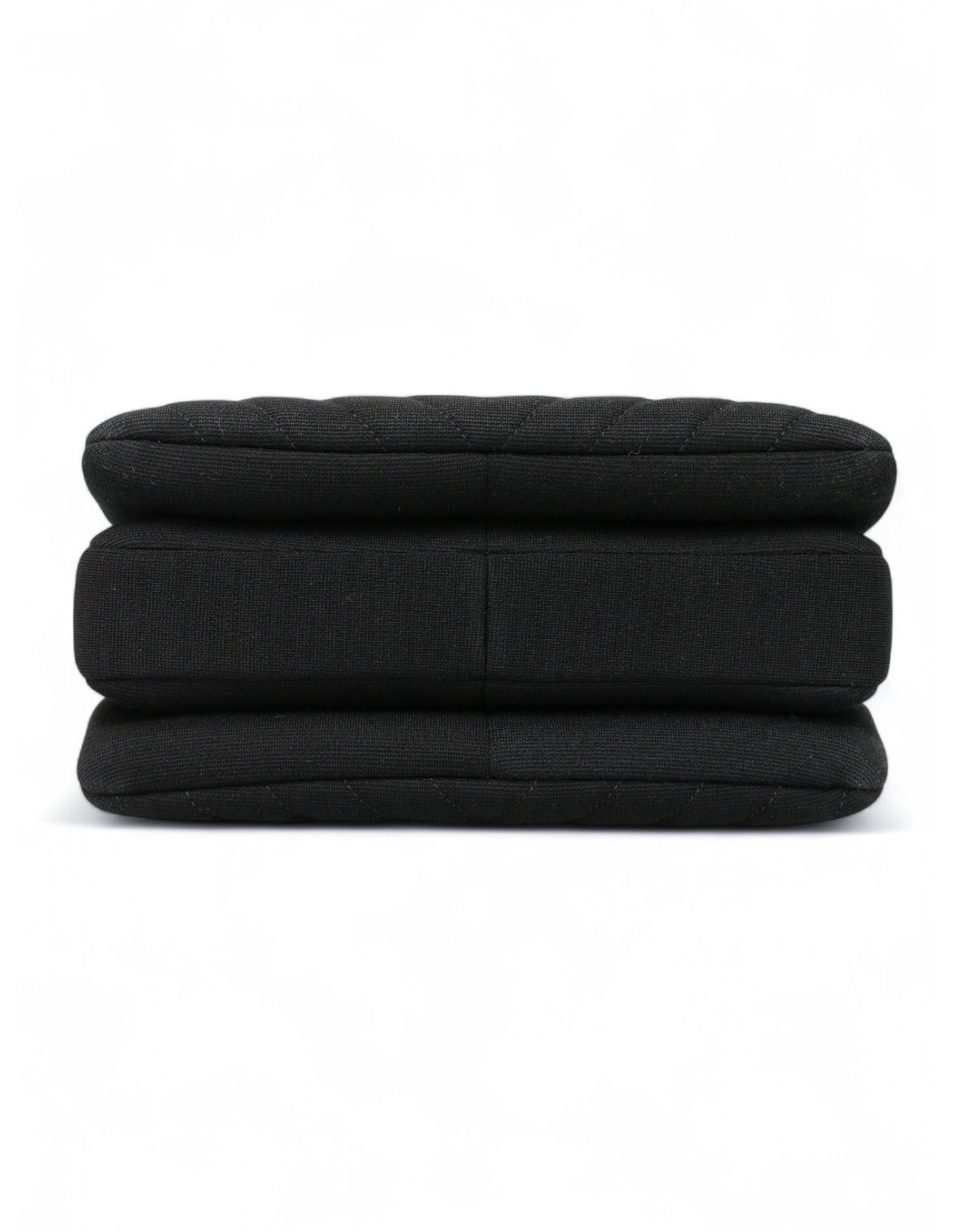 Détails : Grand sac à rabat Trendy de la Maison Chanel en jersey noir à motif chevron. Il est doté du fermoir iconique Turnlock en métal doré qui représente un double C entrelacé. Sur le dessus, une poignée est fixée à une plaque en métal gravée "C H A N E L". L’intérieur est doublé de tissu et on compte trois compartiments de rangement distincts dont un avec une pochette zippée. Une poche plaquée se trouve à l’arrière du sac. Il peut se porter à la main ou à l’épaule avec sa bandoulière amovible en métal doré entrelacé de cuir noir. Les coins sont en parfait état et l’ensemble du sac est dans un état proche du neuf.