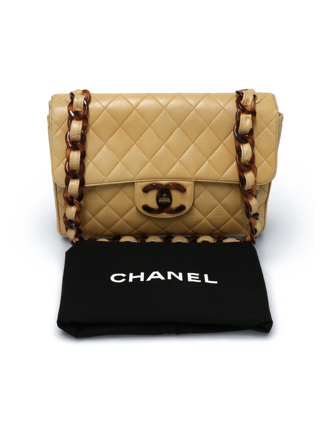 Élégant et intemporel, ce sac Chanel incarne le savoir-faire emblématique de la Maison. Confectionné en cuir matelassé beige, il se distingue par son iconique motif en losanges et son fermoir double C entrelacé. Sa chaîne en résine effet écaille, entrelacée de cuir, apporte une touche sophistiquée et audacieuse à ce modèle raffiné.