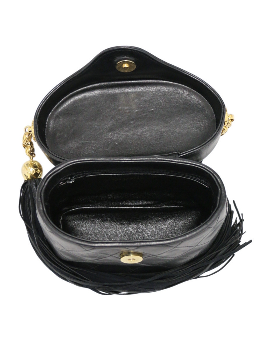 Sac Vanity rigide avec pompon Chanel en cuir d’agneau matelassé noir, au design structuré et intemporel. Ce modèle reprend les codes emblématiques de la maison avec le logo CC en relief sur le rabat, et un pompon en cuir signature dont les franges mesurent 31 cm, apportant du mouvement et du caractère. Il est équipé d’une chaîne bijoux Chanel dorée qui permet un porté polyvalent, à l’épaule ou en bandoulière, combinant élégance et confort. La structure compacte du sac, avec ses dimensions de 16 x 12 x 8,5 cm, permet de transporter l’essentiel tout en restant chic et pratique. Présenté en excellent état, ce sac Vanity rigide conserve une belle tenue générale et représente une pièce recherchée, à la fois facile à porter et à associer à différents styles, du quotidien aux soirées.