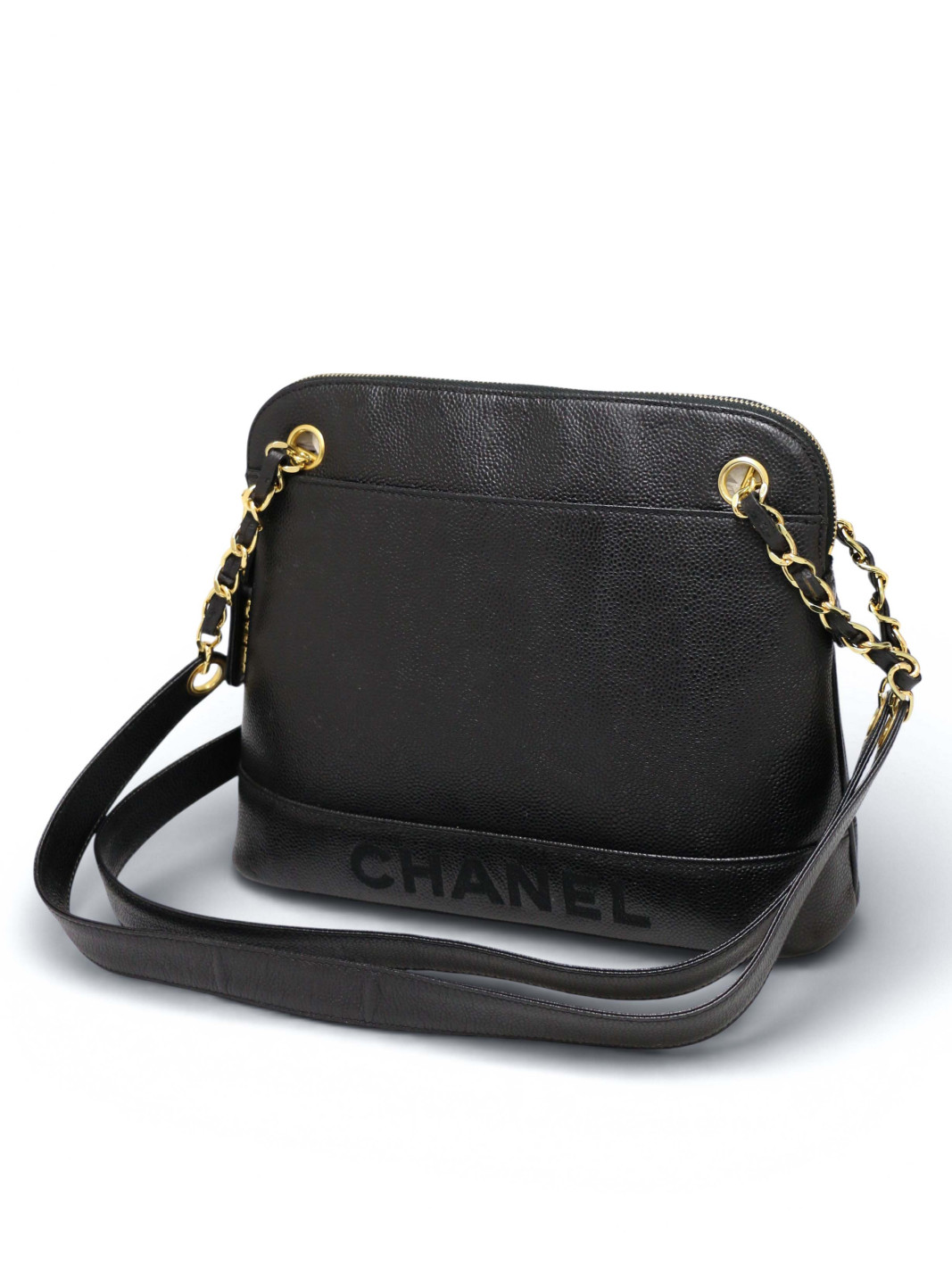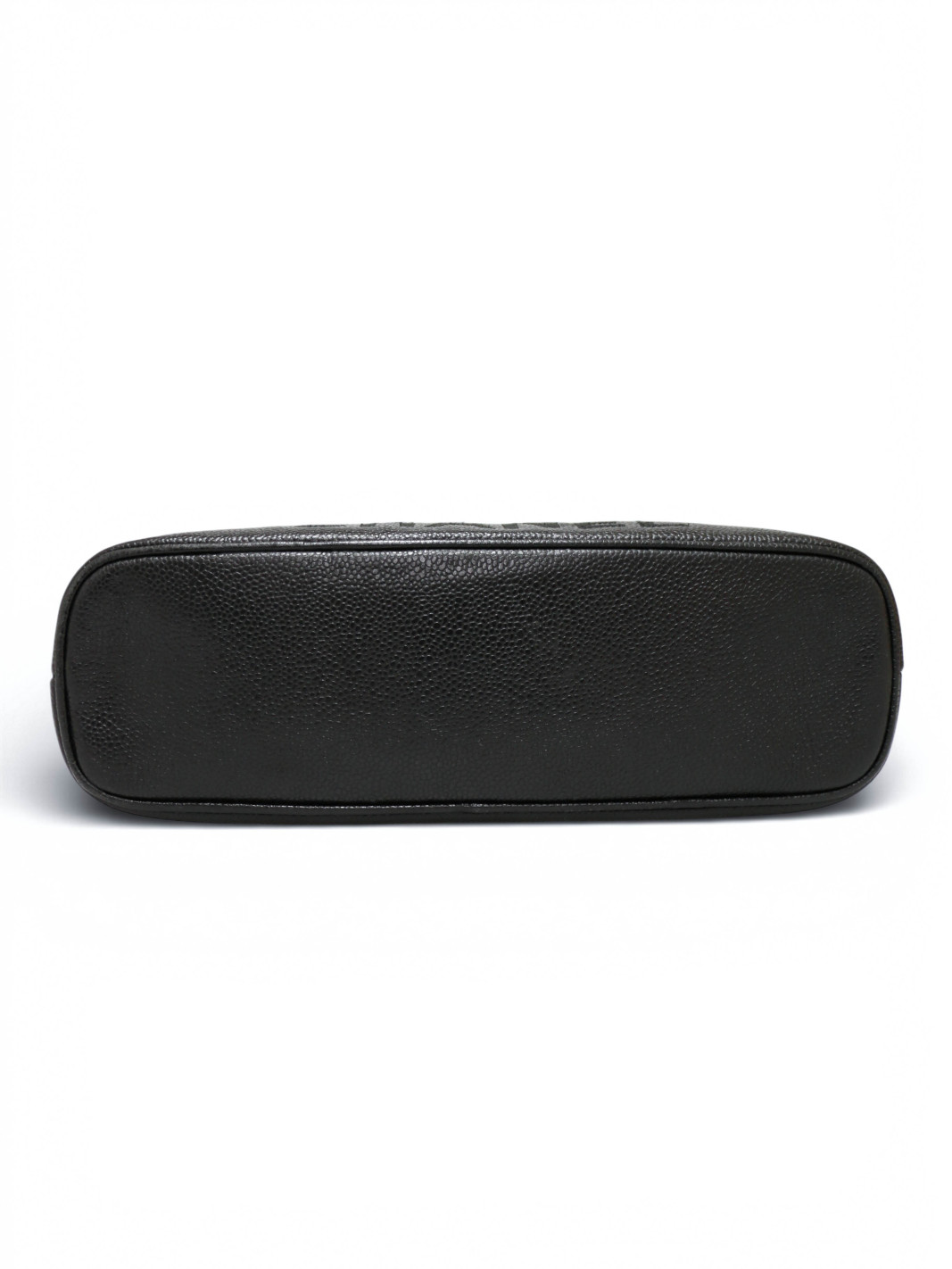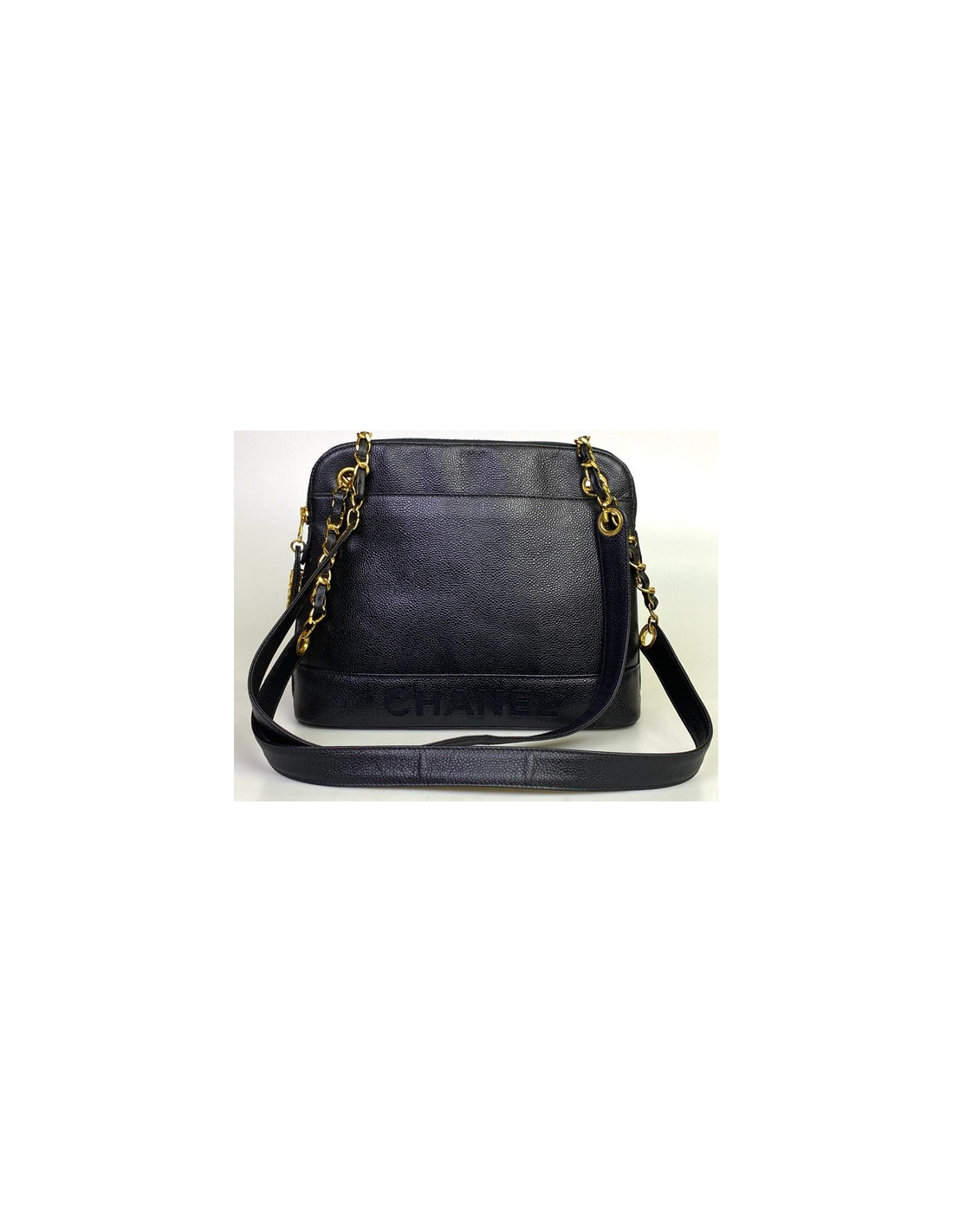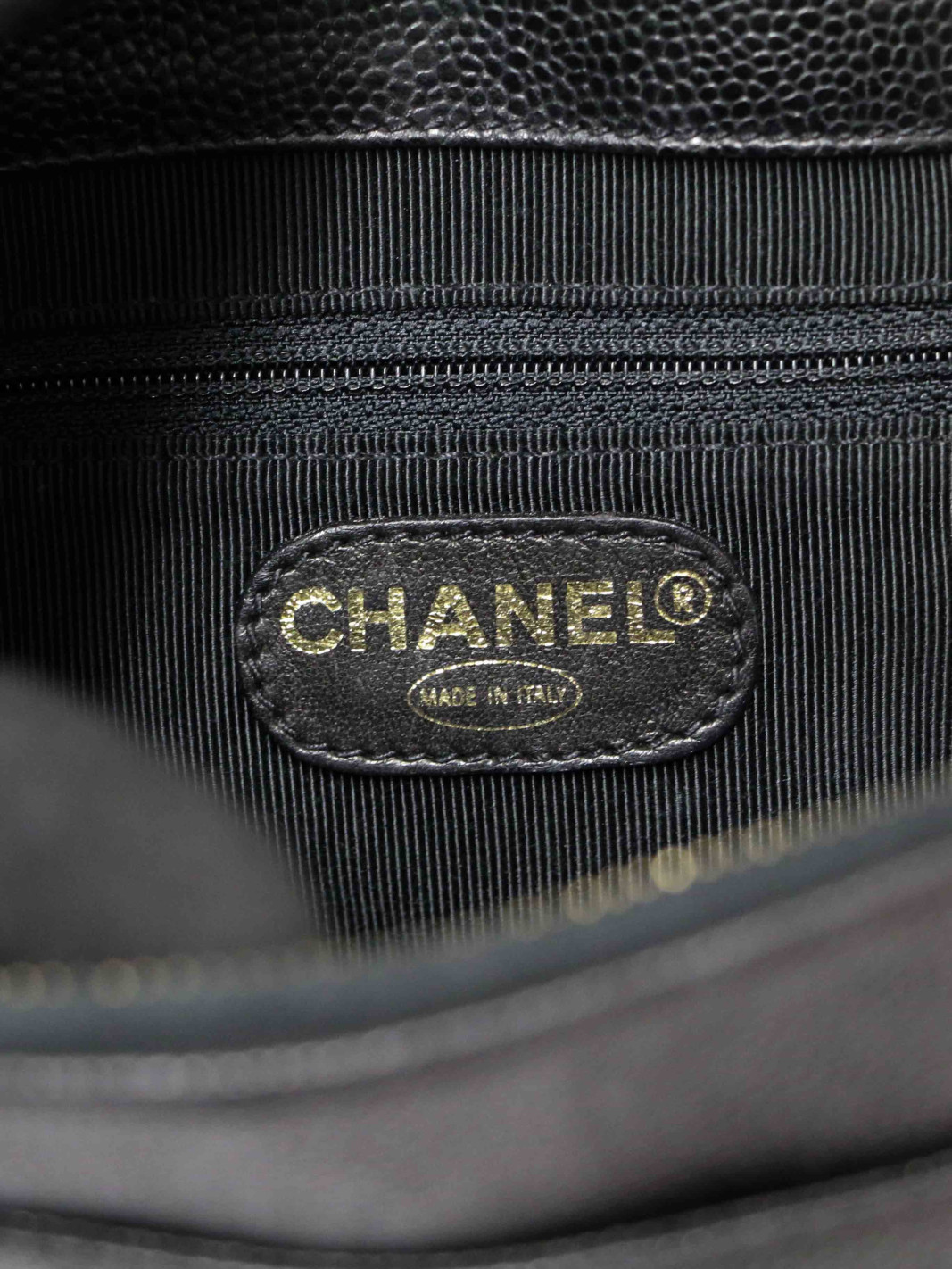 Sac Chanel vintage en cuir caviar noir, à la fois résistant et élégant. "CHANEL" est discrètement gaufré sur le devant en tissu noir, apportant une signature sobre et raffinée.