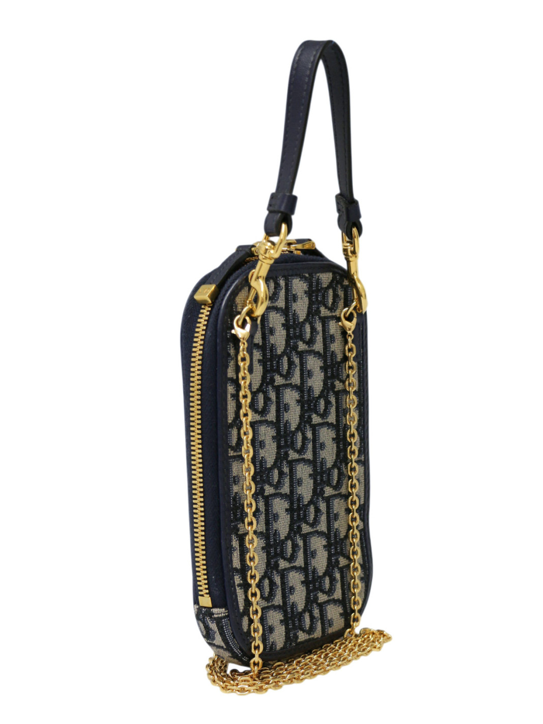Superbe étui pour téléphone Call'in Dior 30 Montaigne. Confectionné en toile jacquard Dior Oblique bleu et beige, cet accessoire reflète parfaitement le style intemporel de la Maison. Son format compact est équipé d’une double fermeture zippée sécurisée, mise en valeur par le logo "CD" en métal doré, signature emblématique de la ligne 30 Montaigne. Pratique au quotidien, il dispose d’une anse supérieure amovible en cuir bleu marine ainsi que d’une fine chaîne dorée, permettant de le porter à la main, à l’épaule ou en bandoulière selon vos envies. L'intérieur est en toile bleu marine et comporte un grand espace de rangement pour le téléphone ainsi que trois fentes pour cartes. Il est livré avec son livret explicatif.