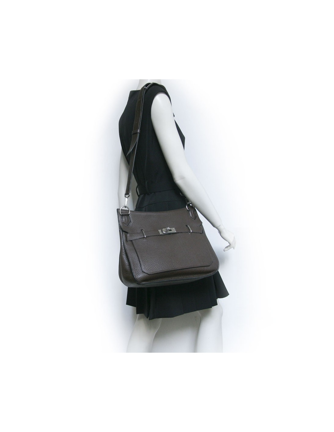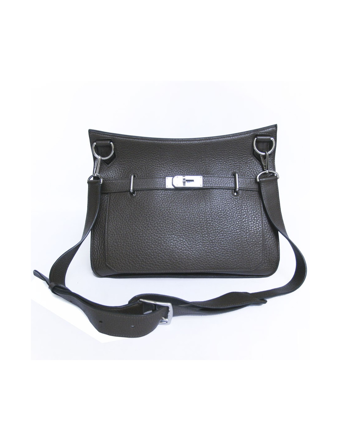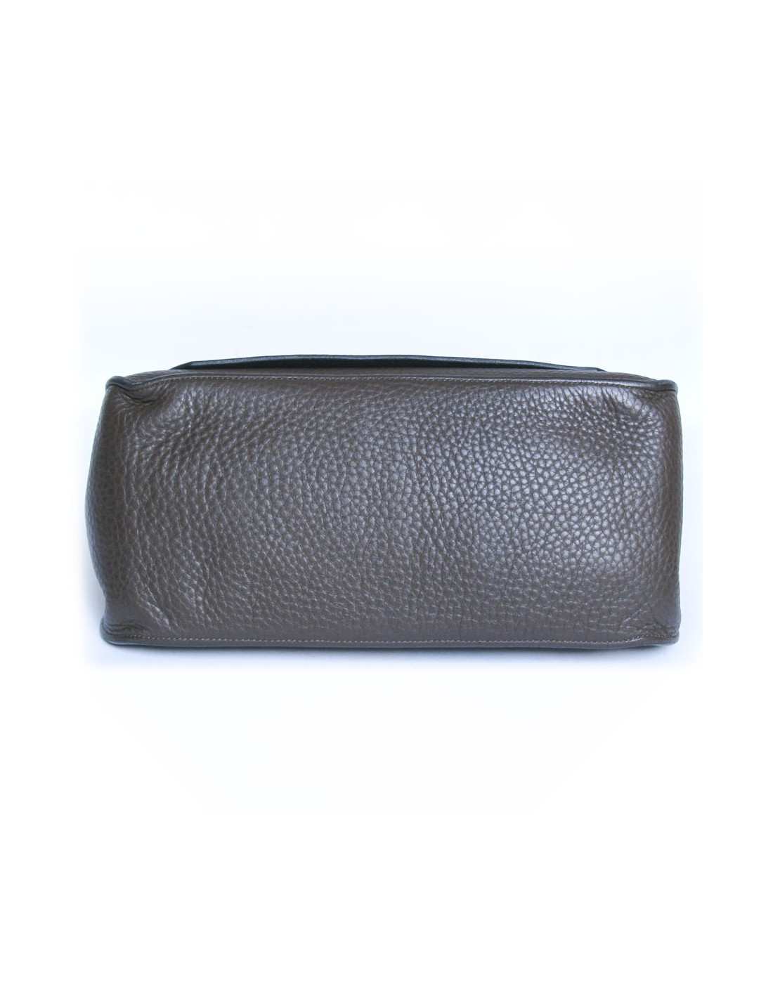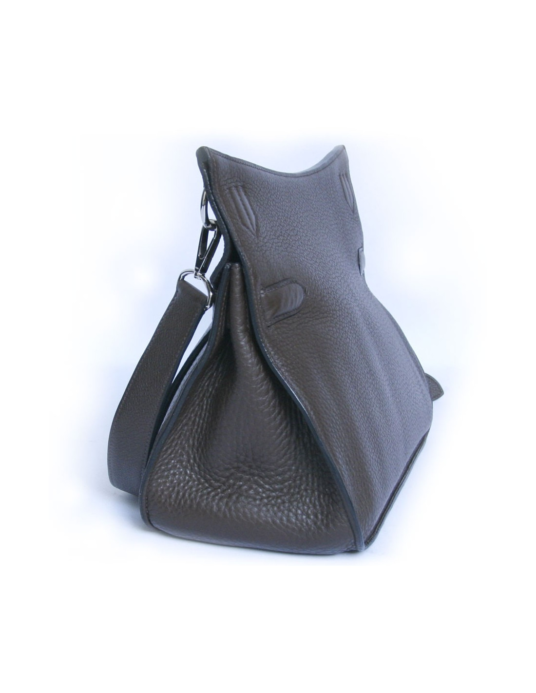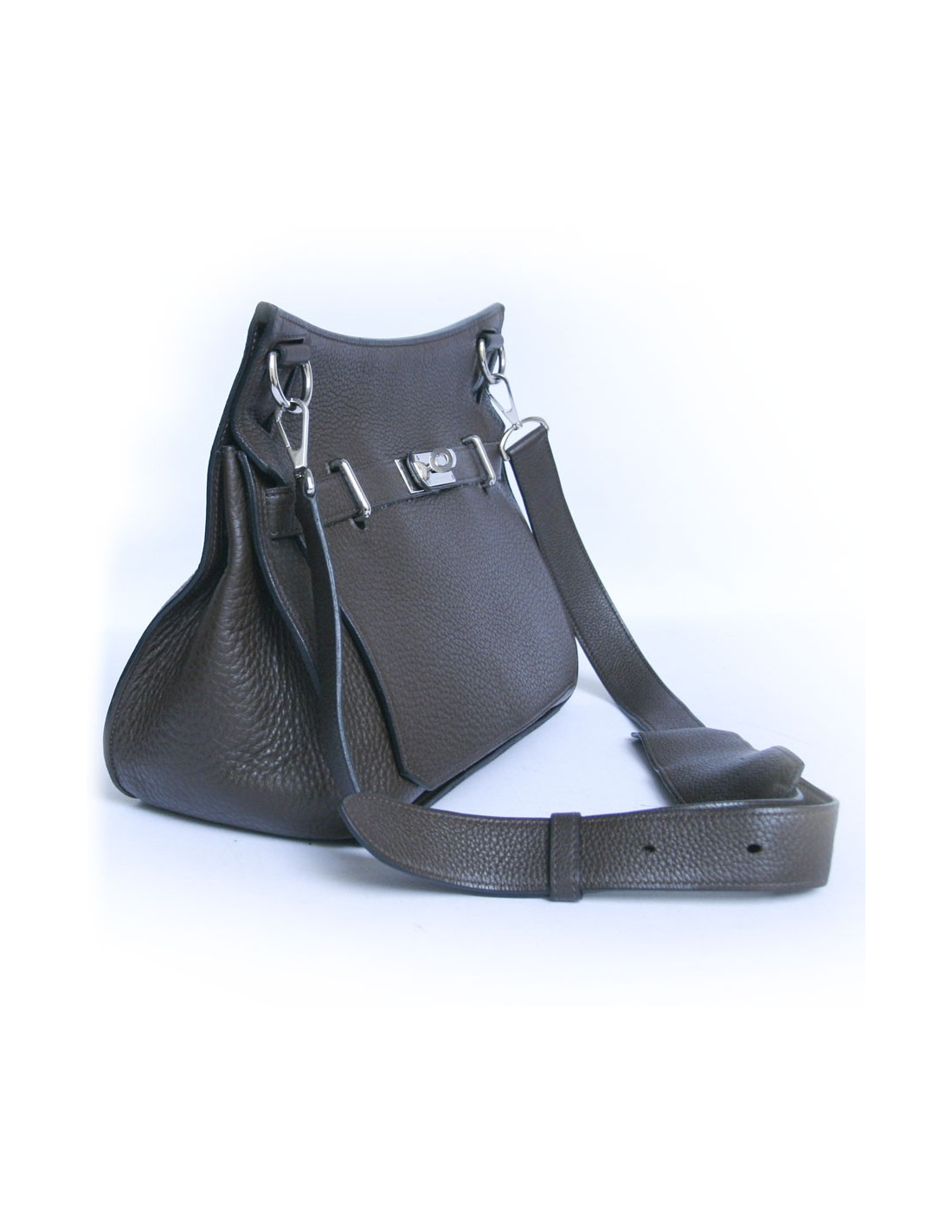 Cette besace est en taurillon clémence marron avec les finitions et la boucle en métal argenté palladié.