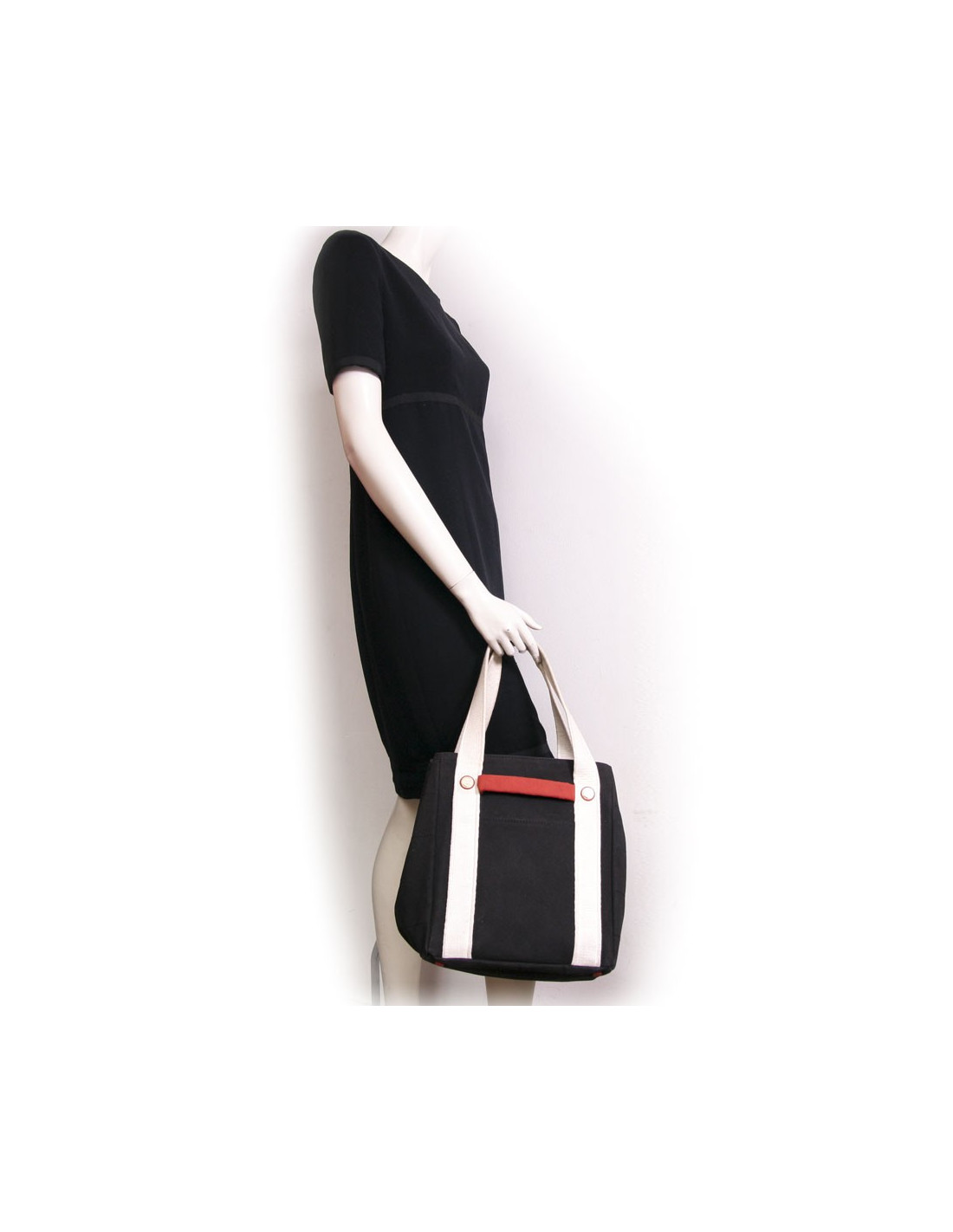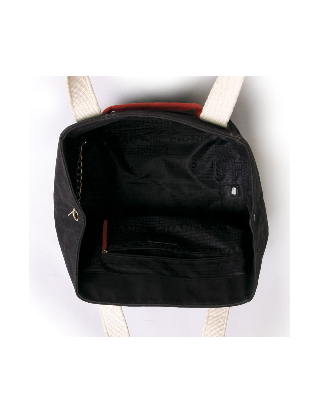 Ce sac en toile d'occasion CHANEL est en toile noire, blanc et rouge. Il est très pratique. Il dispose d'un grand espace de rangement pour y glisser tout vos accessoires. Il a une double poignée blanche. La doublure est en toile monogramme noire avec une grande poche zippée. Une petite chaine au milieu du sac lui permet de se fermer. Il a une poche plate sur l'avant du sac. Quatre clous de couleur rouge sous le sac. Il est en bonne condition, des traces d'usures d'usage sont visibles sous les coins du sac (mais très peu visible).