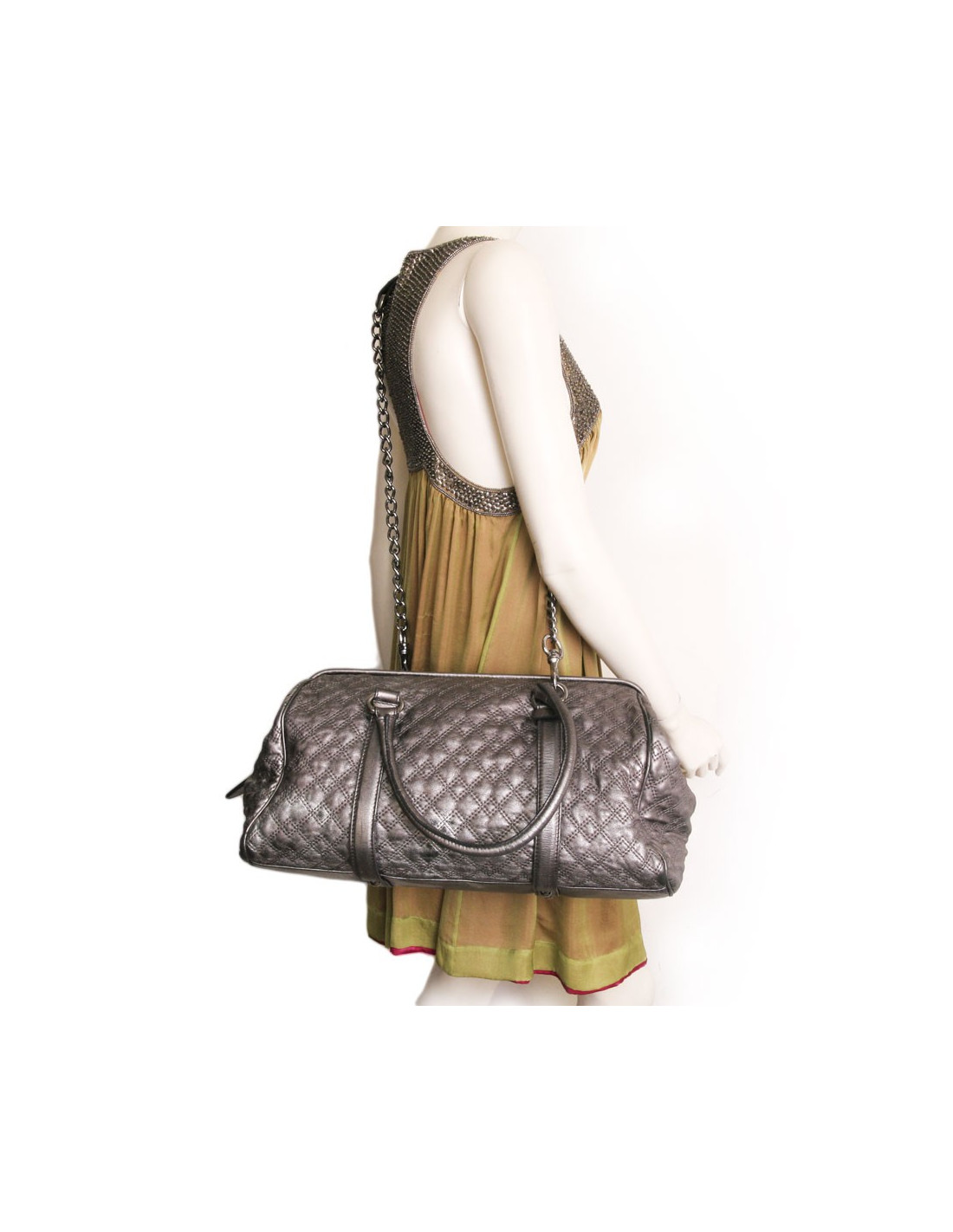 ll se porte au bras ou à l'épaule grâce à sa bandoulière en chaîne amovible de 123 cm. Elle est surmontée d'une pièce de cuir pour plus de confort lorsque porté. Le sac est large et souple, pour une grande capacité de contenu et sa fermeture est cousue sur une base rigide de manière à optimiser la forme du sac. L'intérieur en toile noire contient une poche zippée. Le cuir est très légèrement usé sur la partie inférieure du sac (voir photo), ne se remarque pas lorsque porté.